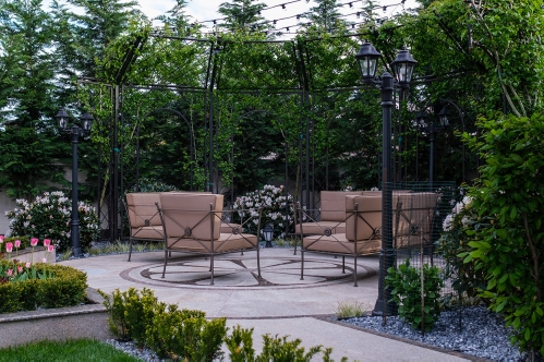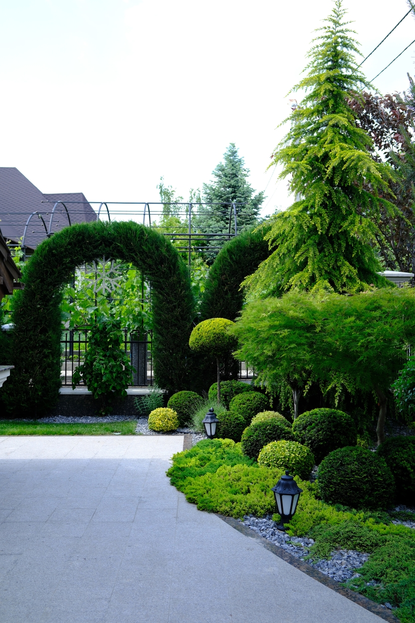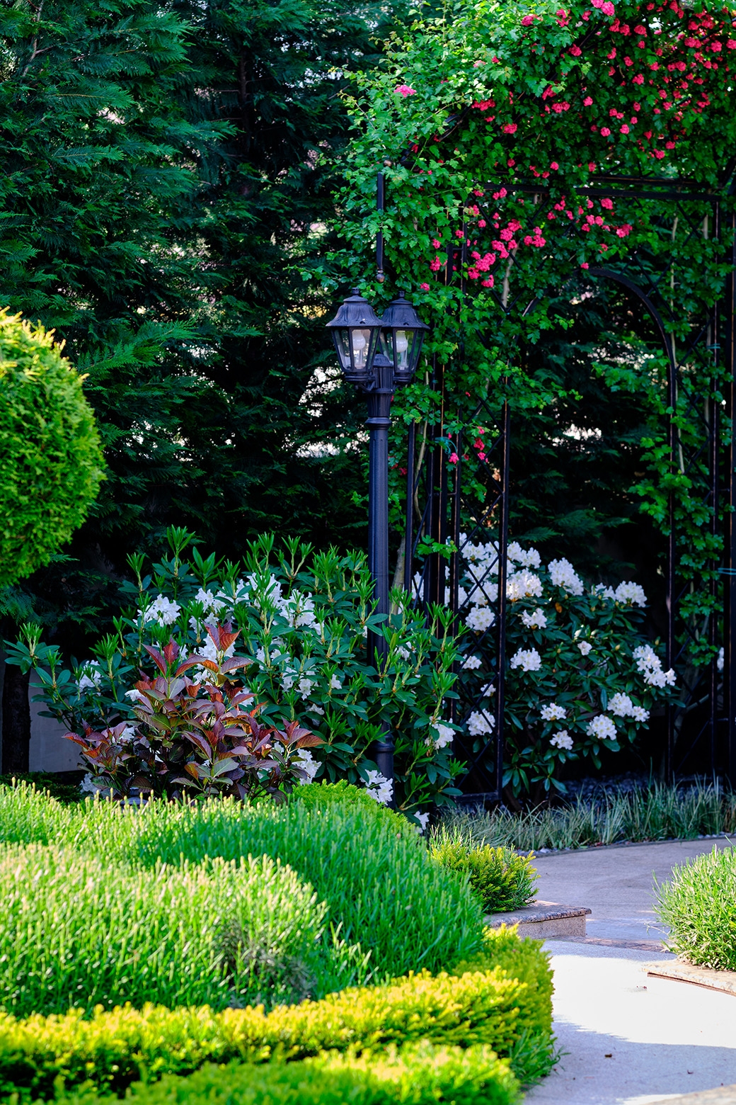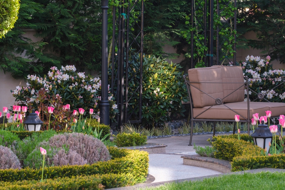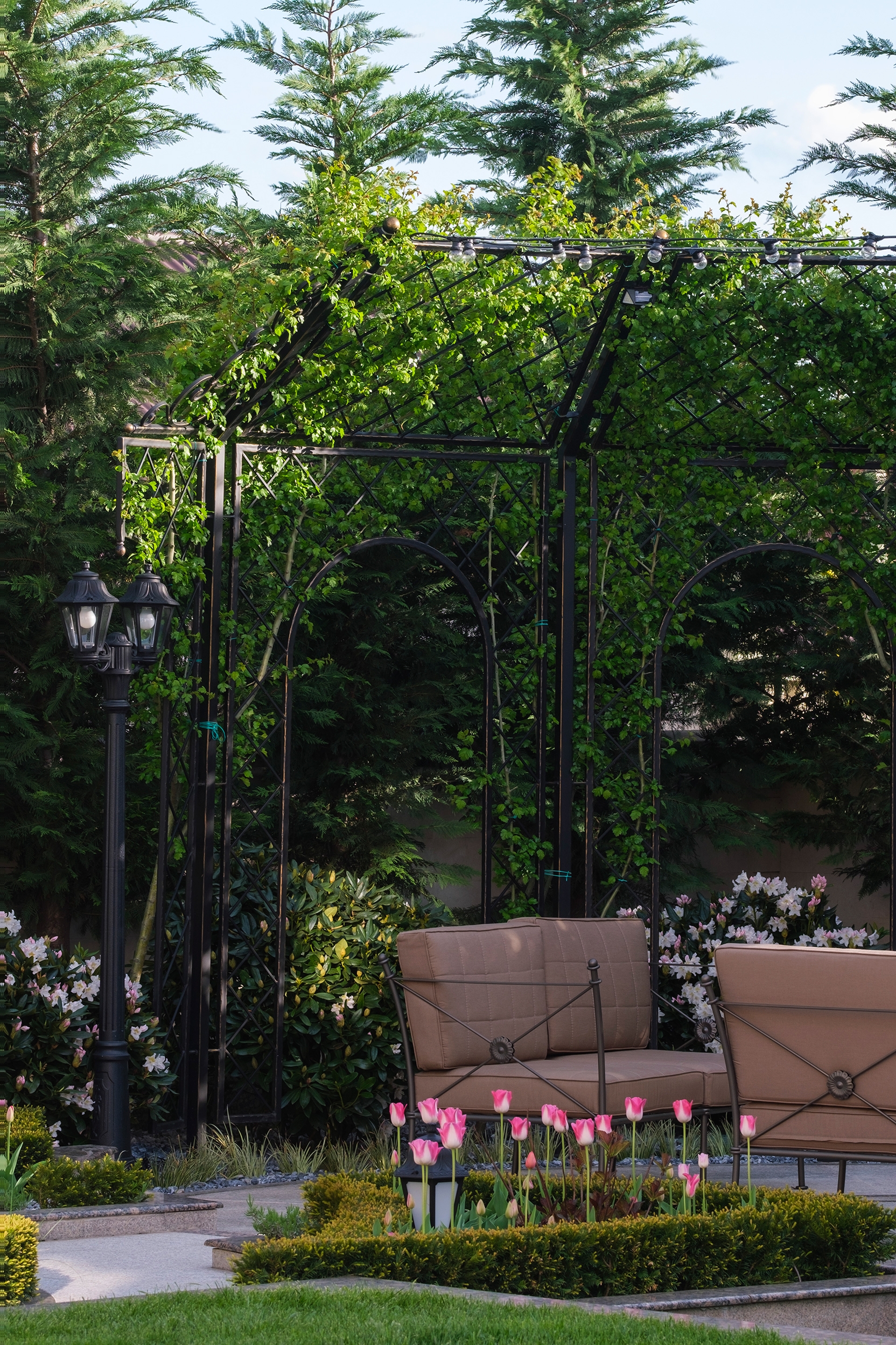 At the heart of this intimate garden lies a carefully structured parterre, framed with clipped evergreen hedges and softened by naturalistic waves of lavender and tulips. An architectural metal pergola anchors the composition, guiding Crataegus upward while casting rhythmic shadows along the curved stone path. Comfortable seating invites pause and reflection, nestled in a cocoon of rhododendrons, taxus, and mature evergreens that offer privacy and timelessness.