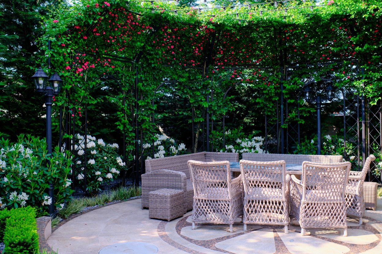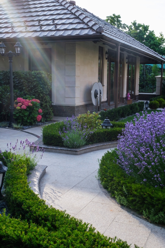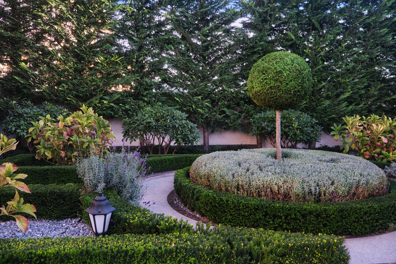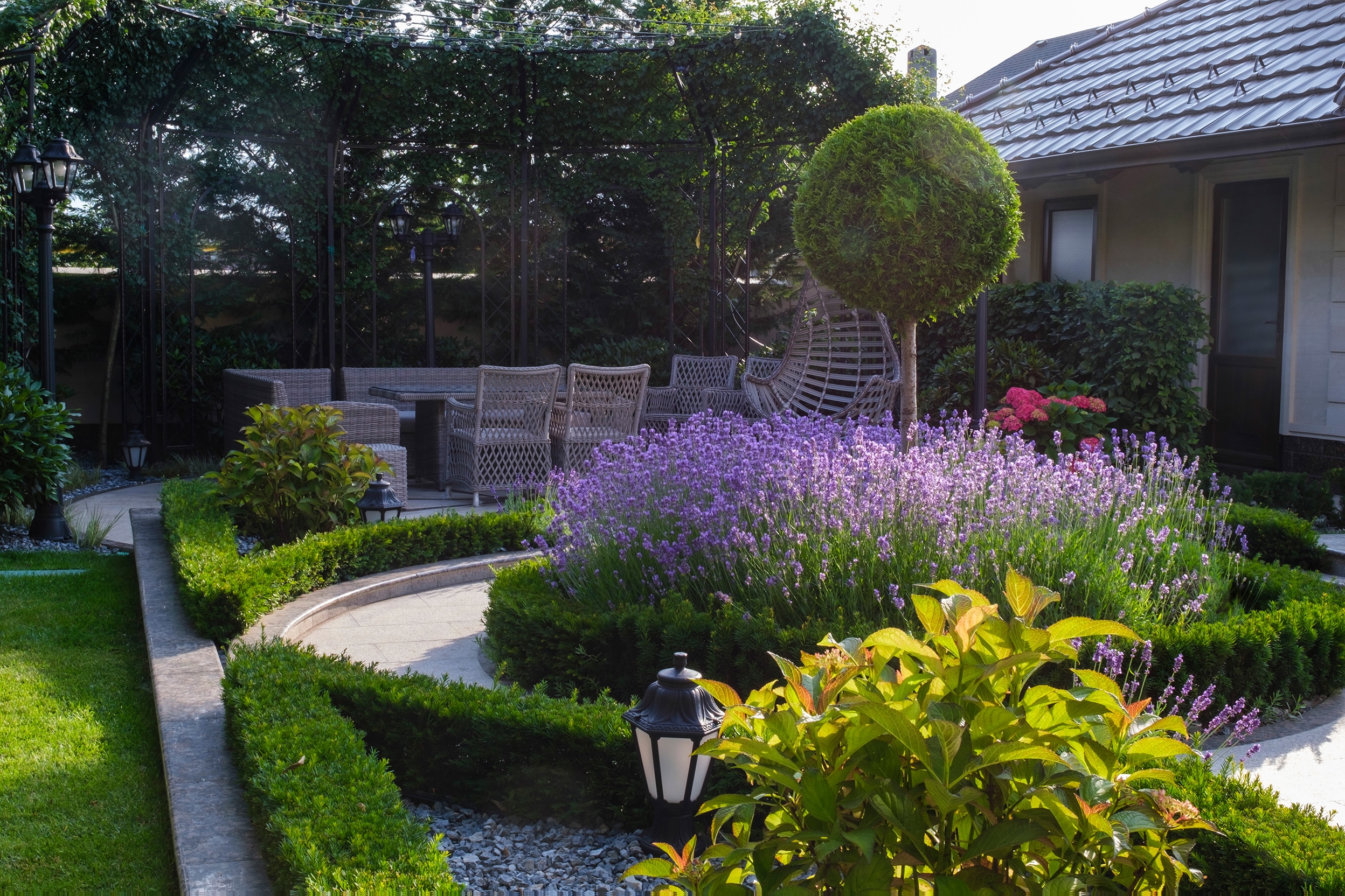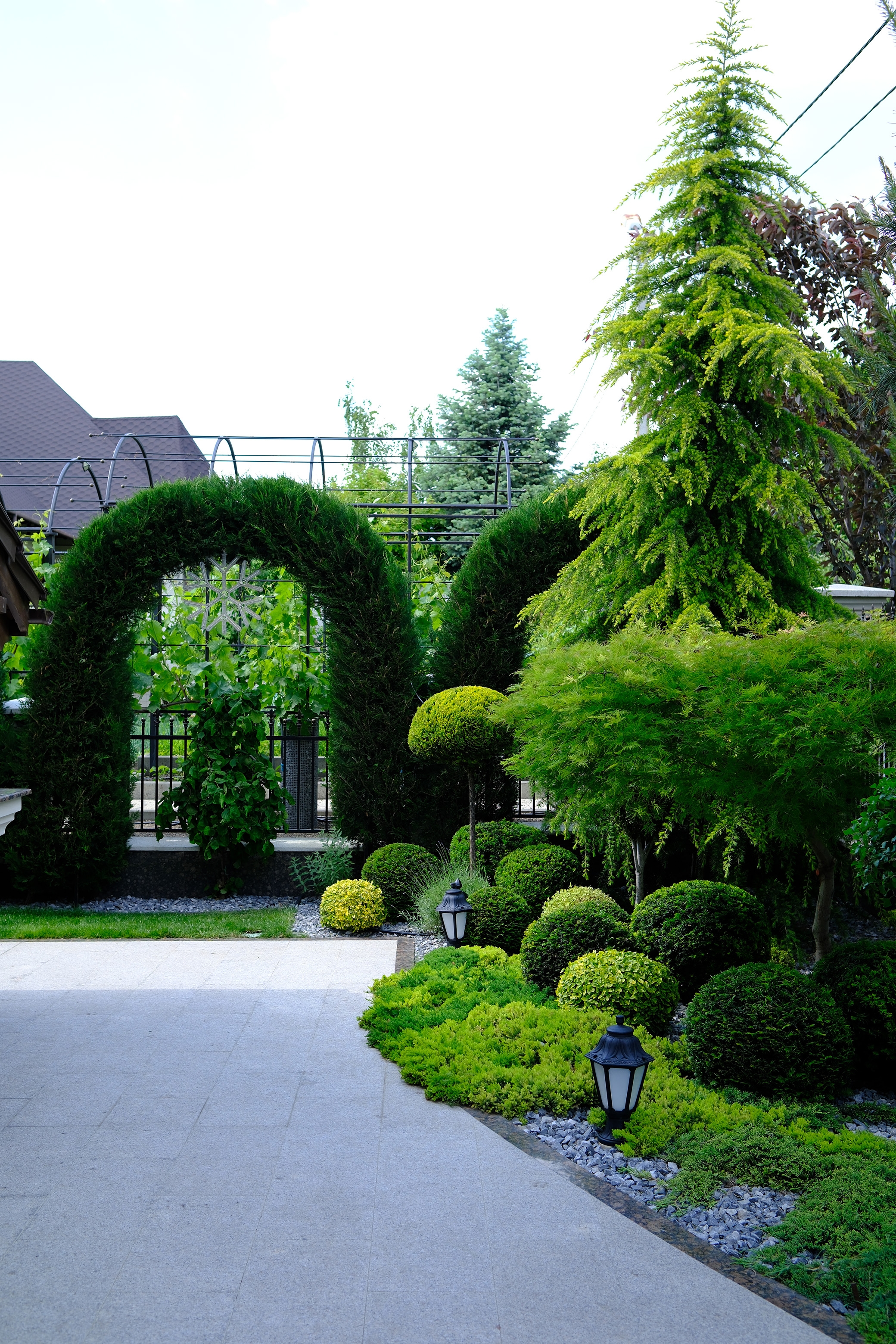 At the heart of this intimate garden lies a carefully structured parterre, framed with clipped evergreen hedges and softened by naturalistic waves of lavender and tulips. An architectural metal pergola anchors the composition, guiding Crataegus upward while casting rhythmic shadows along the curved stone path. Comfortable seating invites pause and reflection, nestled in a cocoon of rhododendrons, taxus, and mature evergreens that offer privacy and timelessness.