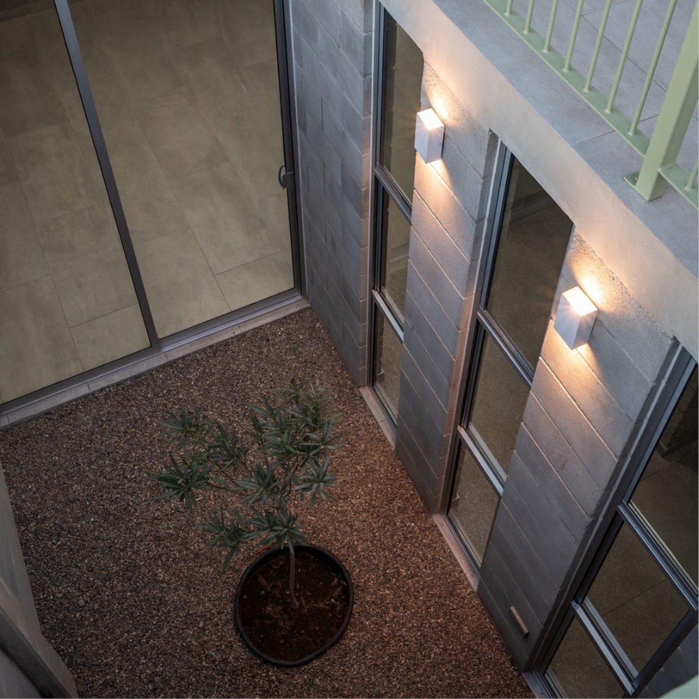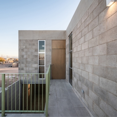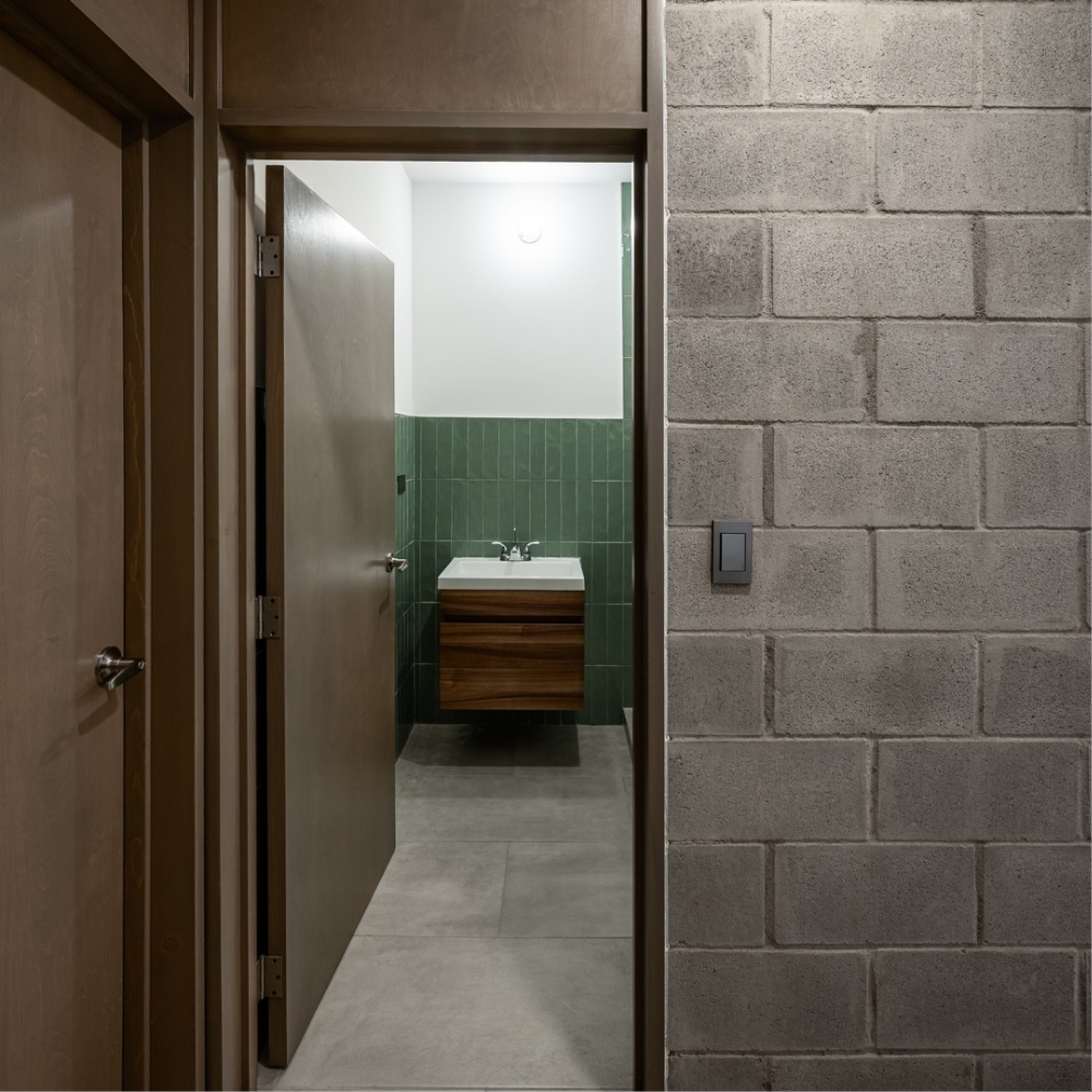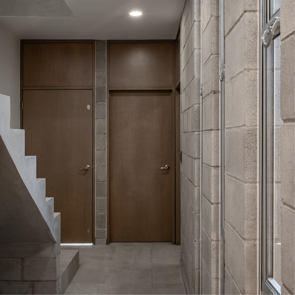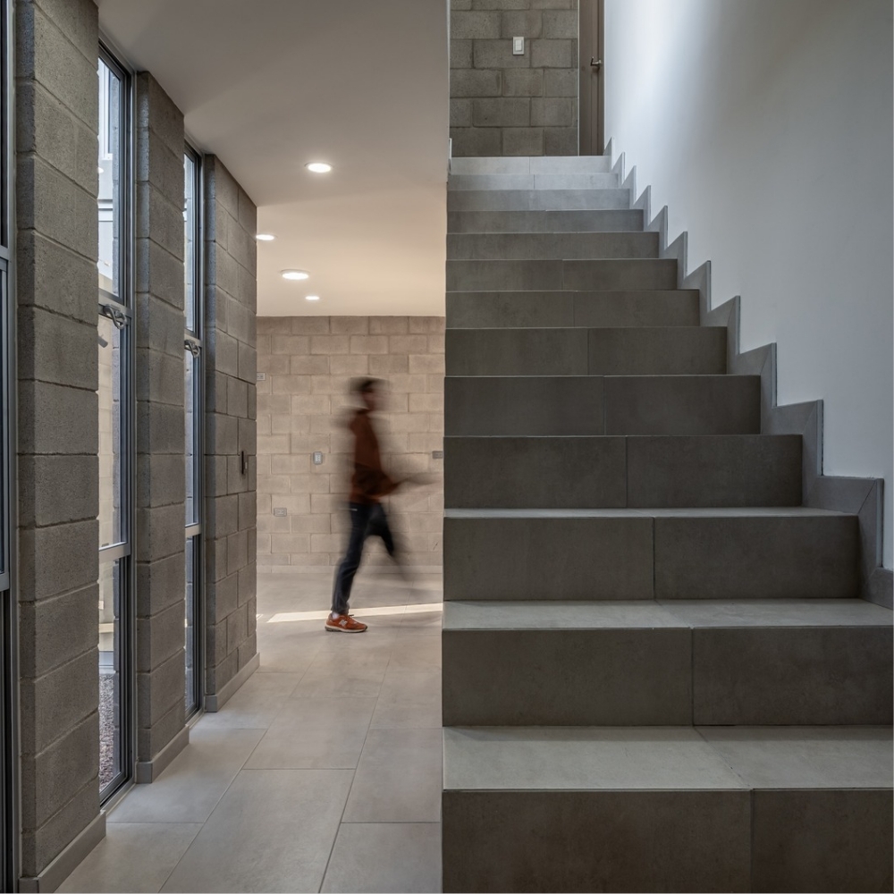 To adapt to financial limitations, the design predominantly features exposed concrete block walls, minimizing the use of finishes and plaster.