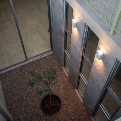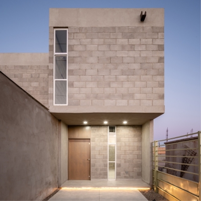 The plot on which the house is built has an orthogonal configuration and naturally integrates with the construction of the owners’ business. The house’s layout is organized around a small central patio, which serves as the heart of the project by providing ventilation and natural lighting to both private and common areas.