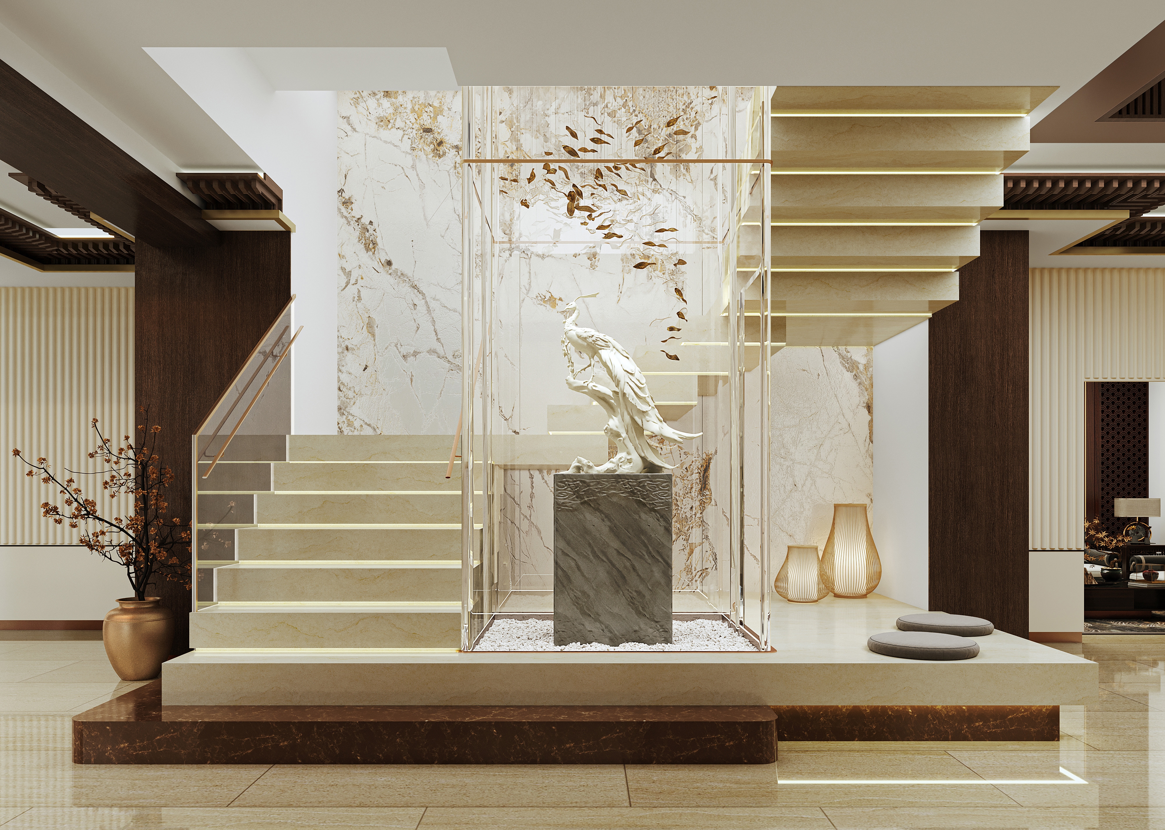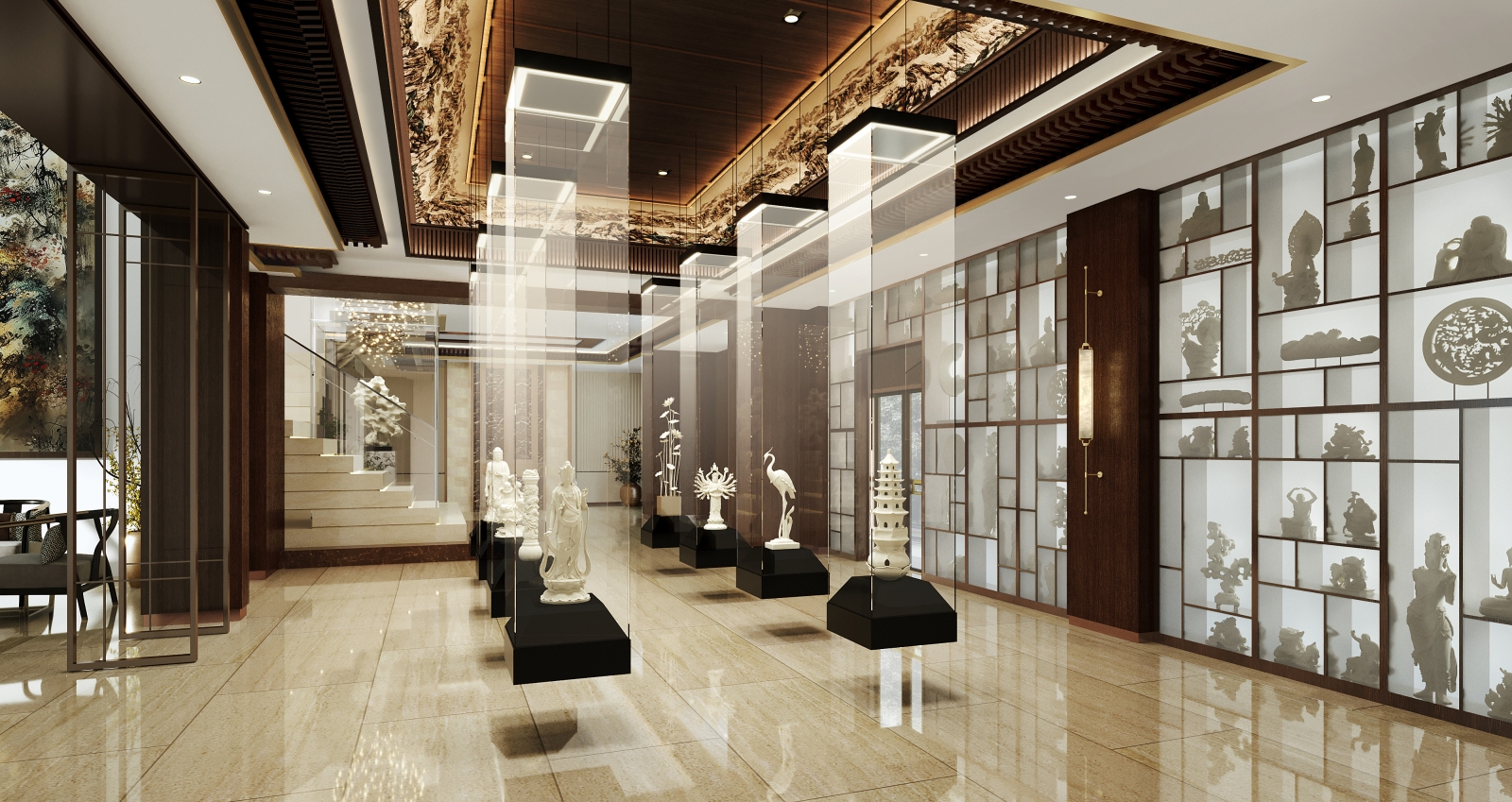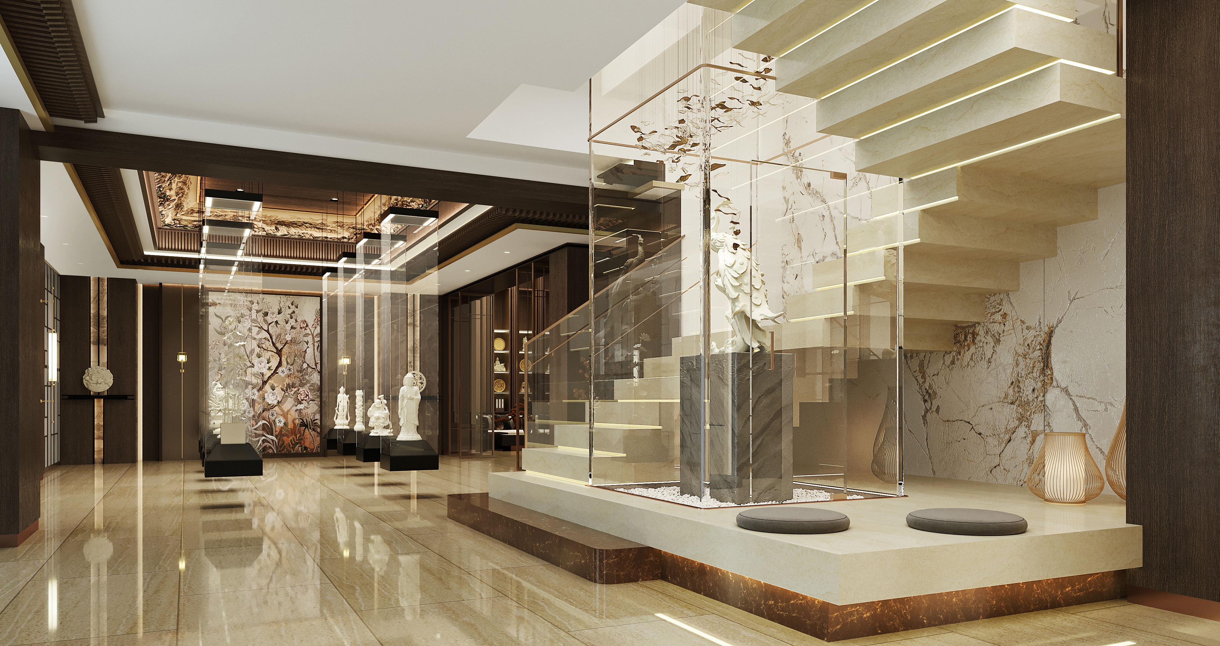 Visitor experience is central. Floating staircases and layered lighting guide circulation through shifting perspectives, encouraging exploration rather than linear movement. Glass display walls with integrated backlighting preserve fragile carvings while presenting them as luminous focal points. Shadow-puppet-inspired partitions and sculptural reflections animate exhibits, turning each viewing into a dynamic “discovery moment.”