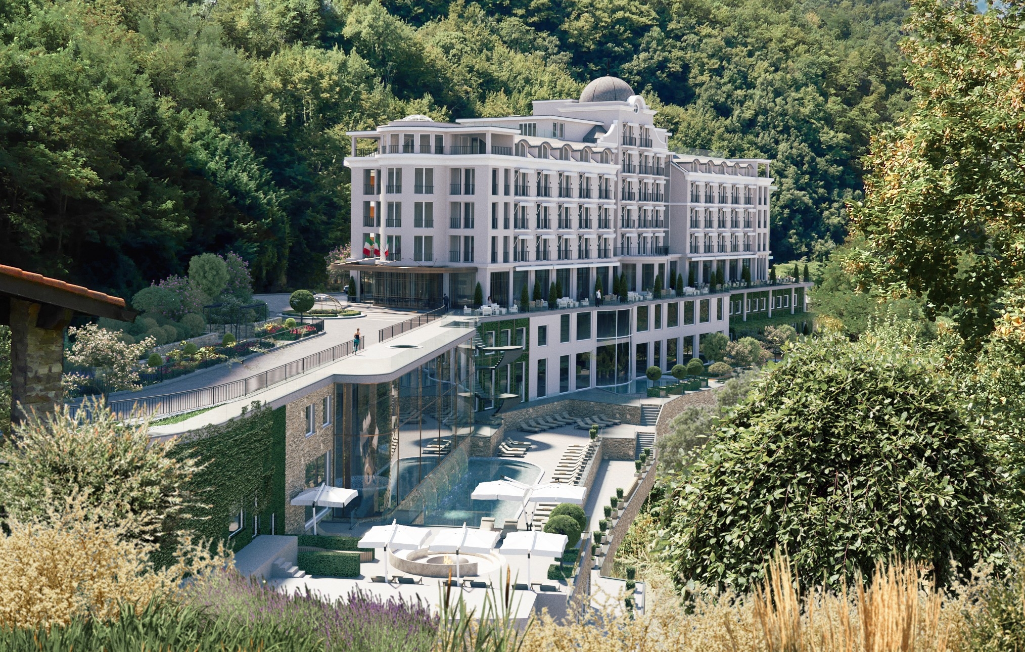 Grand Hotel Pigna is a renovation of a former spa hotel into a contemporary wellness retreat. The design of Grand Hotel Pigna blends contemporary luxury with the natural beauty of its Ligurian mountain setting. Inspired by the surrounding landscape, the architecture emphasises open views, natural light, and a seamless connection between indoor and outdoor spaces. The architecture embraces natural materials such as stone, wood, and neutral-toned finishes creating a tranquil organic atmosphere throughout the hotel. Spacious guest rooms and suites offer refined comfort, while the spa, now extended to 5,000 sqm, is designed as a holistic sanctuary, integrating thermal and mineral water features. Serene treatment rooms and wellness lounges deliver a deeply soothing guest experience. Expansive windows frame views of the river, waterfall, and olive groves, reinforcing the connection to nature. The overall aesthetic is elegant yet understated, creating a serene environment ideal for rest, recovery, and holistic wellbeing.