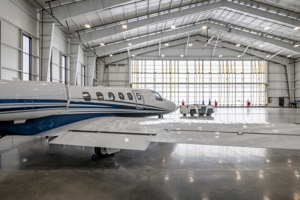 Constructed with durable limestone and aluminum panels, the facility prioritizes longevity and efficiency. A high-performance envelope maximizes daylight while controlling glare, while expansive glazing enhances illumination. The polycarbonate-clad hangar door allows natural light, creating a bright workspace. A direct FBO-to-hangar connection streamlines operation.