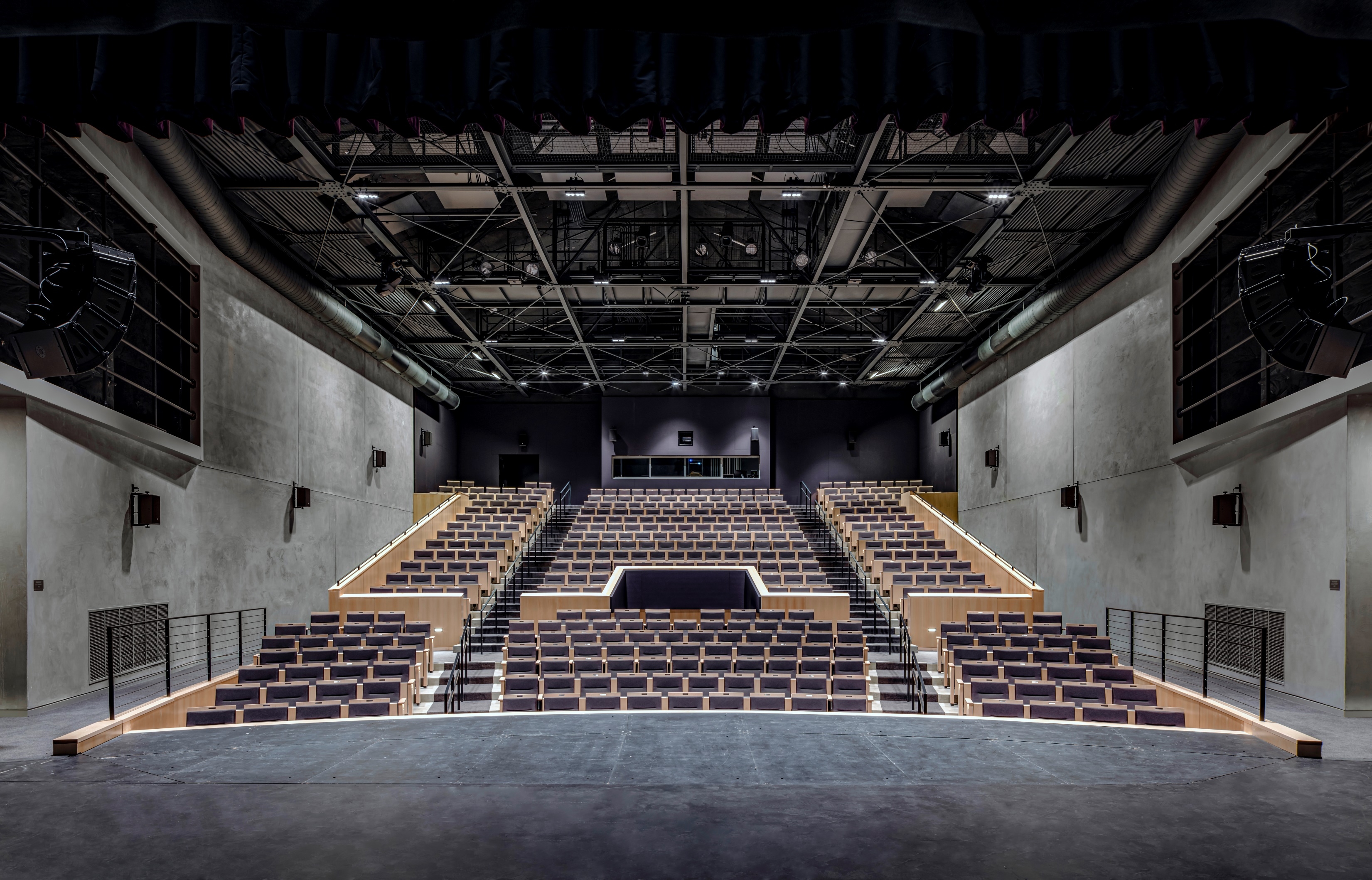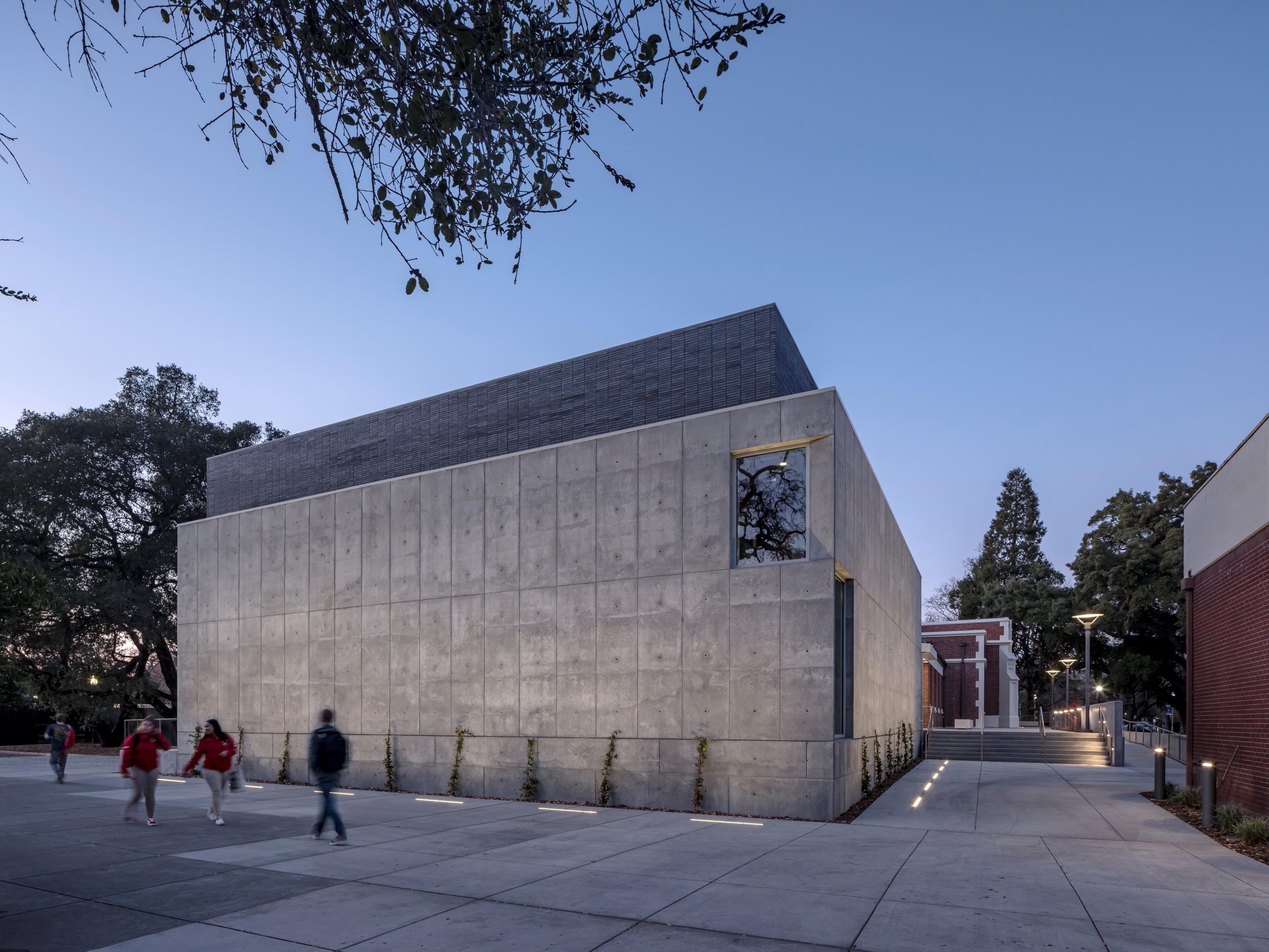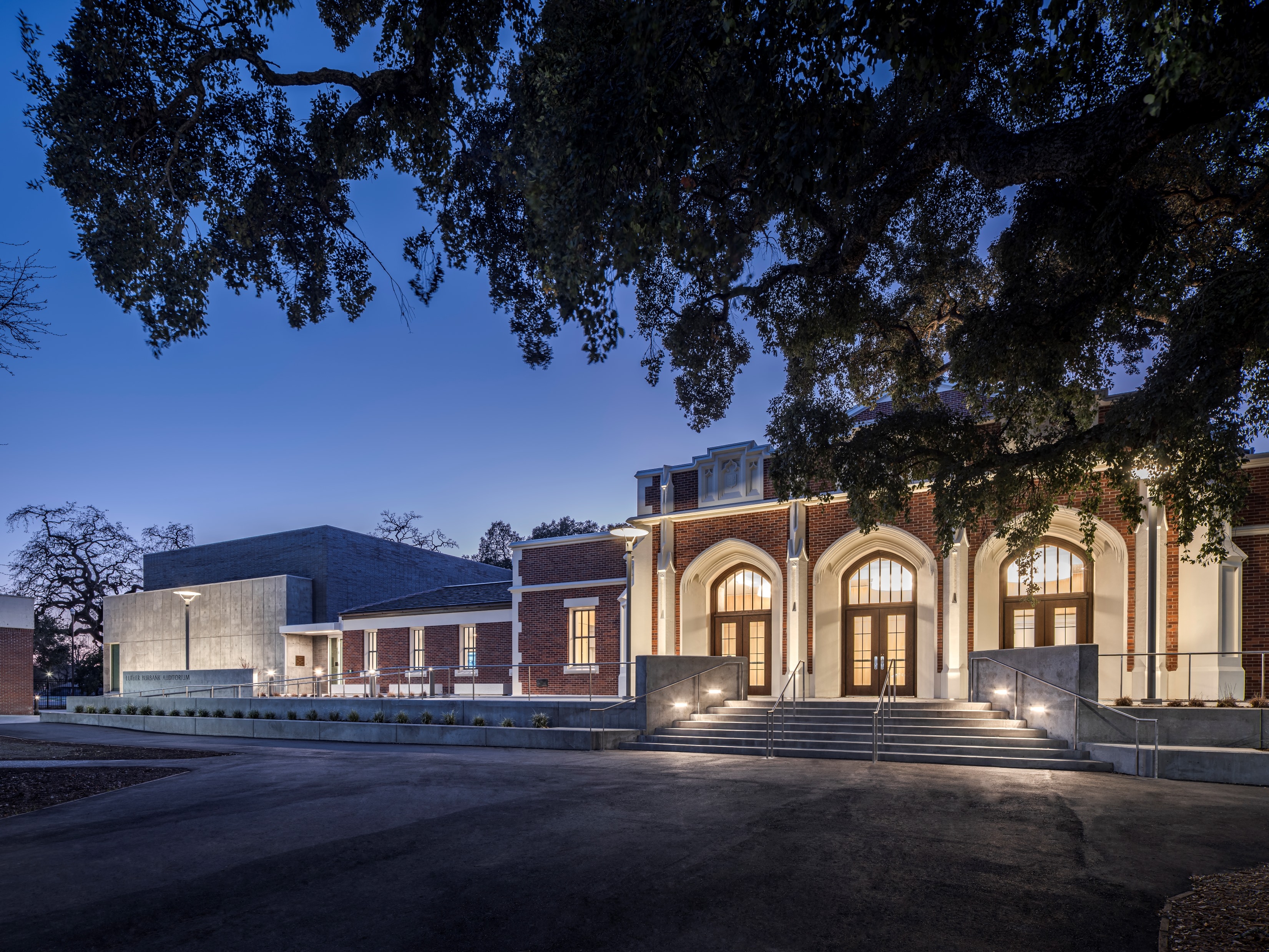 The project transformed the 34,300 square foot, 80-year-old heritage building at the core of the campus into a technologically advanced facility to house its Theatre Arts and Summer Repertory Theatre programs. The expanded main entry terrace and lobby welcome the public into a bright and contemporary space. The existing shallow-sloped main auditorium was completely reconfigured to provide tiered seating for 400 with superior sight lines. Floor levels and circulation paths were altered substantially to significantly improve accessibility for both students and audience members. Major upgrades to building systems, stage rigging, acoustics, and theatre technology enhance experience and learning opportunities. A new 200-seat multipurpose addition was constructed to serve campus instructional needs as a lecture classroom and act as a “black box” studio theater and rehearsal venue.