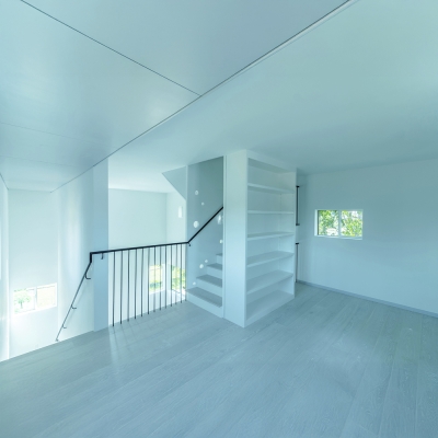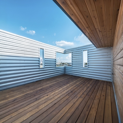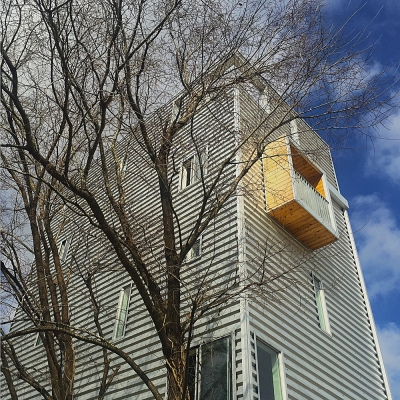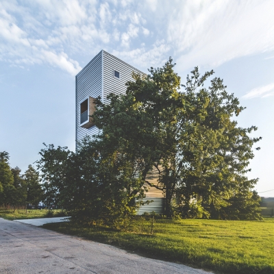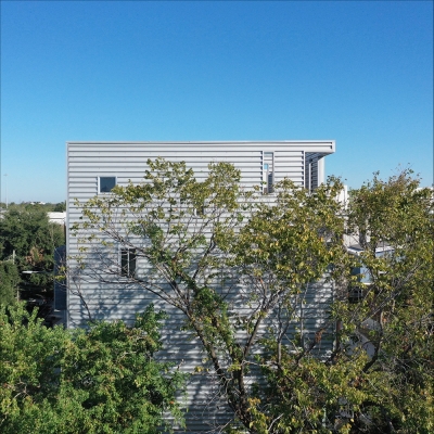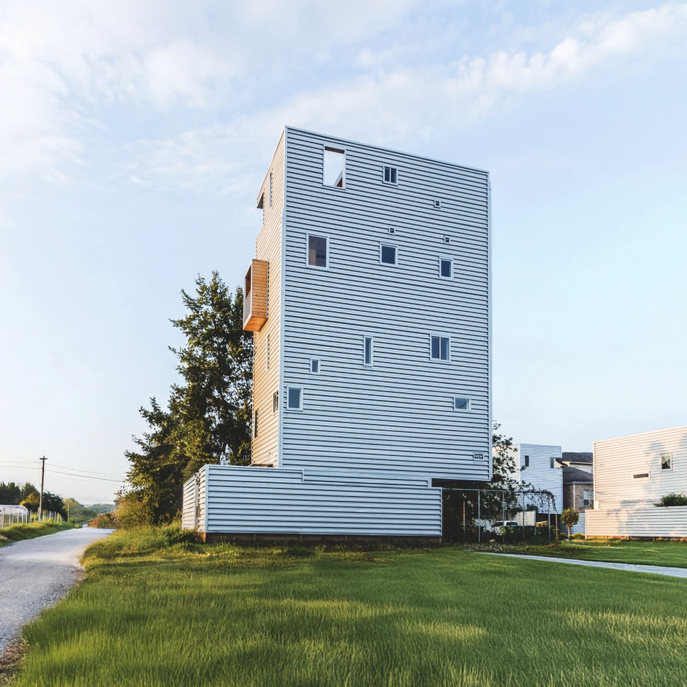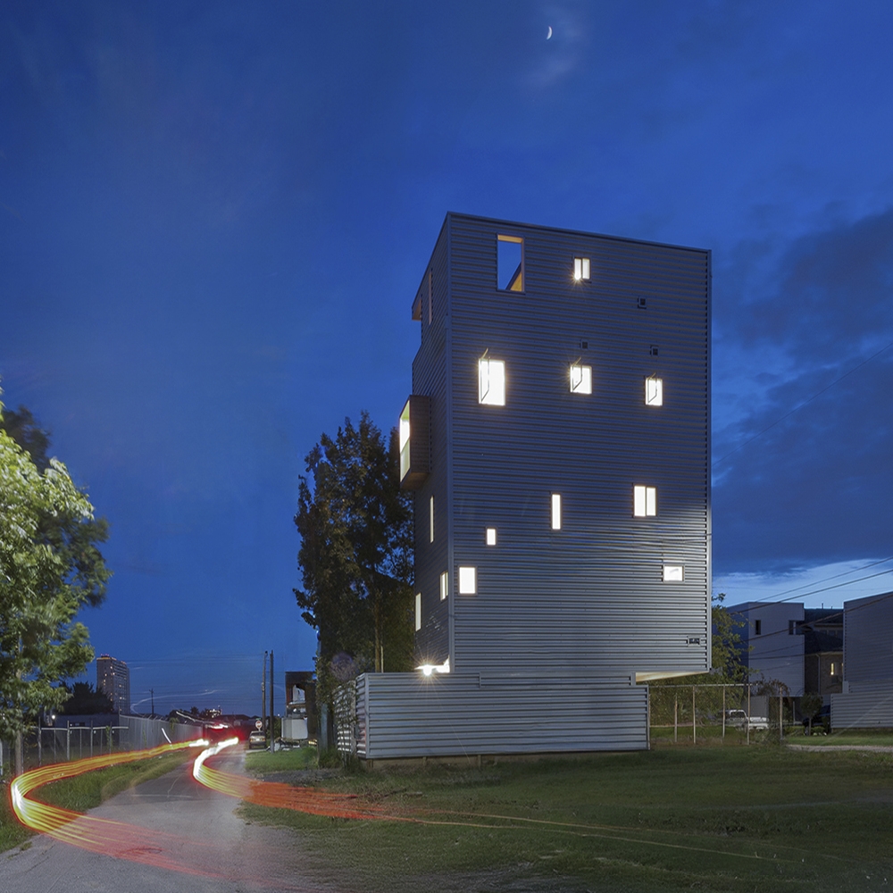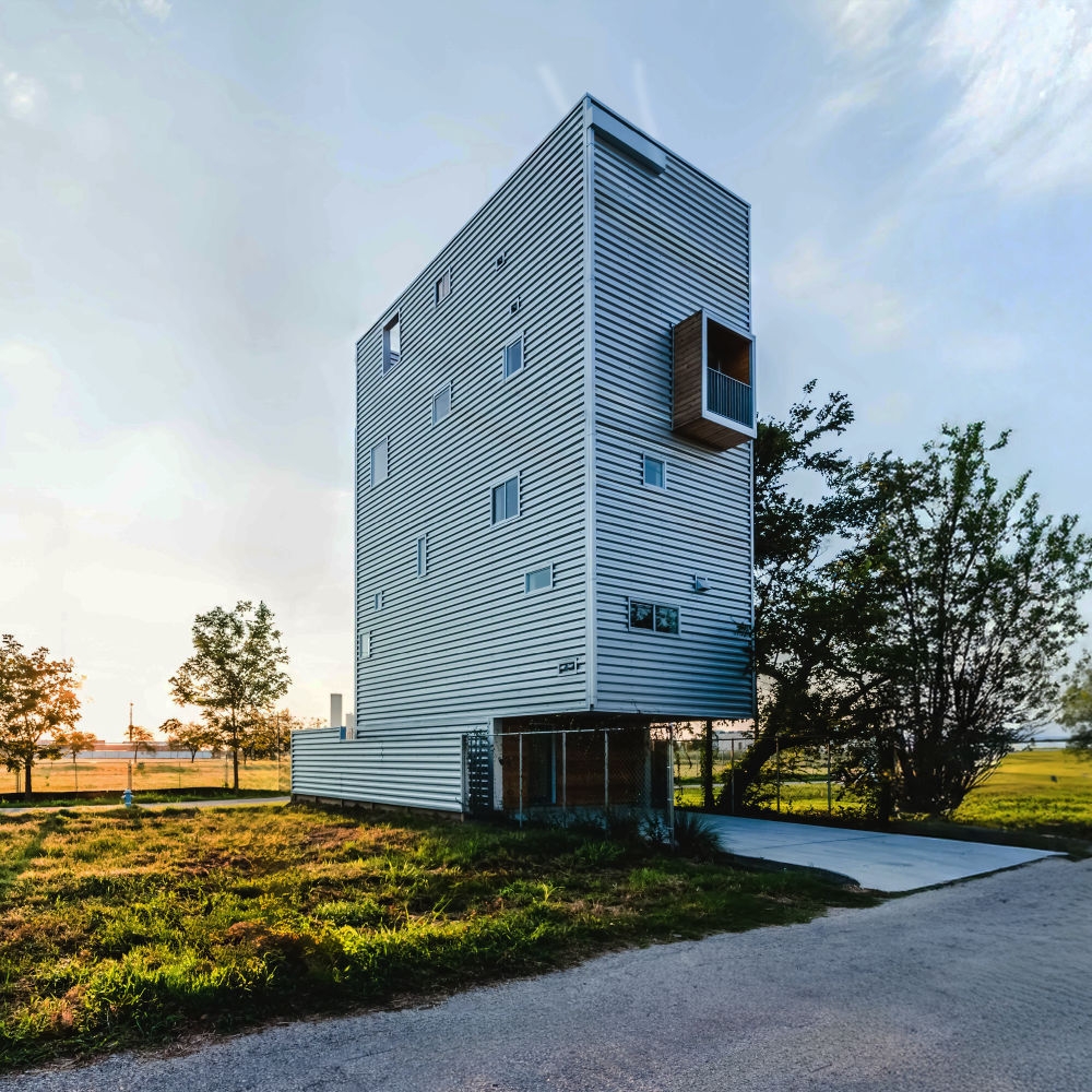 Tall House rises from one of Houston’s narrowest grandfathered lots as a vertical solution to dense urban infill. Two volumes are stacked and shifted: the upper form cantilevers forward, recalling nearby industrial chimneys—tall boiler stacks once used to vent steam from laundries and rail yards. Its corrugated metal skin, operable openings, and stack-effect cooling strategy reflect environmental intent. A third volume slices through the third floor, linking two wood box balconies and enabling horizontal cross ventilation for the sleeping areas. The project’s vertical stair system connects a rentable ground floor unit with family spaces above and culminates in a rooftop deck framing downtown views. Positioned near the historic Olivewood Cemetery and an industrial corridor, Tall House expresses both cultural respect and spatial ingenuity. Conceived as three volumes—the ground-level plinth, the tall living stack, and the horizontal breezeway—it choreographs air, light, and structure in section. The forward shift creates lift and tension, echoing the imbalance of its industrial neighbors. It holds air, light, and memory in a tight footprint—an urban beacon of resilience and reuse.
