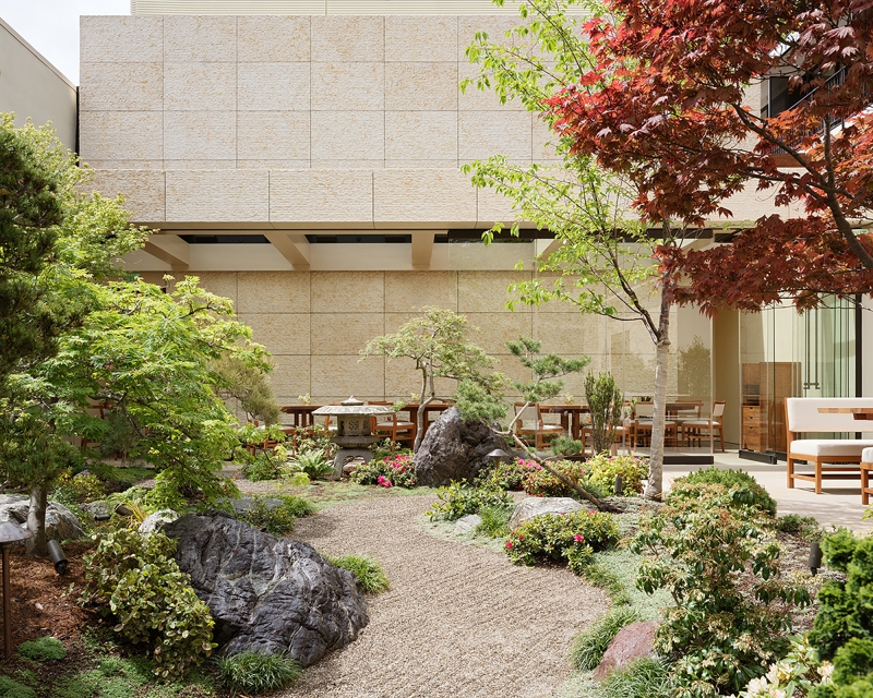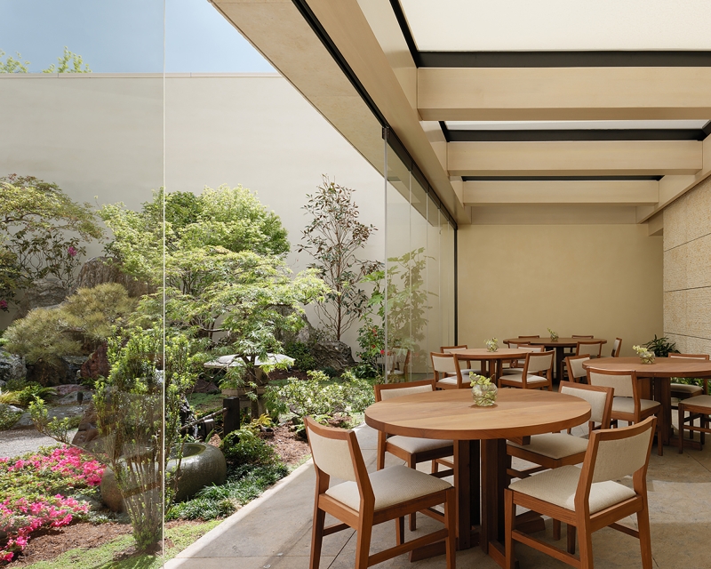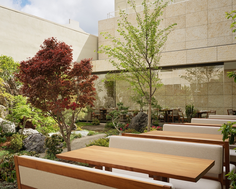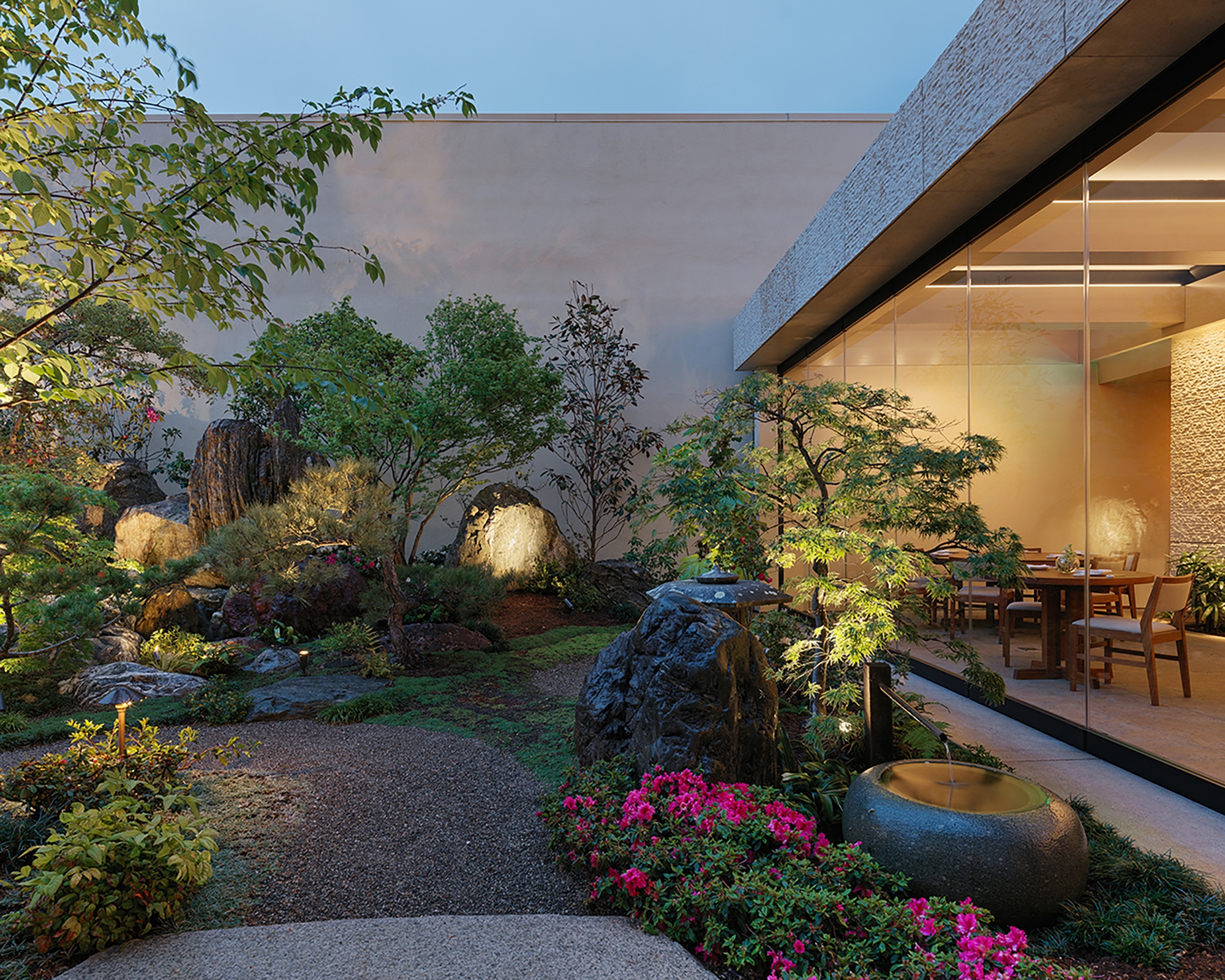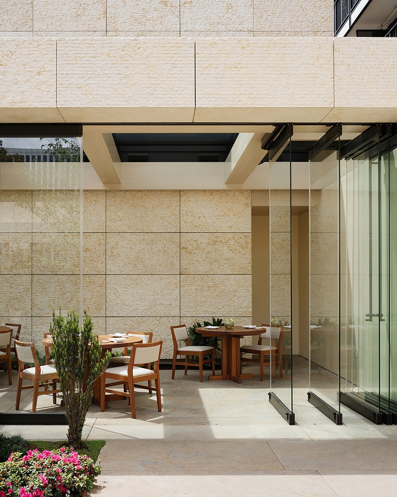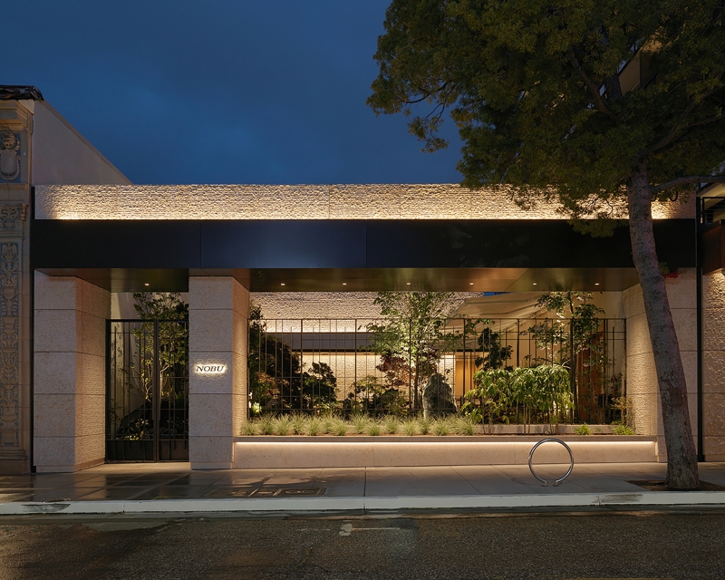 Aimed at creating harmonious transitions between neighboring Nobu Hotel and a historic storefront, Nobu Garden Restaurant retains architectural expression while opening up to a planted exterior dining room. On the exterior façade, display windows framed by limestone columns peer into the garden and dining areas. A decorative, bronze element inspired by the Japanese Shoji Screen creates a sense of arrival and variation to the recessed entrance, while façade plantings and a subtly lit garden offer a tranquil experience.