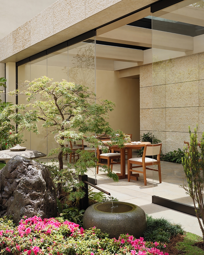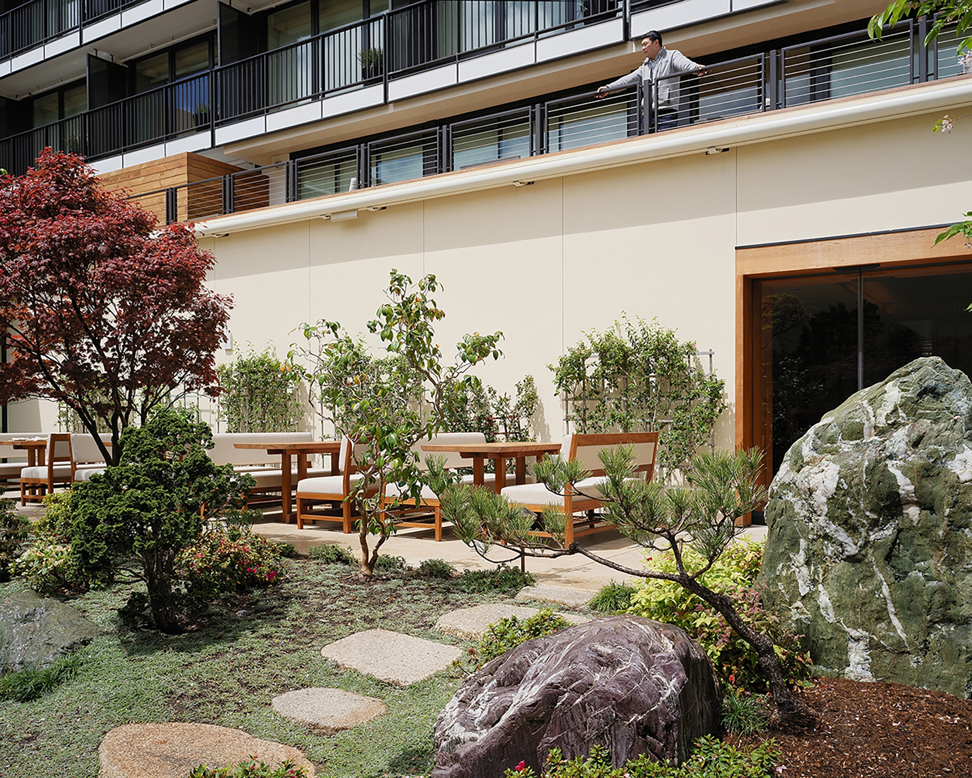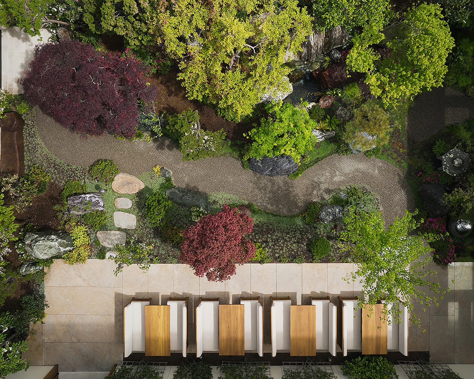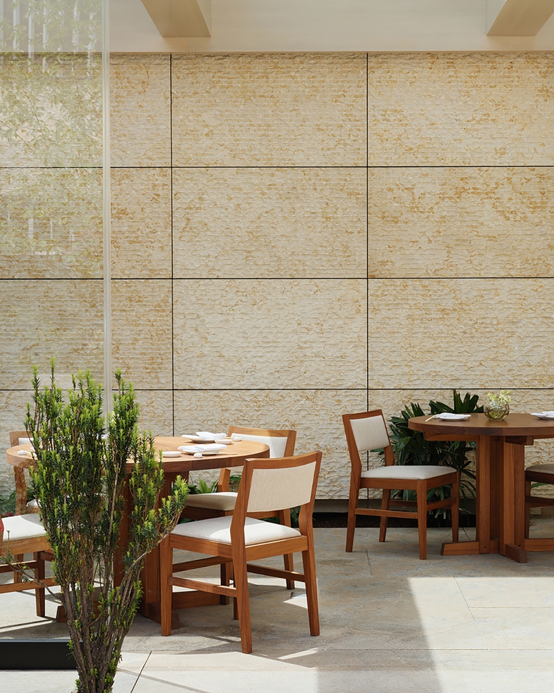 Aimed at creating harmonious transitions between neighboring Nobu Hotel and a historic storefront, Nobu Garden Restaurant retains architectural expression while opening up to a planted exterior dining room. On the exterior façade, display windows framed by limestone columns peer into the garden and dining areas. A decorative, bronze element inspired by the Japanese Shoji Screen creates a sense of arrival and variation to the recessed entrance, while façade plantings and a subtly lit garden offer a tranquil experience.