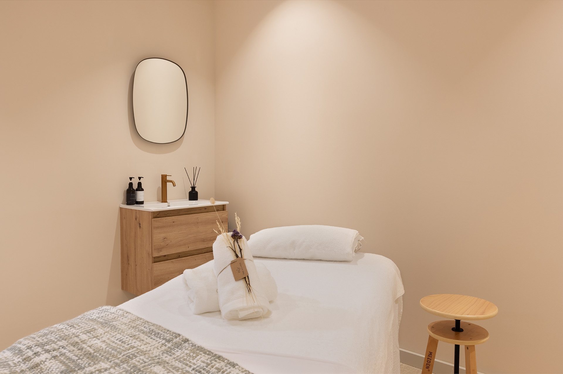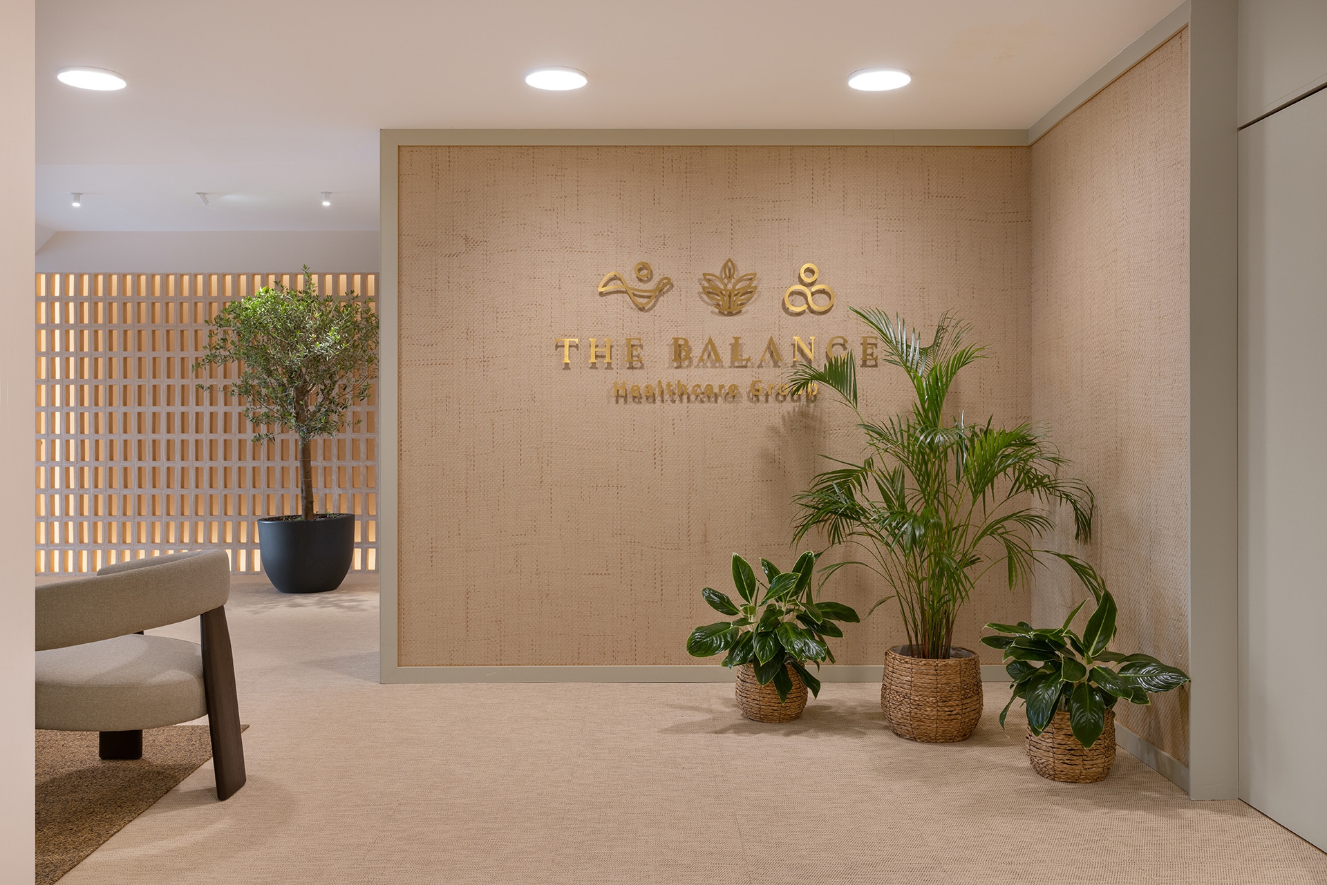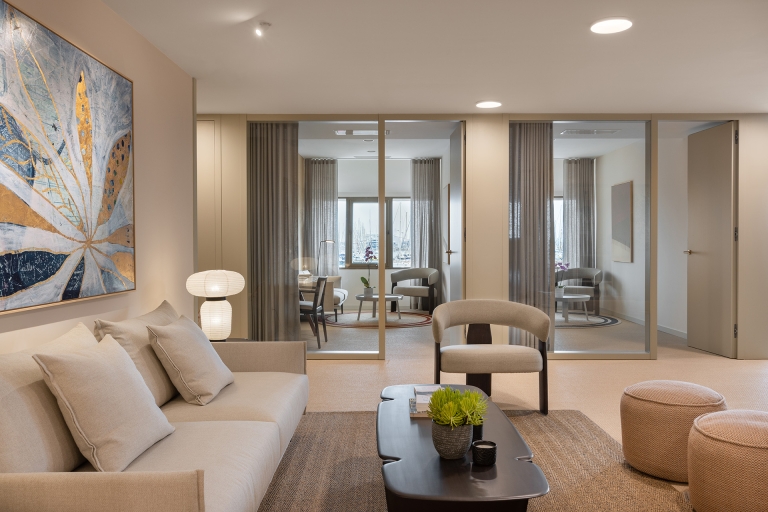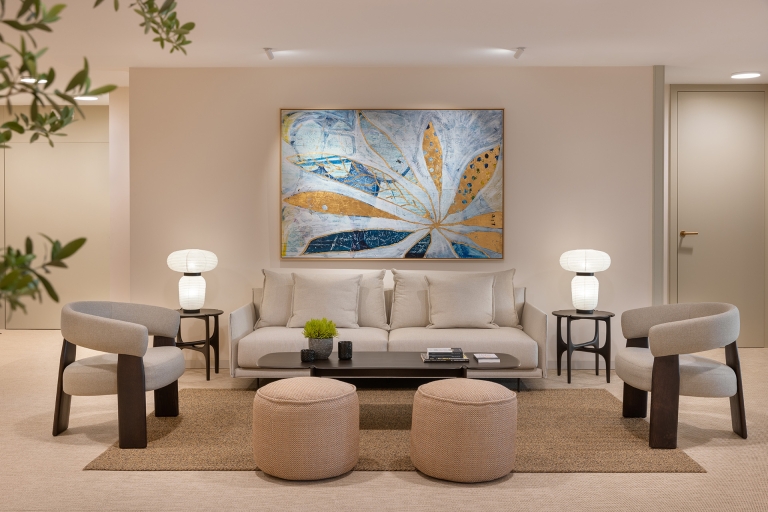The color scheme revolves around mellow crème and olive tones, creating a sense of ease and tranquility that supports patients’ well-being during treatment. Custom-made timber wall paneling, frameless glass, natural ceramics, and a newly woven floor made of recycled vinyl give the space a timeless touch.