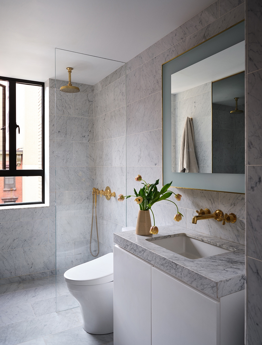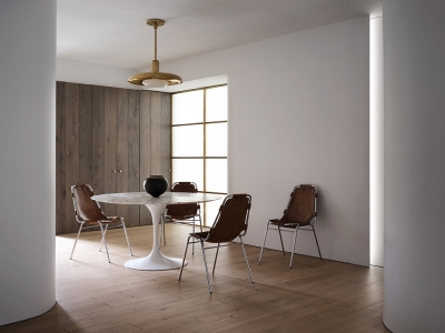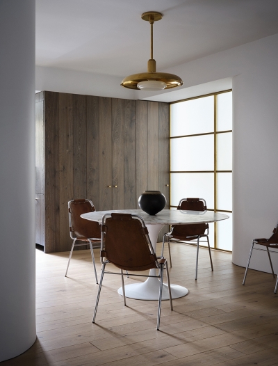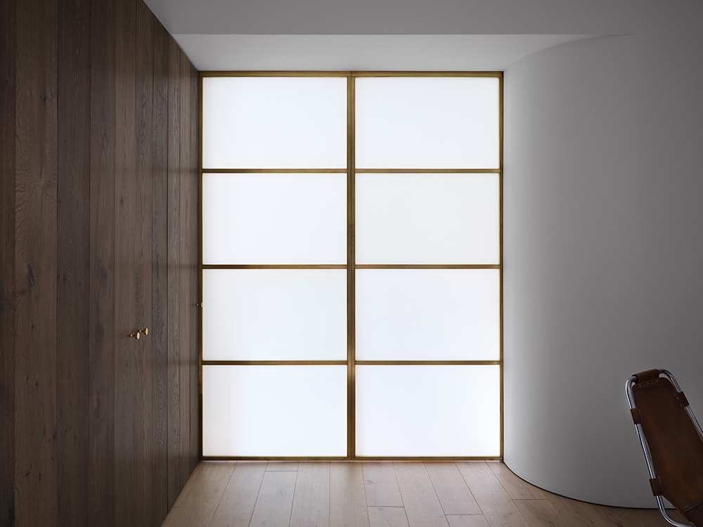 On arrival, a long entry corridor creates anticipation before visitors alight in the central piazza, that adjoins the living room and has a Saarinen table and vintage Charlotte Perriand chairs. One wall is paneled in fumed oak floorboards positioned vertically to hide a storage closet and a floor-to-ceiling screen of frosted glass in a brass frame allows soft light to emanate from the southern bedroom, which mainly serves as a