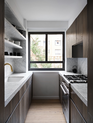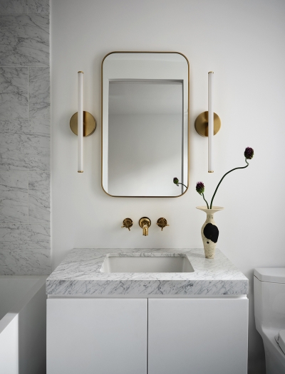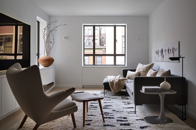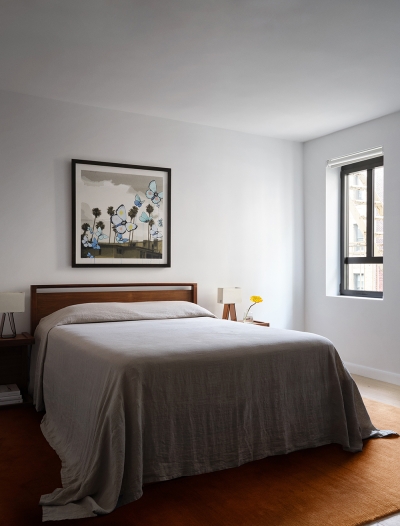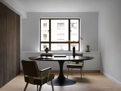 With windows in every room, our clients’ new two-bedroom co-op in Chelsea offered plenty of light, views and cross-ventilation but had a dated, awkward layout and cramped kitchen for the couple who loves to cook. We opened the arrangement of disconnected rooms to give the apartment a generous, connective flow and to fully harness its nourishing elements of light and air. We applied the ancient concept of the piazza to create a nexus connecting rooms with curved corners to smooth the transitions and maximize the amount of light and views. To abstract the architecture, we use two containers to organize programming, including an enlarged and upgraded kitchen. The result is an airy, light-filled apartment with an inherent sense of order and easy functionality.