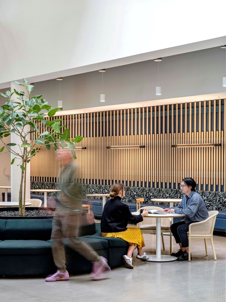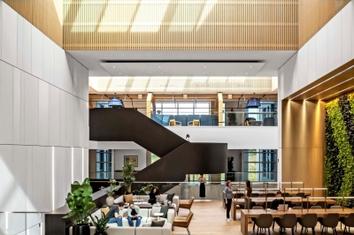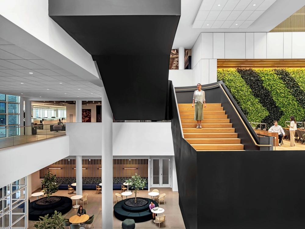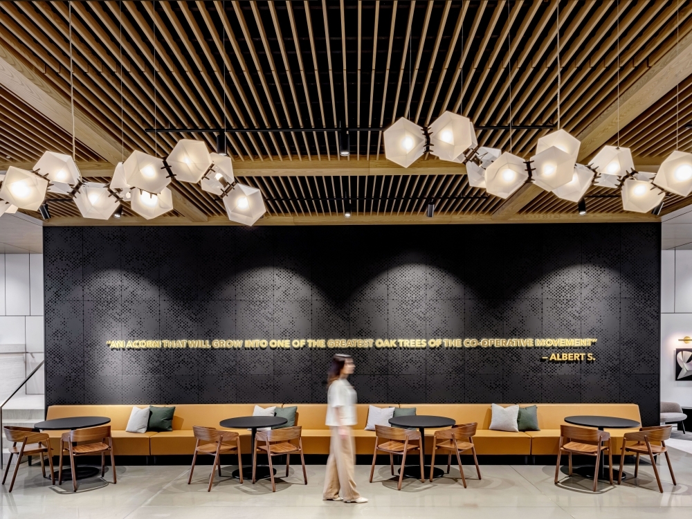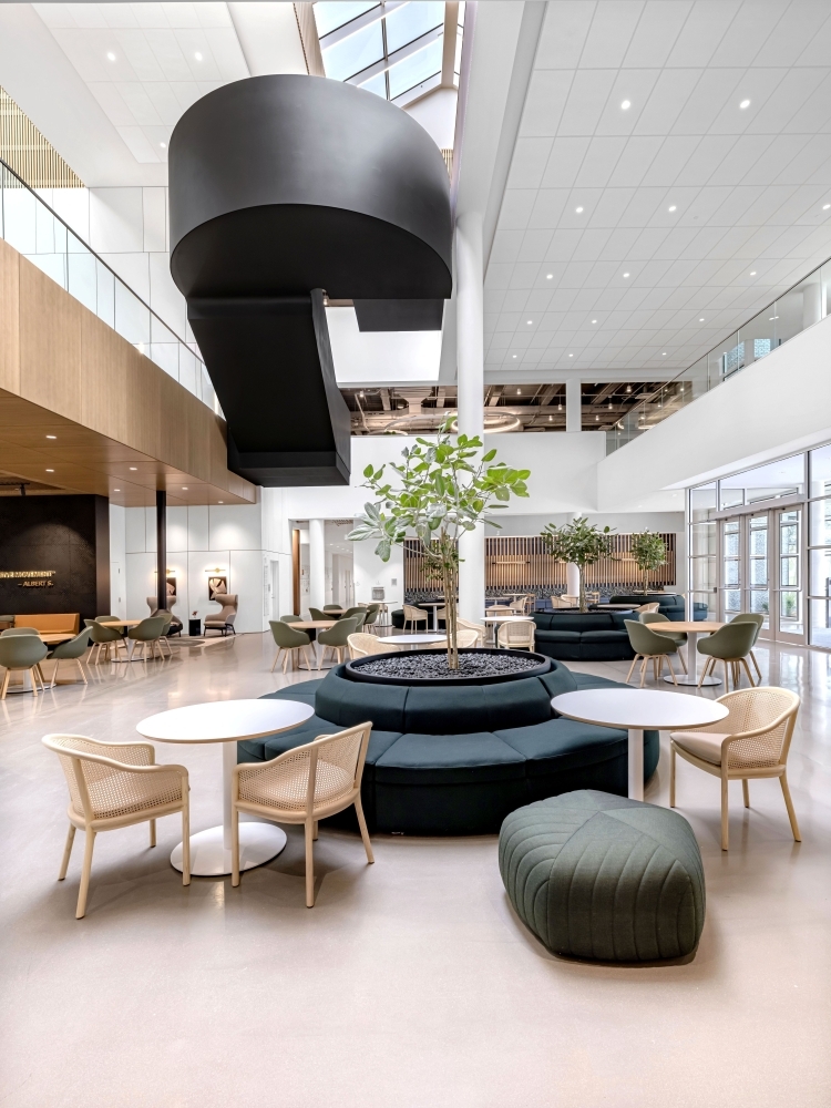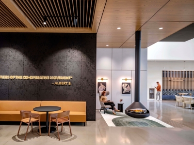 Commissioned by The Co-operators, the new headquarters in Guelph is a transformative workplace designed by HOK, with Neo Architecture Inc. as base building architect. HOK’s interiors reimagine the office as an inclusive, wellness-focused environment that embodies the client’s cooperative values and long-term sustainability goals. Agile work zones, wellness and multi-faith rooms, and neurodiverse-supportive features create a workplace where every employee feels welcomed and empowered. Biophilic elements- including green walls, natural materials, and generous daylight-foster health, comfort, and connection to nature. Designed for hybrid work, the interiors balance collaborative hubs with quiet focus areas, all supported by ergonomic, flexible furniture and intuitive layouts. The project is on track for LEED Gold, WELL Platinum, BOMA BEST, and Net-Zero certifications, integrating advanced systems such as smart lighting, tinting windows, and a rooftop solar array. More than a headquarters, the space establishes a national benchmark for sustainable, human-centric design—one that reflects The Co-operators’ values while setting a bold standard for the future of Canadian workplaces.