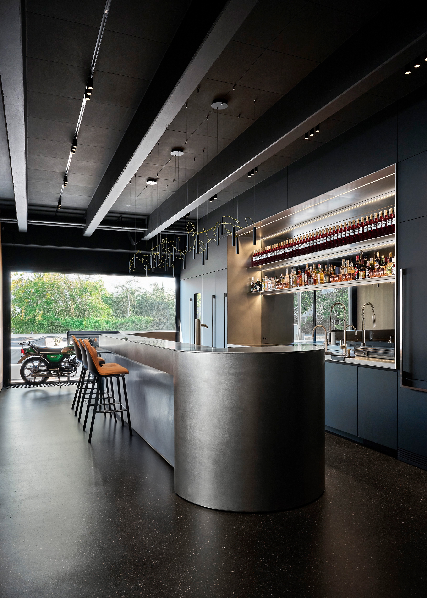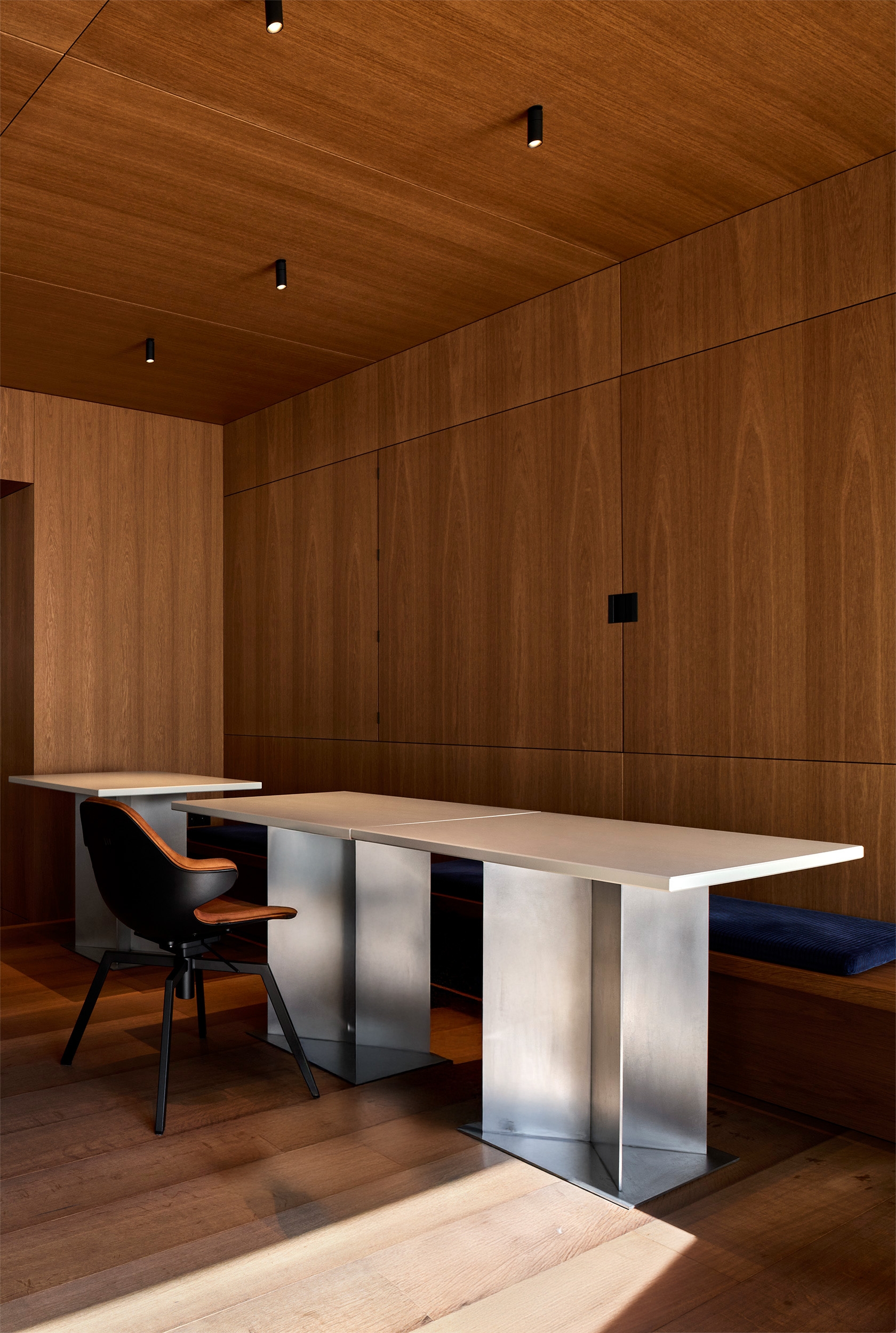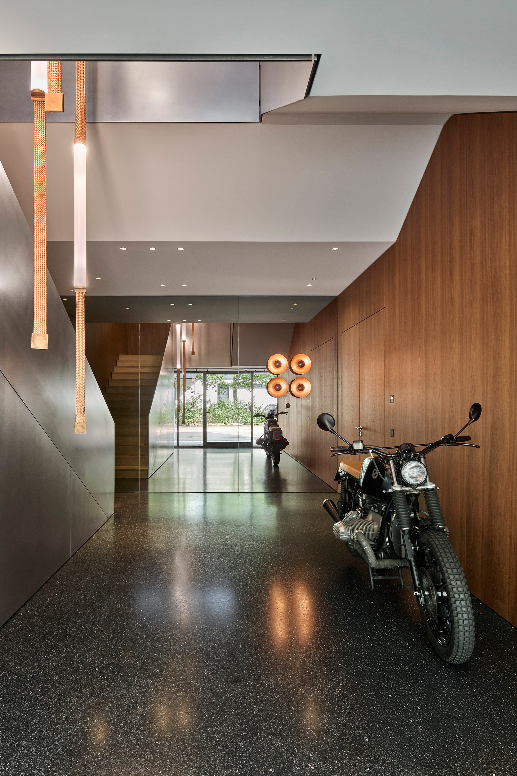 A former industrial building with a corrugated metal façade was completely restructured to create a new interior with a representative yet warm atmosphere. The ground floor includes a café with library, a large conference area, and lounge spaces. The first floor houses office areas and a micro-apartment, hidden behind a wood-paneled wall. Only the load-bearing masonry was retained; all other spatial and technical elements were newly designed, including acoustic and lighting systems.