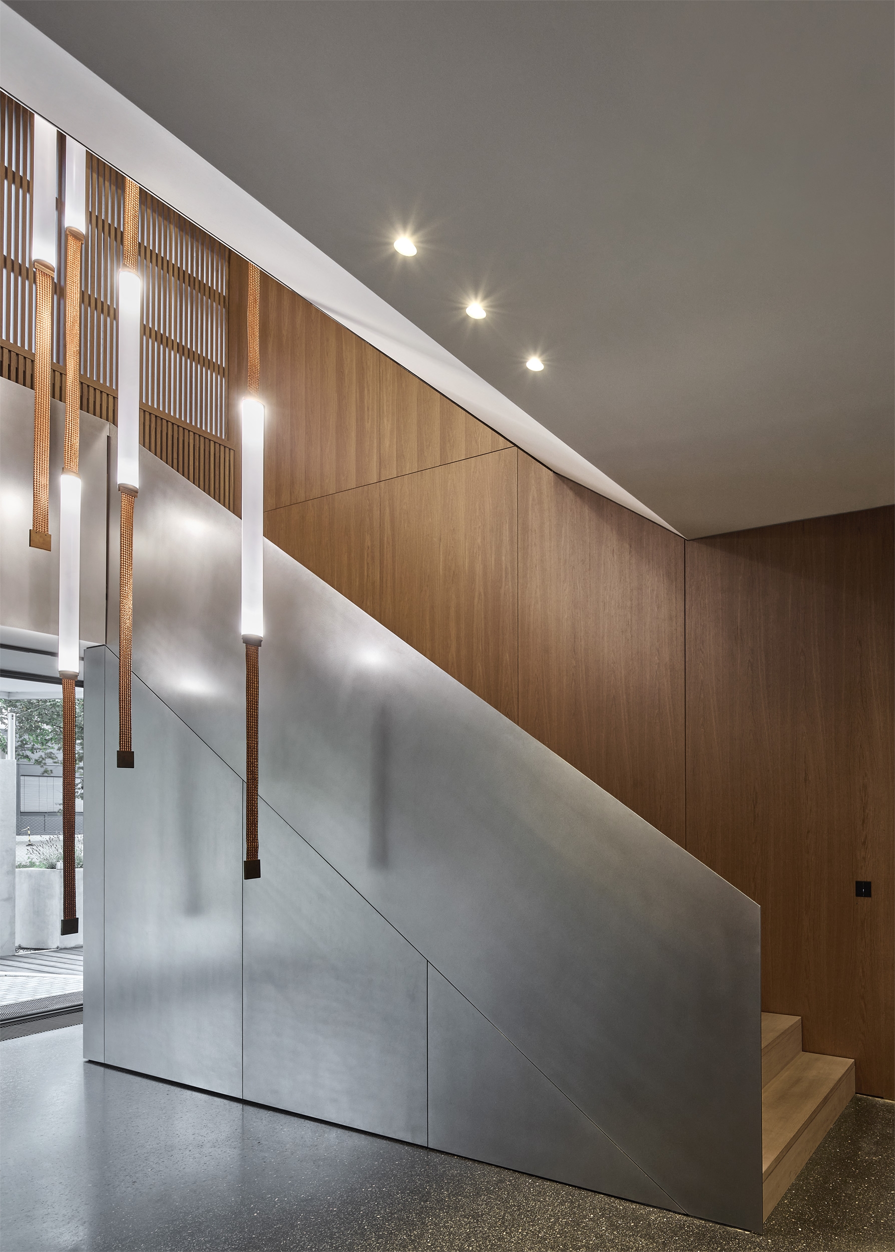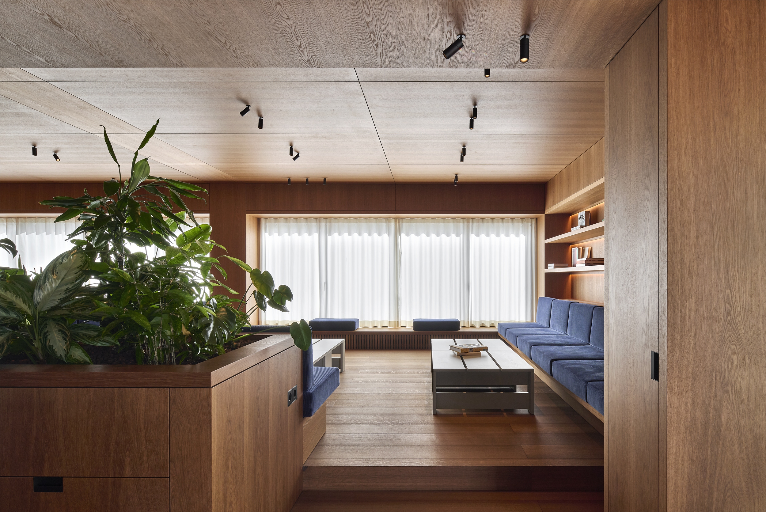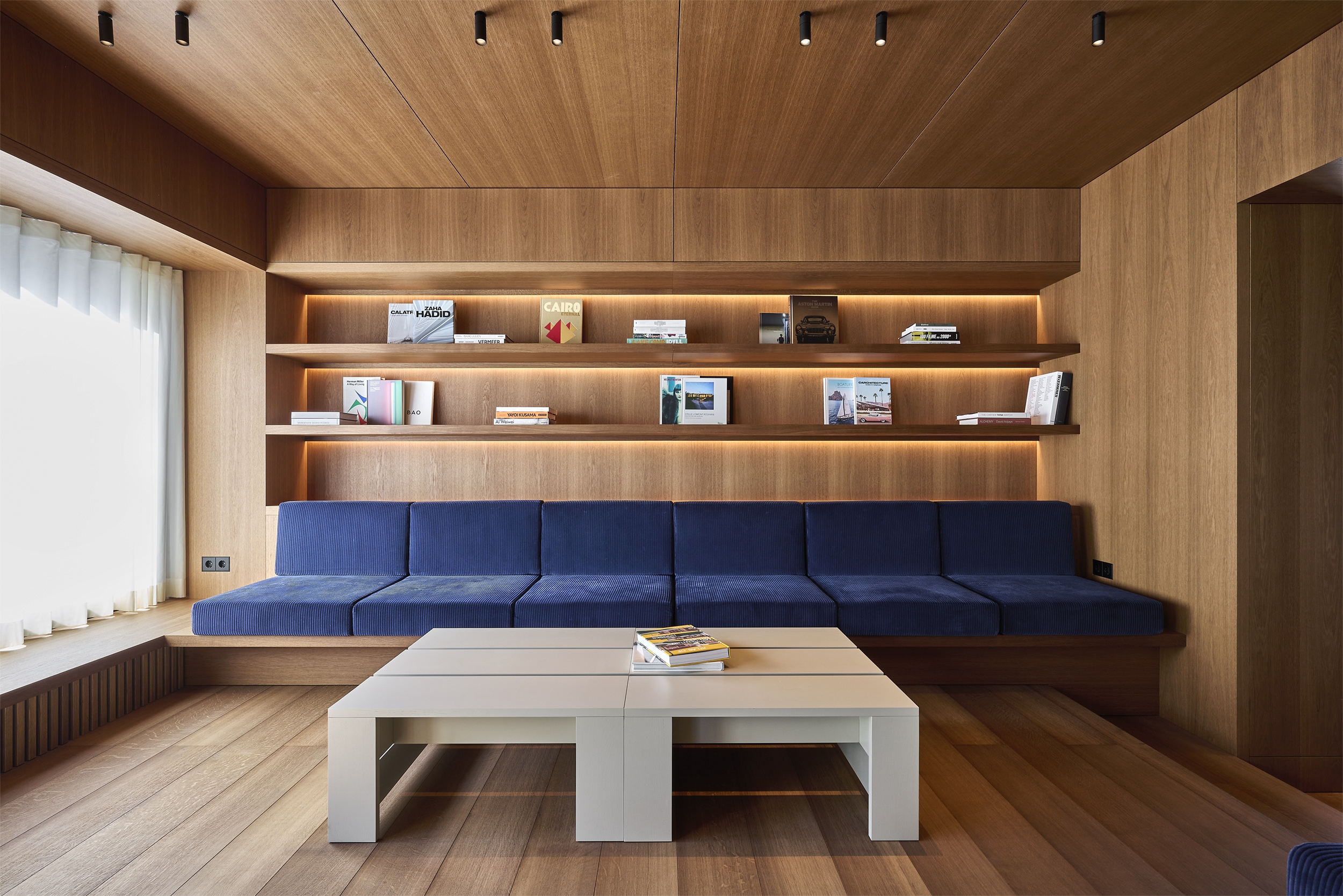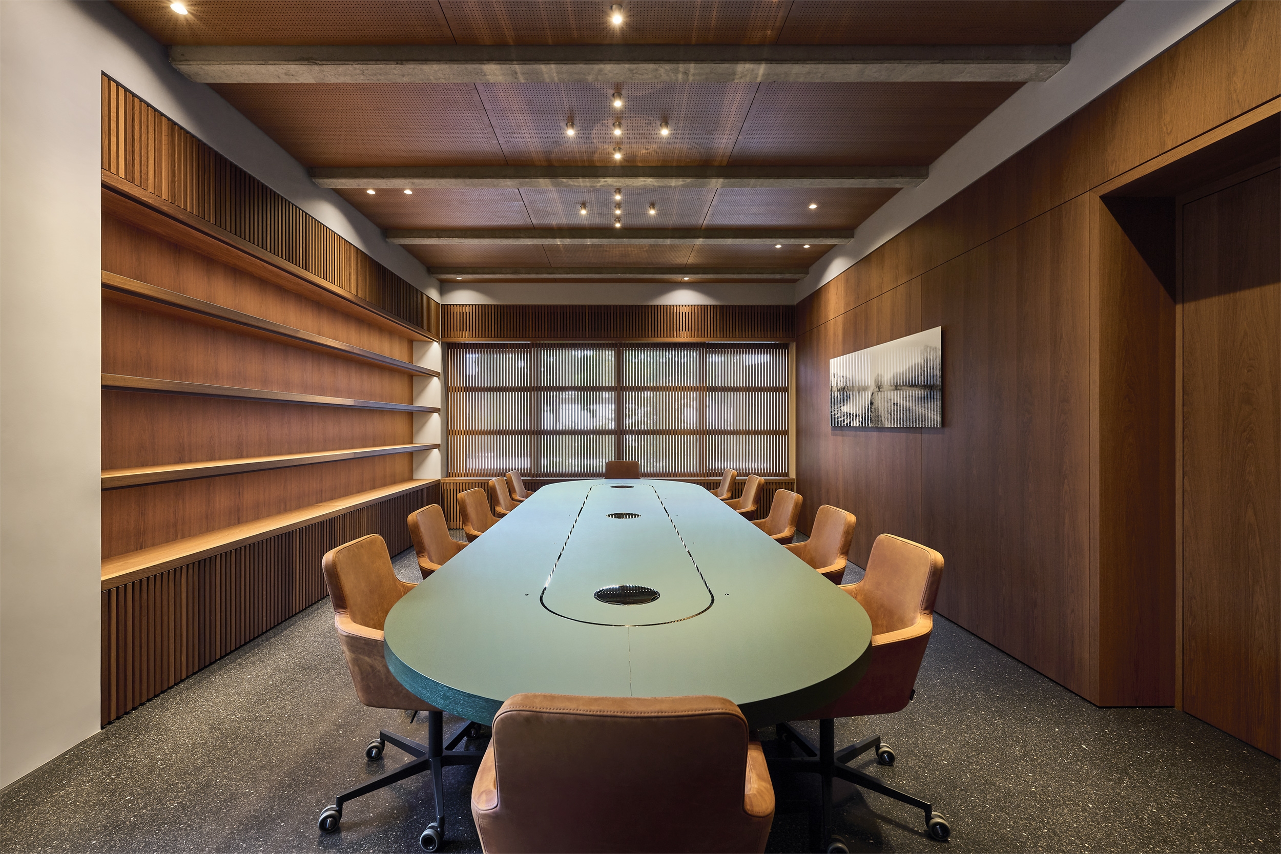 A former industrial building with a corrugated metal façade was completely restructured to create a new interior with a representative yet warm atmosphere. The ground floor includes a café with library, a large conference area, and lounge spaces. The first floor houses office areas and a micro-apartment, hidden behind a wood-paneled wall. Only the load-bearing masonry was retained; all other spatial and technical elements were newly designed, including acoustic and lighting systems.