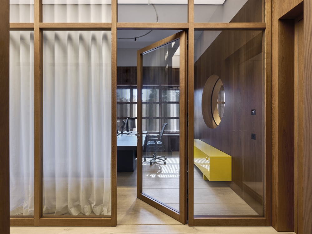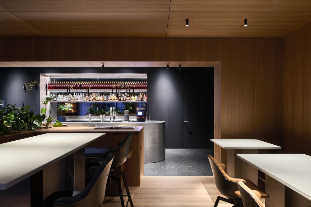 Materials include cast asphalt flooring and soaped or smoked oak on walls, ceilings, and built-in elements. Movable wooden shutters provide sun and privacy control. The café serves both as a client area and as a space for staff gatherings, team meetings, or after-work events. A new opening in the façade connects the café to the terrace. Stainless steel is used at the bar and stair railing, complemented by selected lighting elements. Subtle color accents appear in yellow tiles and matching furniture. Custom-designed furniture pieces are used throughout the café and terrace in lacquered and oiled oak versions.
