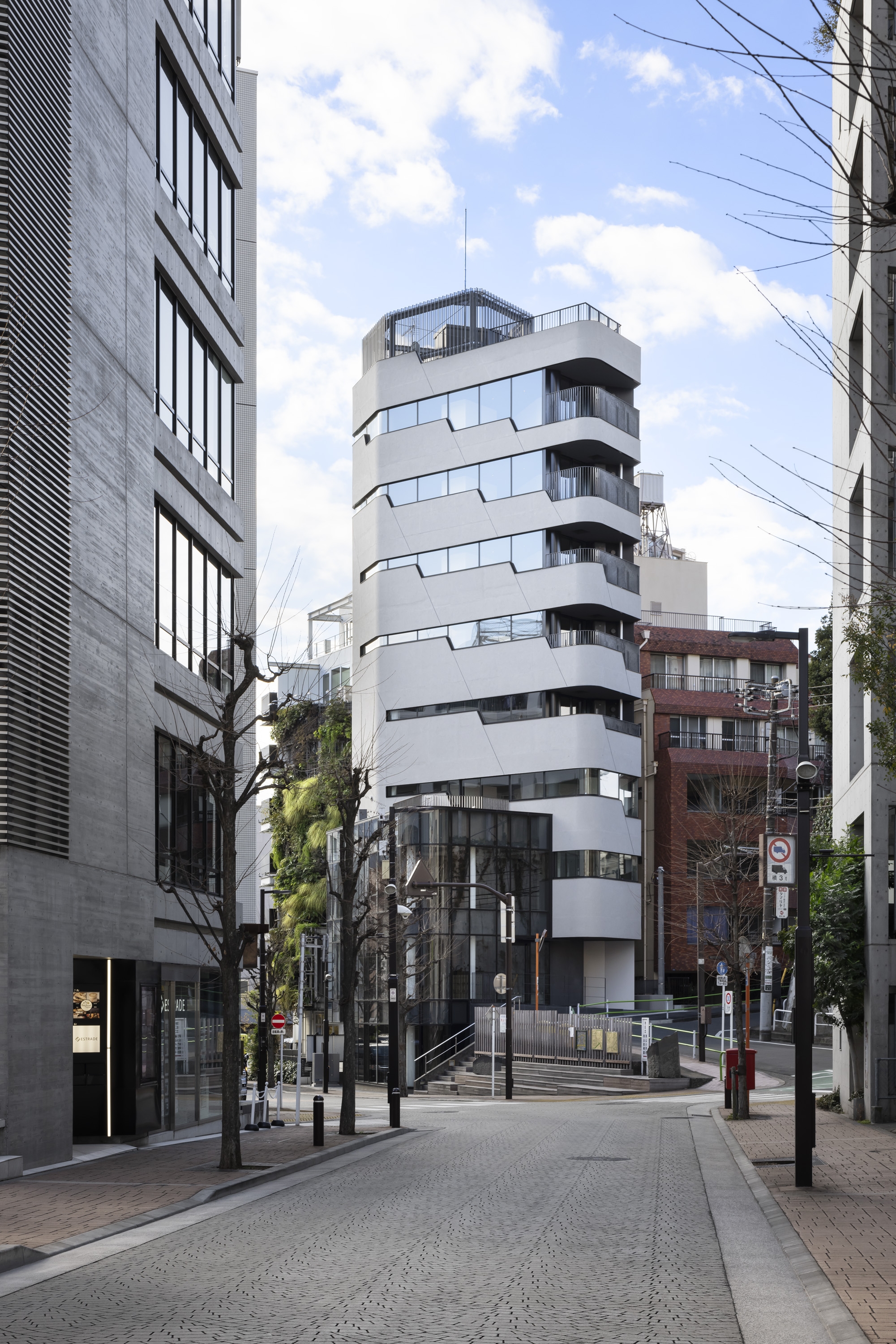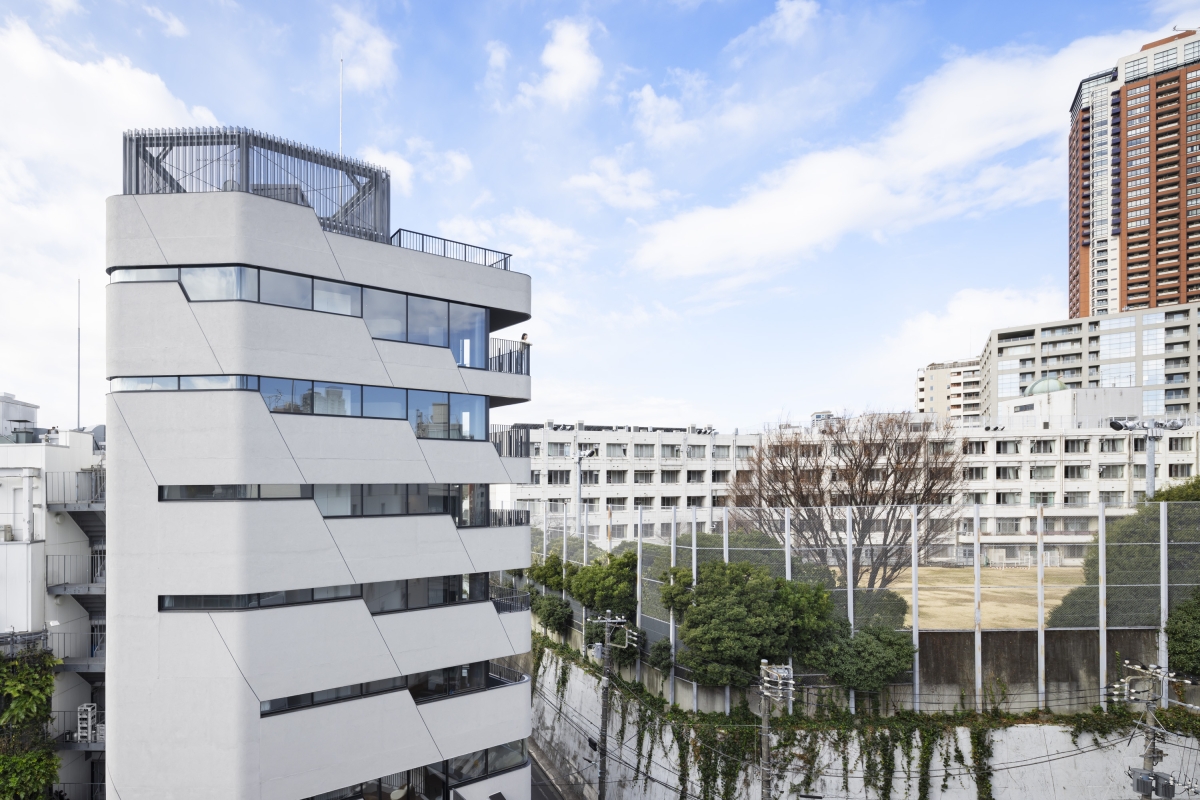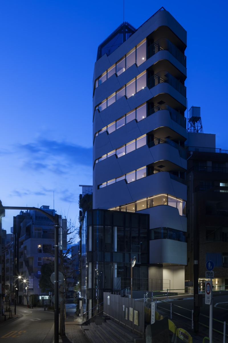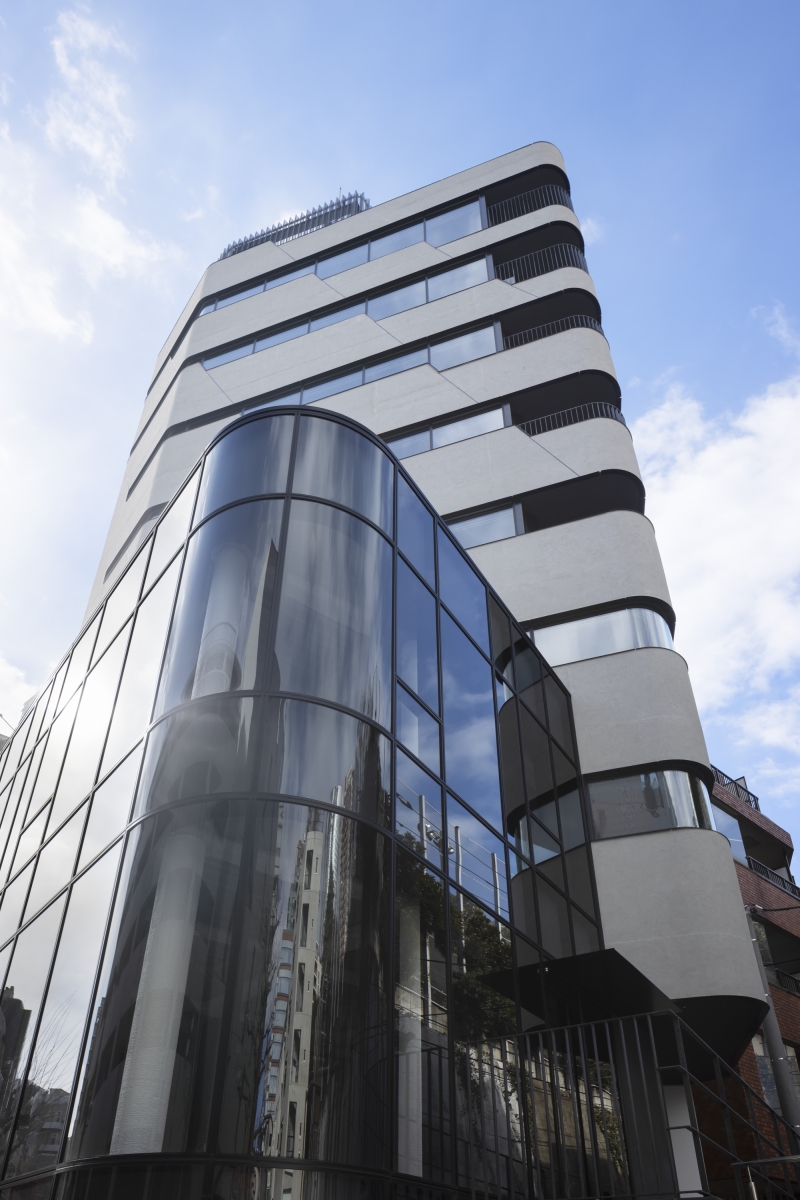 The project is a commercial/residential mixed-use building on a highly visible location near Roppongi Hills in Tokyo. The building is a simple composition of two volumes: The 3-story “glass” block is the commercial part entered directly from the main street, and the residential “concrete” tower is entered from the elevated side street. In a high-density city like Tokyo, getting great views while also securing visual privacy is often a challenge. But when we realized that the need for great views and visual privacy can be very different from floor to floor, and by the orientation of a particular unit, we asked ourselves a question. Rather than depending on curtains or blinds to control privacy, can the problem be solved architecturally while also making the solution an innovative façade expression? We came up with a solution where a series of “Stepped Ribbon Windows” create the optimum mix of “views” and “privacy” on each floor. The aperture is variable from lower to higher floors, and from Southward to Northward, making all units unique and comfortable to live in. At the top floor, where the windows are the largest, the dweller enjoys a spectacular panoramic view of the City.
