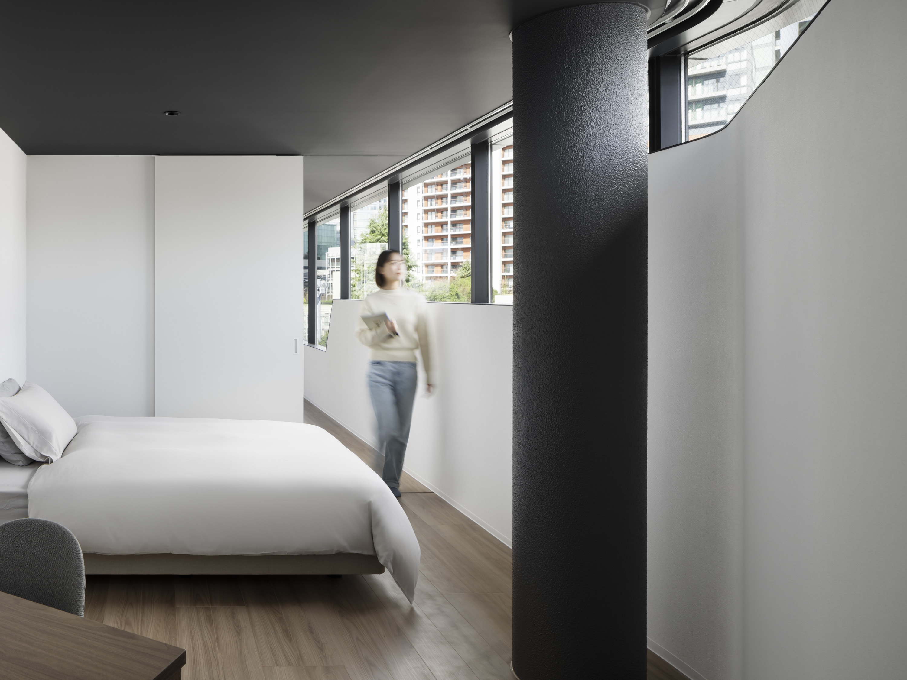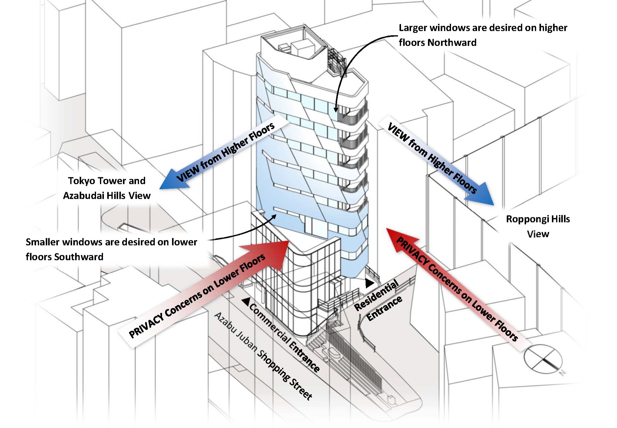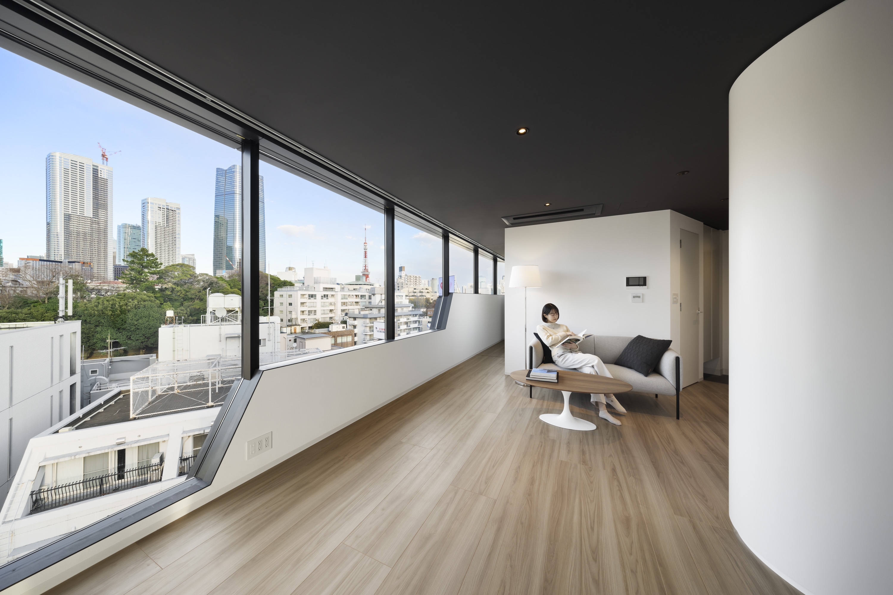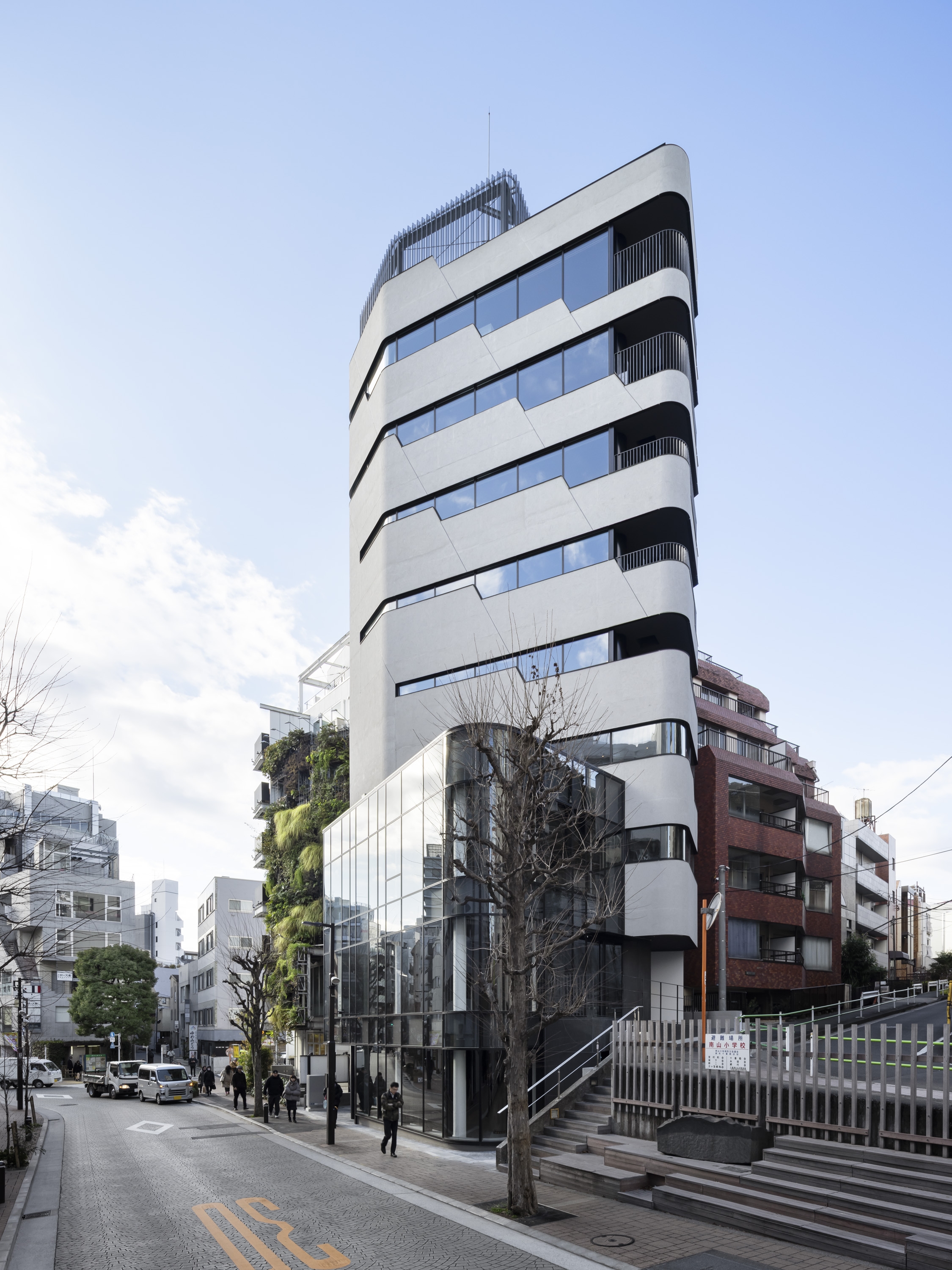 The project is a commercial/residential mixed-use building on a highly visible location near Roppongi Hills in Tokyo. The building is a simple composition of two volumes: The 3-story “glass” block is the commercial part entered directly from the main street, and the residential “concrete” tower is entered from the elevated side street. In a high-density city like Tokyo, getting great views while also securing visual privacy is often a challenge. But when we realized that the need for great views and visual privacy can be very different from floor to floor, and by the orientation of a particular unit, we asked ourselves a question. Rather than depending on curtains or blinds to control privacy, can the problem be solved architecturally while also making the solution an innovative façade expression? We came up with a solution where a series of “Stepped Ribbon Windows” create the optimum mix of “views” and “privacy” on each floor. The aperture is variable from lower to higher floors, and from Southward to Northward, making all units unique and comfortable to live in. At the top floor, where the windows are the largest, the dweller enjoys a spectacular panoramic view of the City.