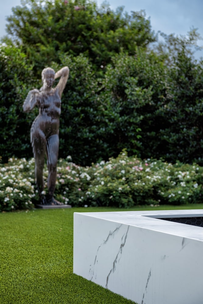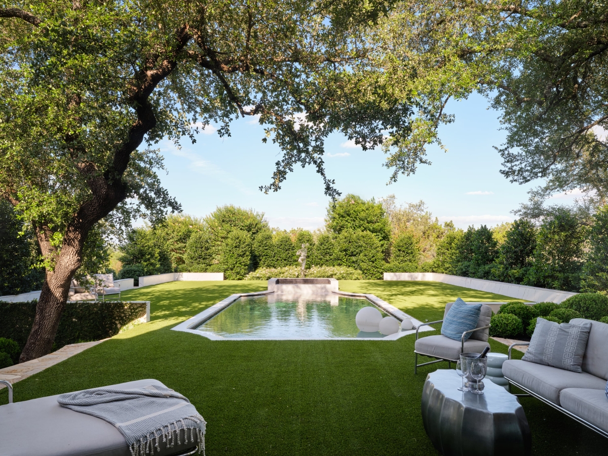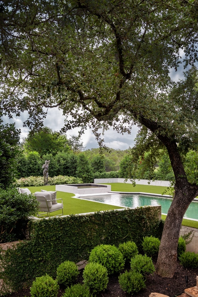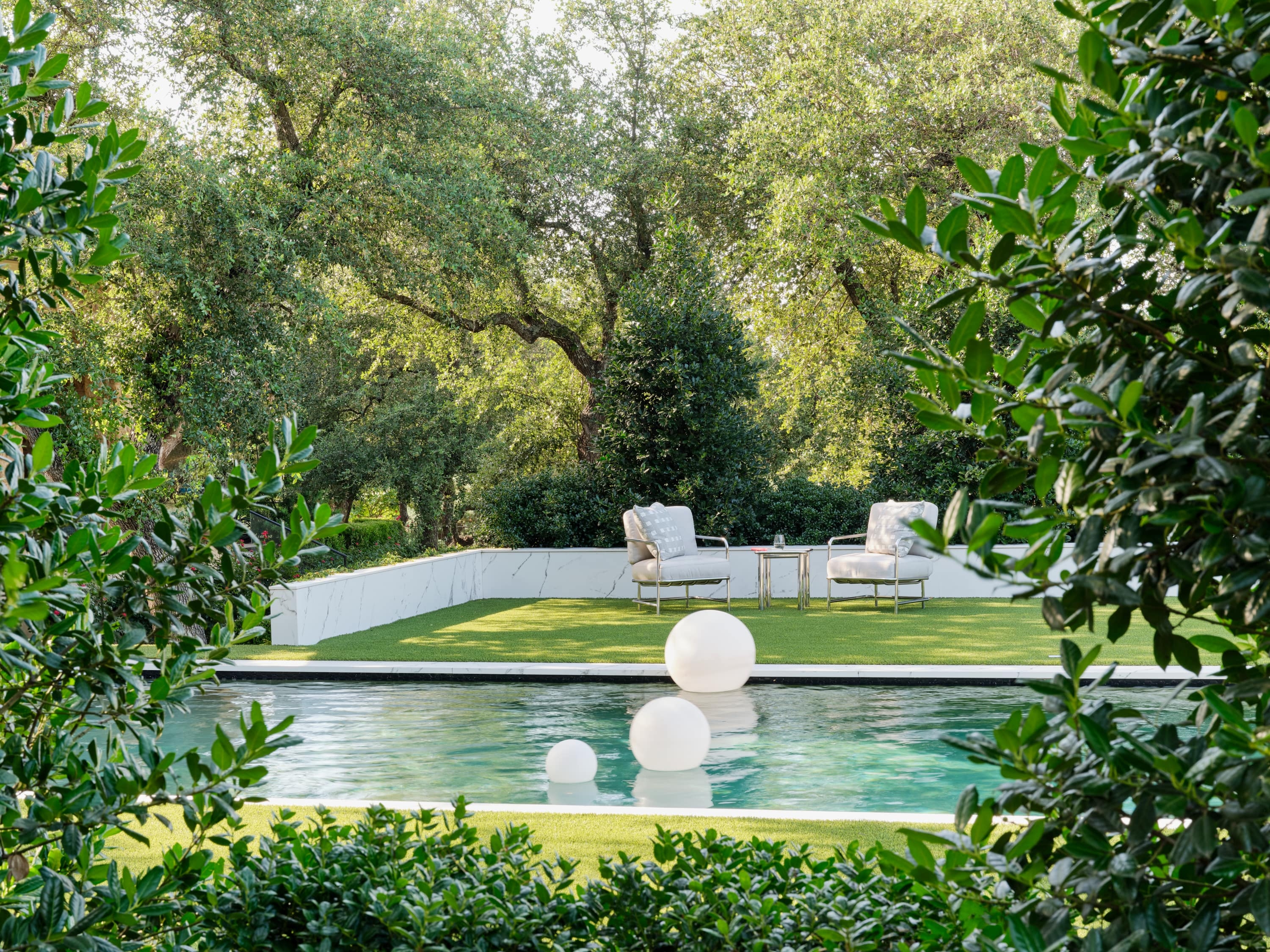 Sustainability is embedded in every detail: water wise synthetic turf offers barefoot comfort year-round without irrigation, evergreen plantings provide privacy, structure, and low maintenance. Designed within a crowded neighborhood, the space was crafted to feel unlike anything around it—serene, secluded, and deeply personal—while still opening framed “windows” into the garden and to the rolling hills beyond.