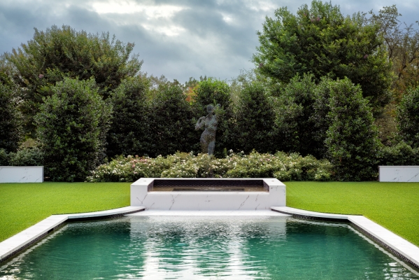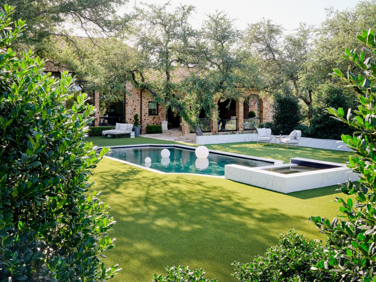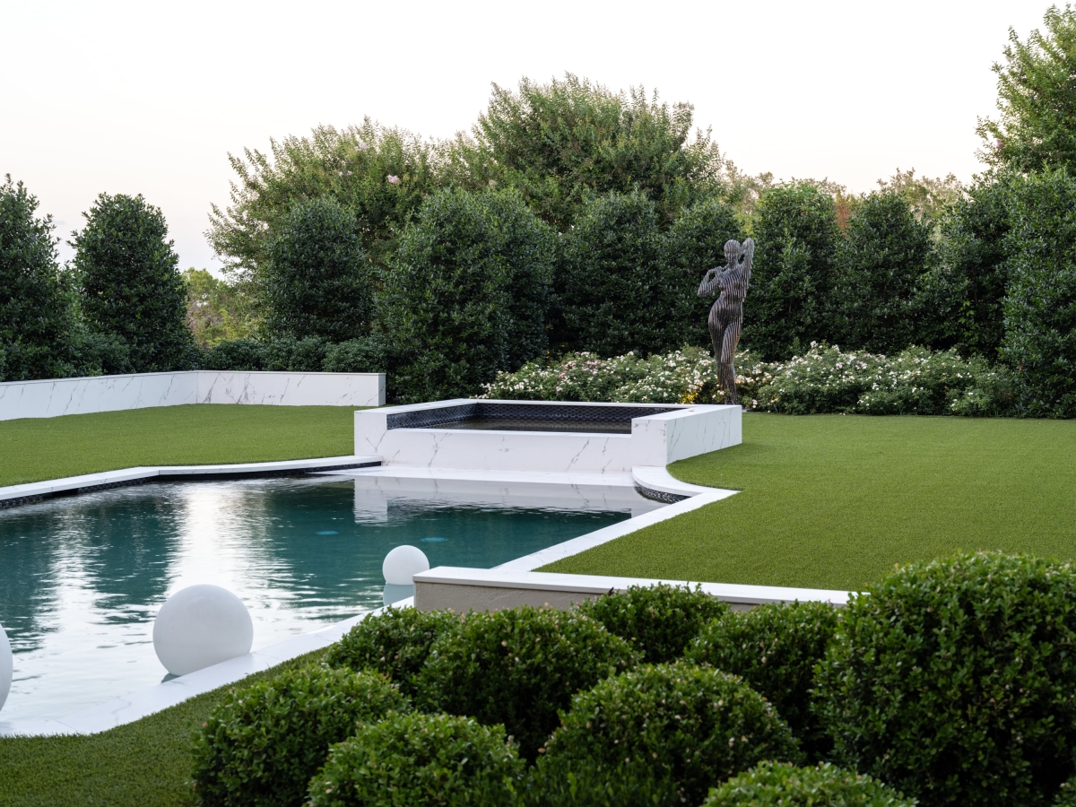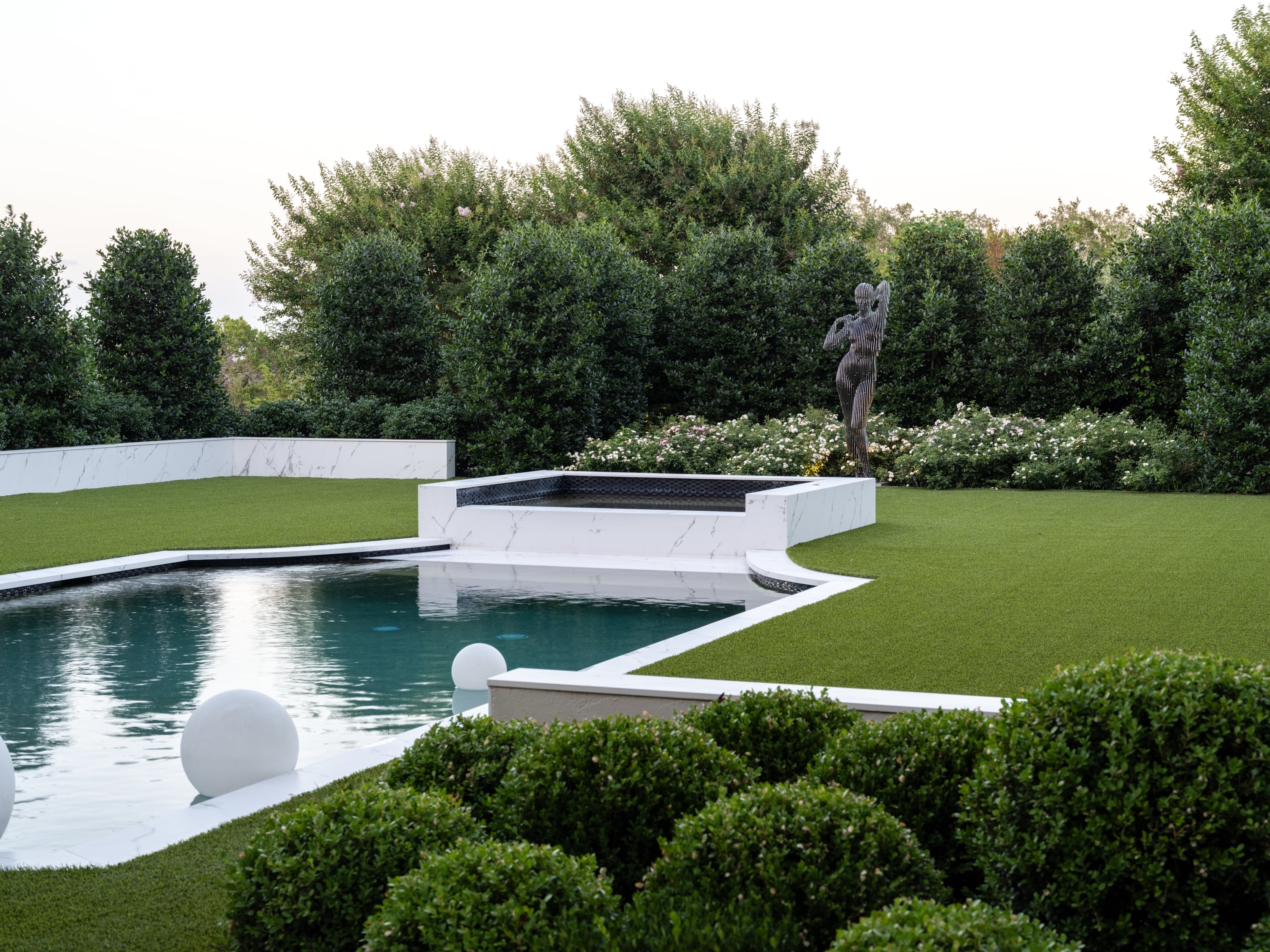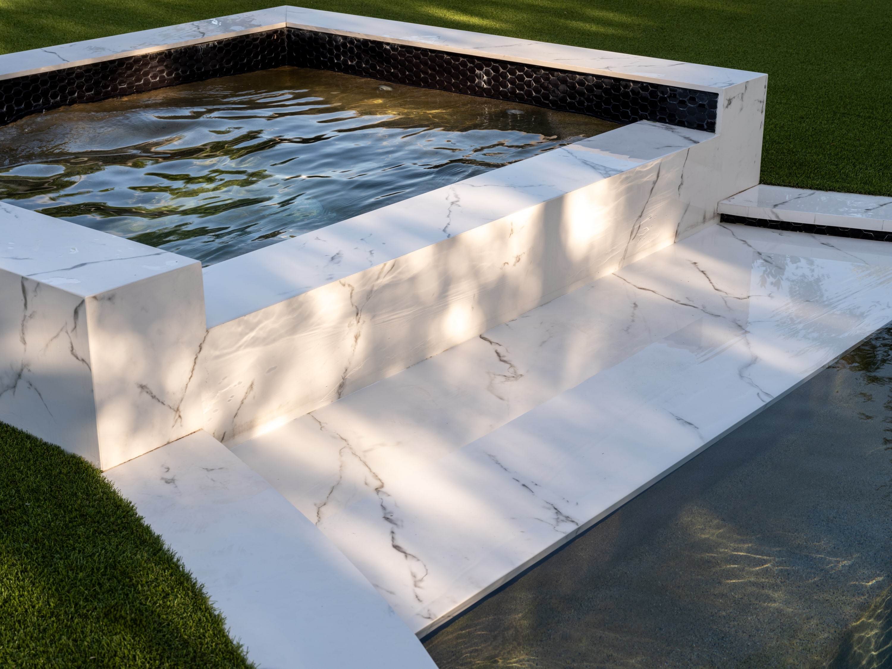 On a once sloped Austin site, this project redefines the modern garden—minimal in form yet rich in intention. The geometric pool and spa are clad in ultra compact surfaces, chosen for its aesthetic elegance, exceptional durability, and zero-maintenance performance. Precision mitered edges and concealed joints create the illusion of carved monolithic stone, an exercise in both restraint and craftsmanship.