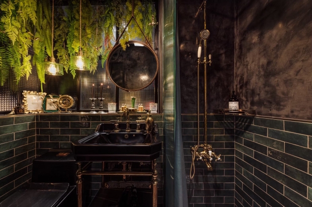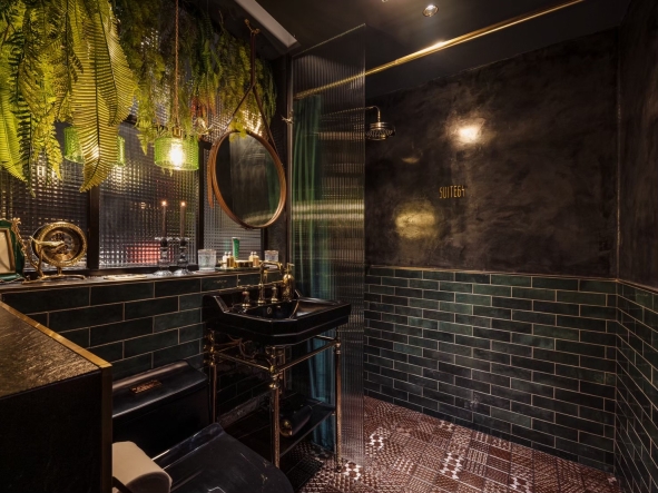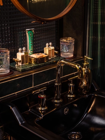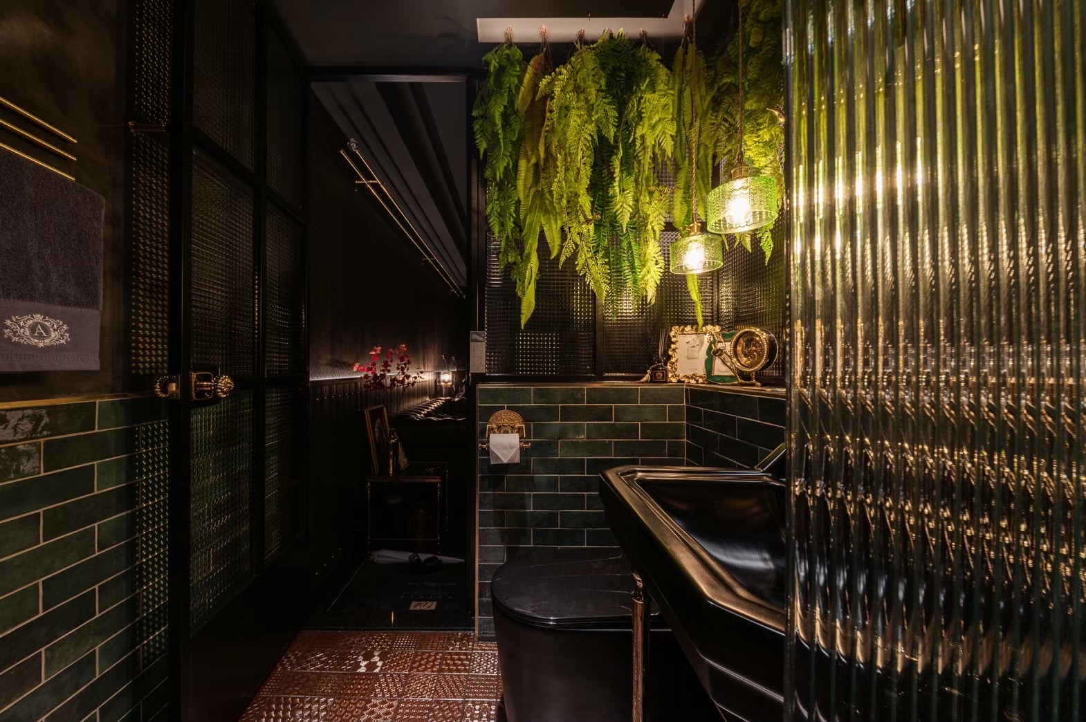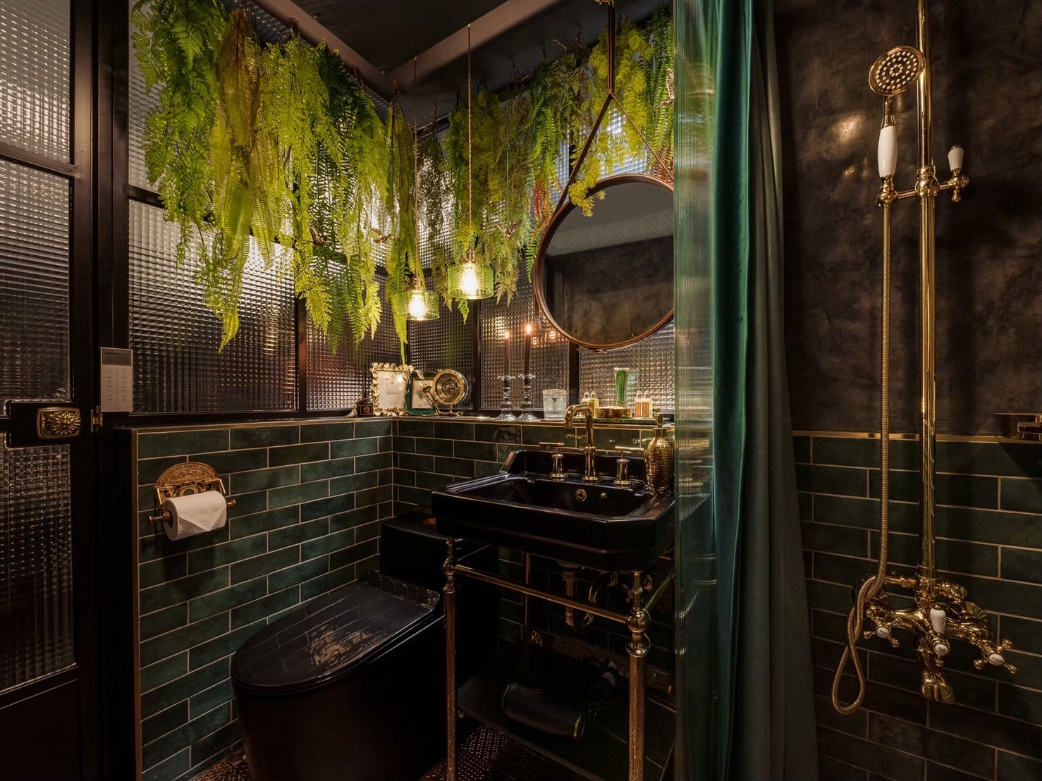 Natural light filters through glass partitions, softening the play of shadow while framing views of greenery. In the bath, emerald tiles meet matte black fixtures and golden accents, transforming function into a sensory experience. From pressed metal to polished brass, textures create rhythm and depth, celebrating craftsmanship. The design becomes more than decoration—it is a carefully orchestrated composition where color, material, and light elevate daily living into timeless luxury.