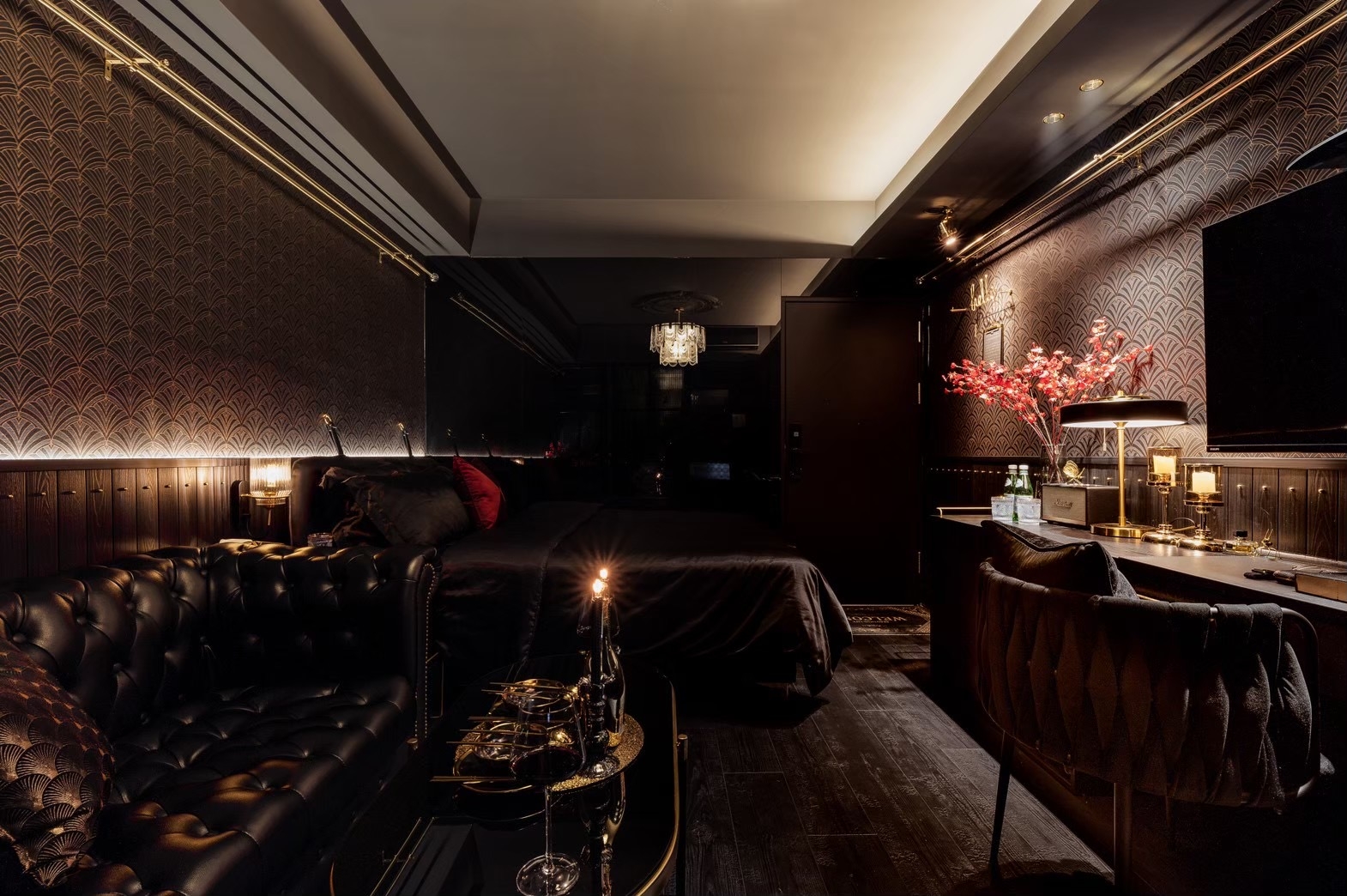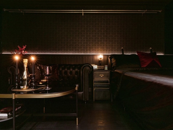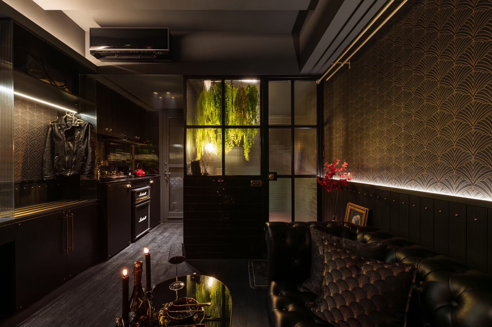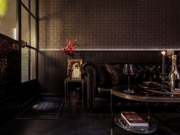 This holiday home is envisioned as an immersive retreat where vintage elegance meets modern luxury. Guided by three symbolic colors—black for mystery and refinement, gold for opulence and achievement, and red for passion and vitality—the palette establishes a sophisticated holiday atmosphere. Every detail reinforces this vision: charred black wood flooring carries the marks of history, brass curtain rods recall the golden age of travel, and rich textiles such as silk, velvet, and jacquard add layers of tactile richness that invite touch and reflect light.