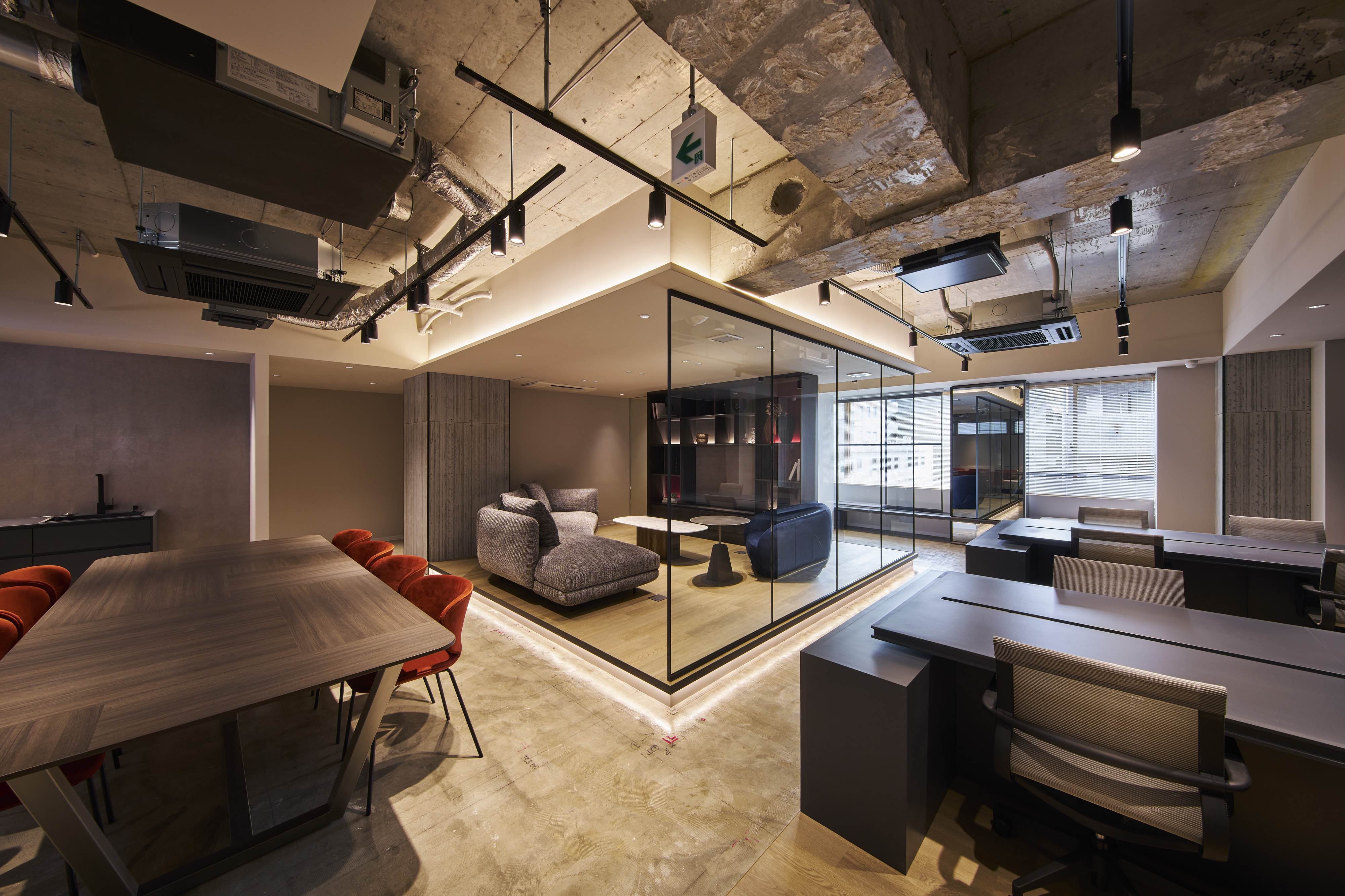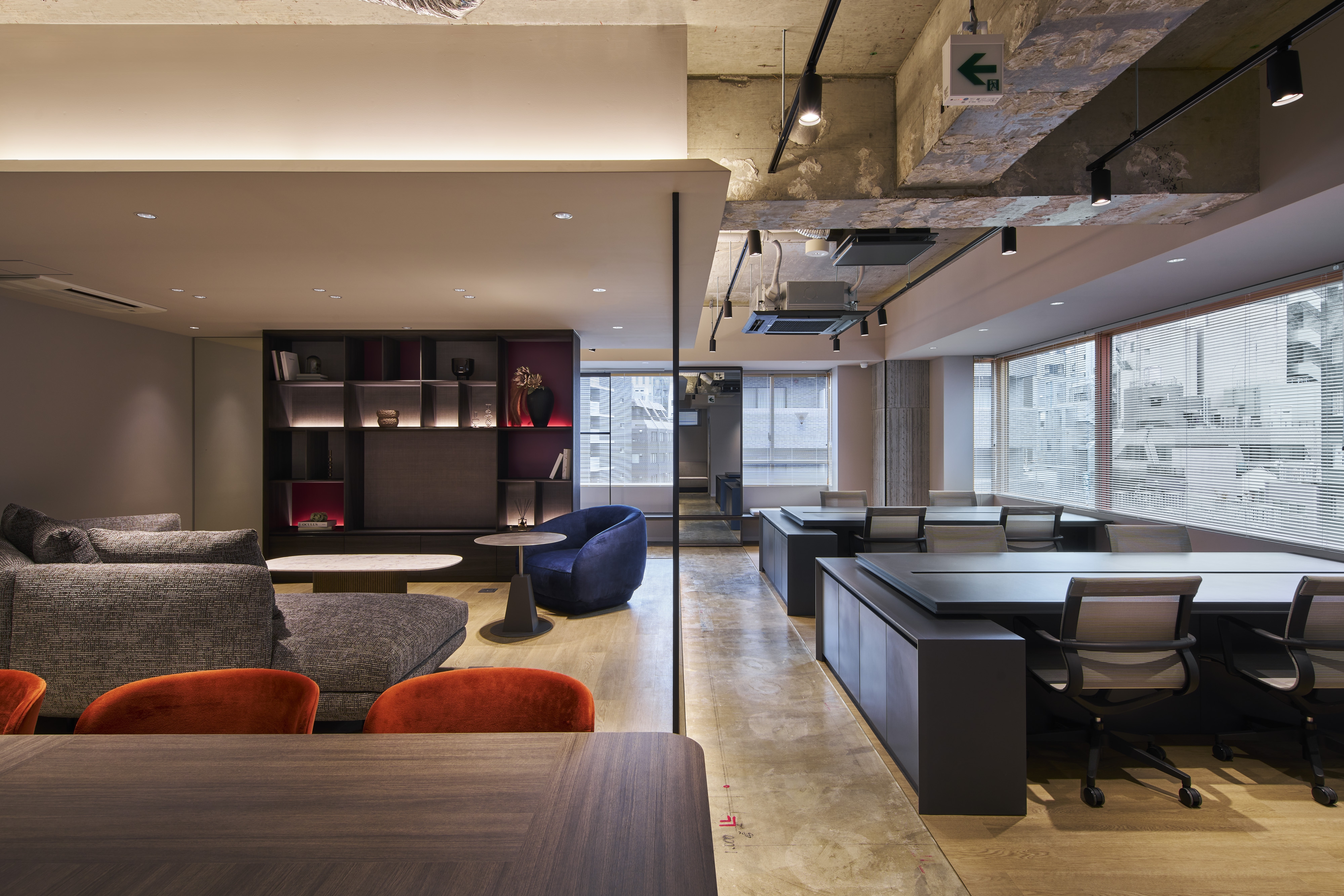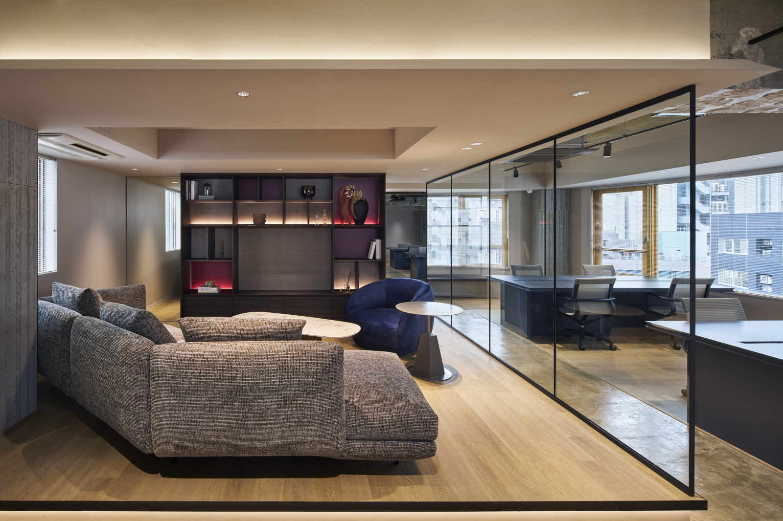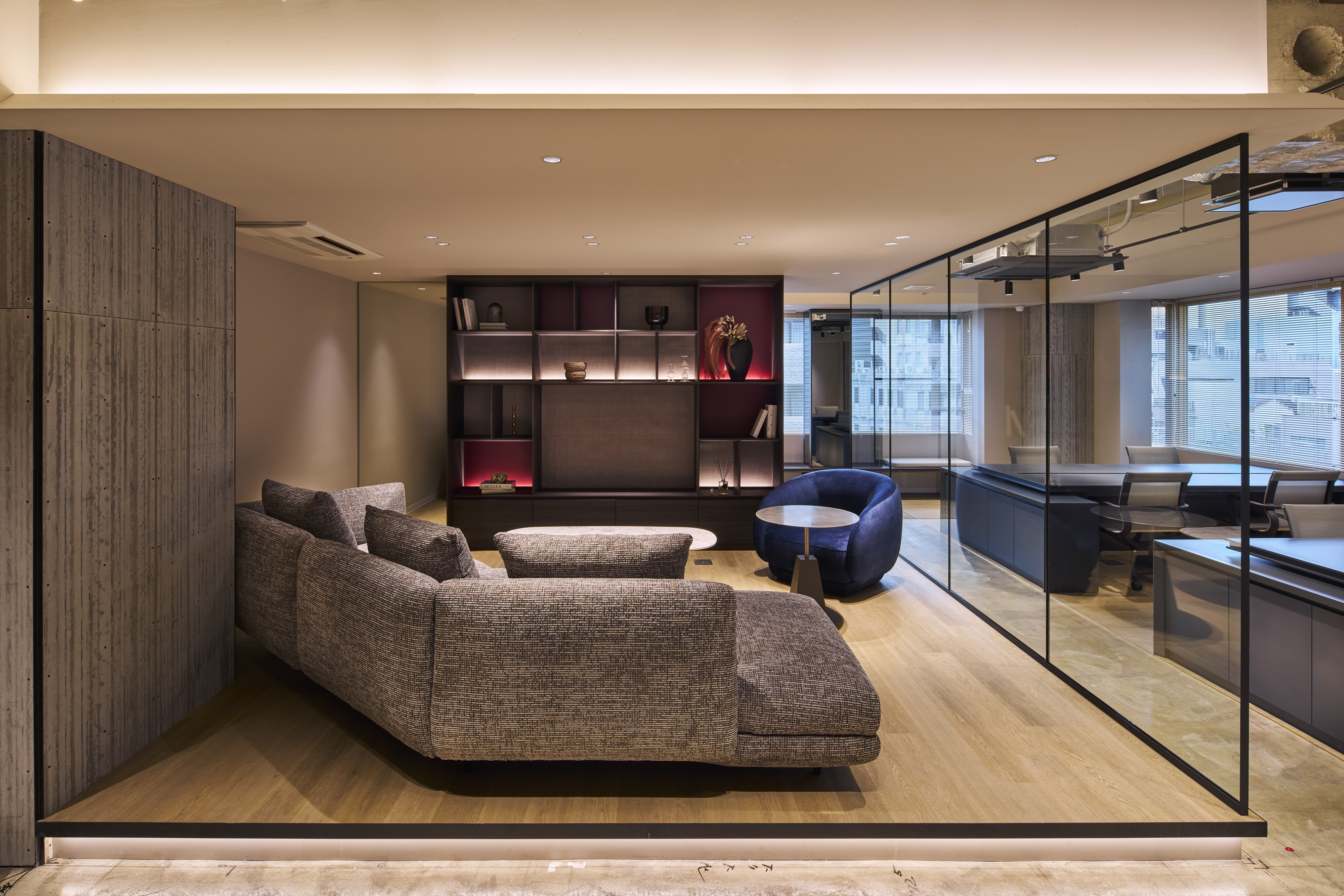 Located in Tokyo, this renovation project explores a new workplace model combining the comfort of residential living with office functionality. The 5th and 7th floors adopt a unique “Living Plan,” where users remove their shoes and transition toward lounge seating and communal tables, offering a home-like experience. Warm materials, a subdued color palette, and soft indirect lighting create a calm atmosphere that encourages creativity and natural communication.