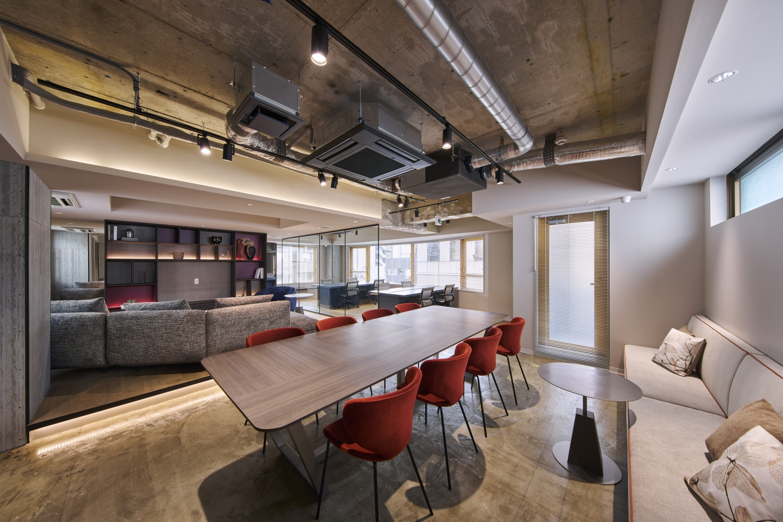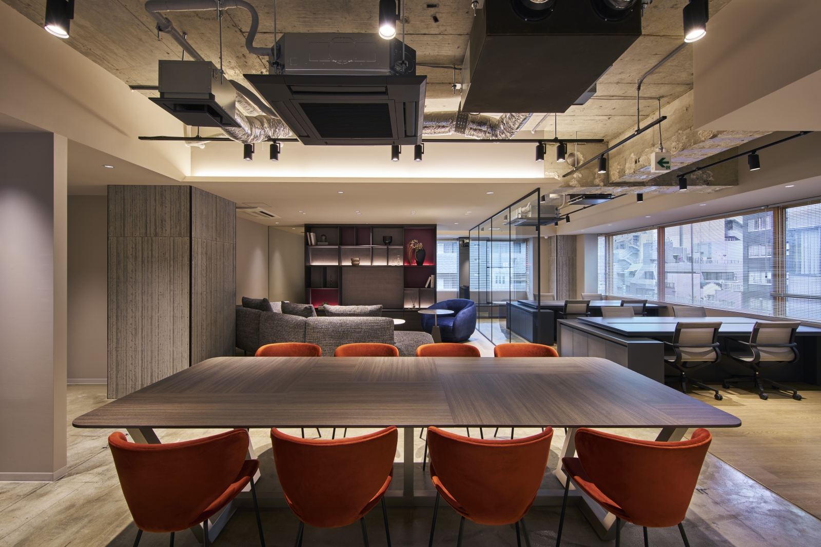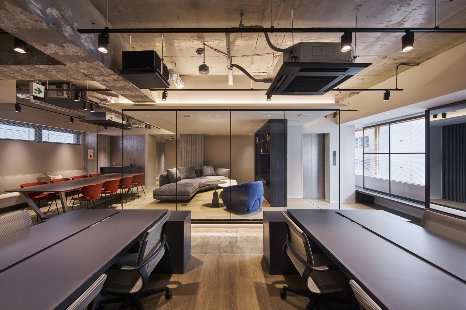 Located in Tokyo, this renovation project explores a new workplace model combining the comfort of residential living with office functionality. The 5th and 7th floors adopt a unique “Living Plan,” where users remove their shoes and transition toward lounge seating and communal tables, offering a home-like experience. Warm materials, a subdued color palette, and soft indirect lighting create a calm atmosphere that encourages creativity and natural communication.
