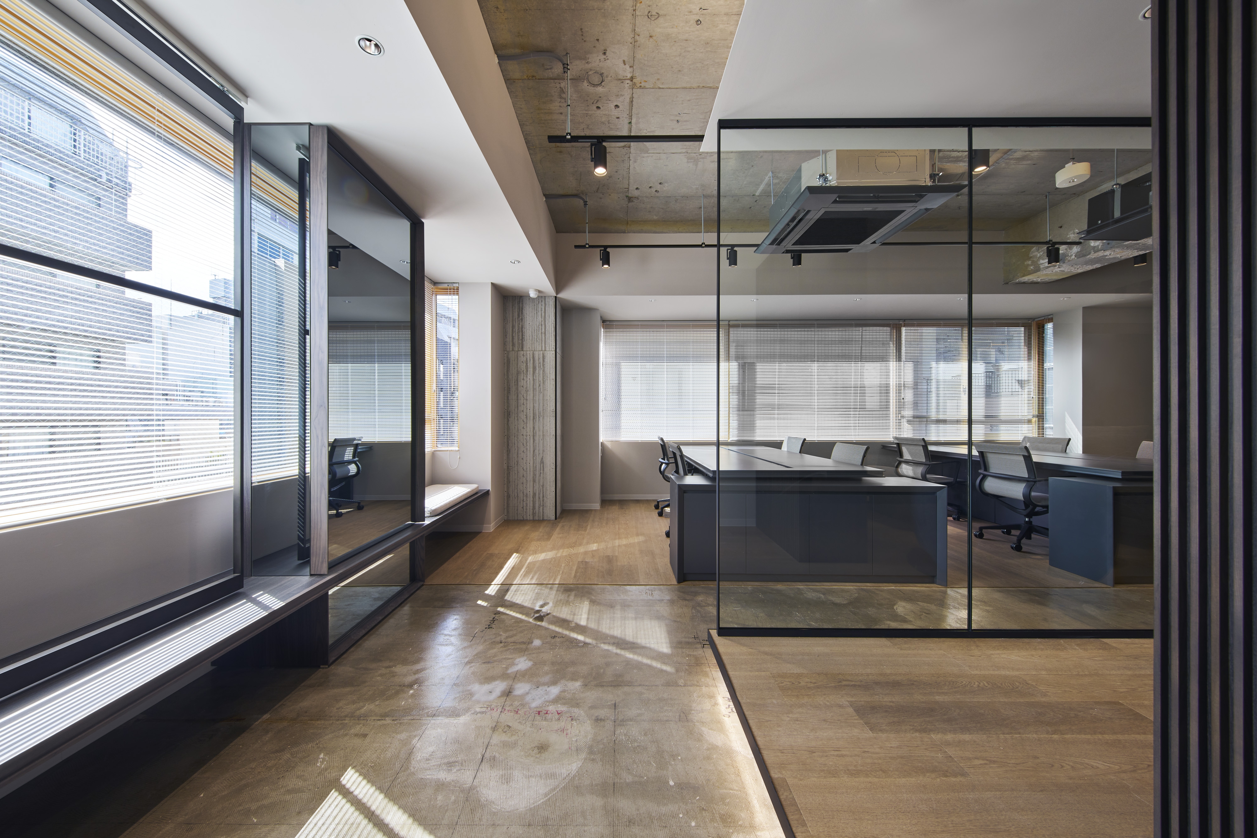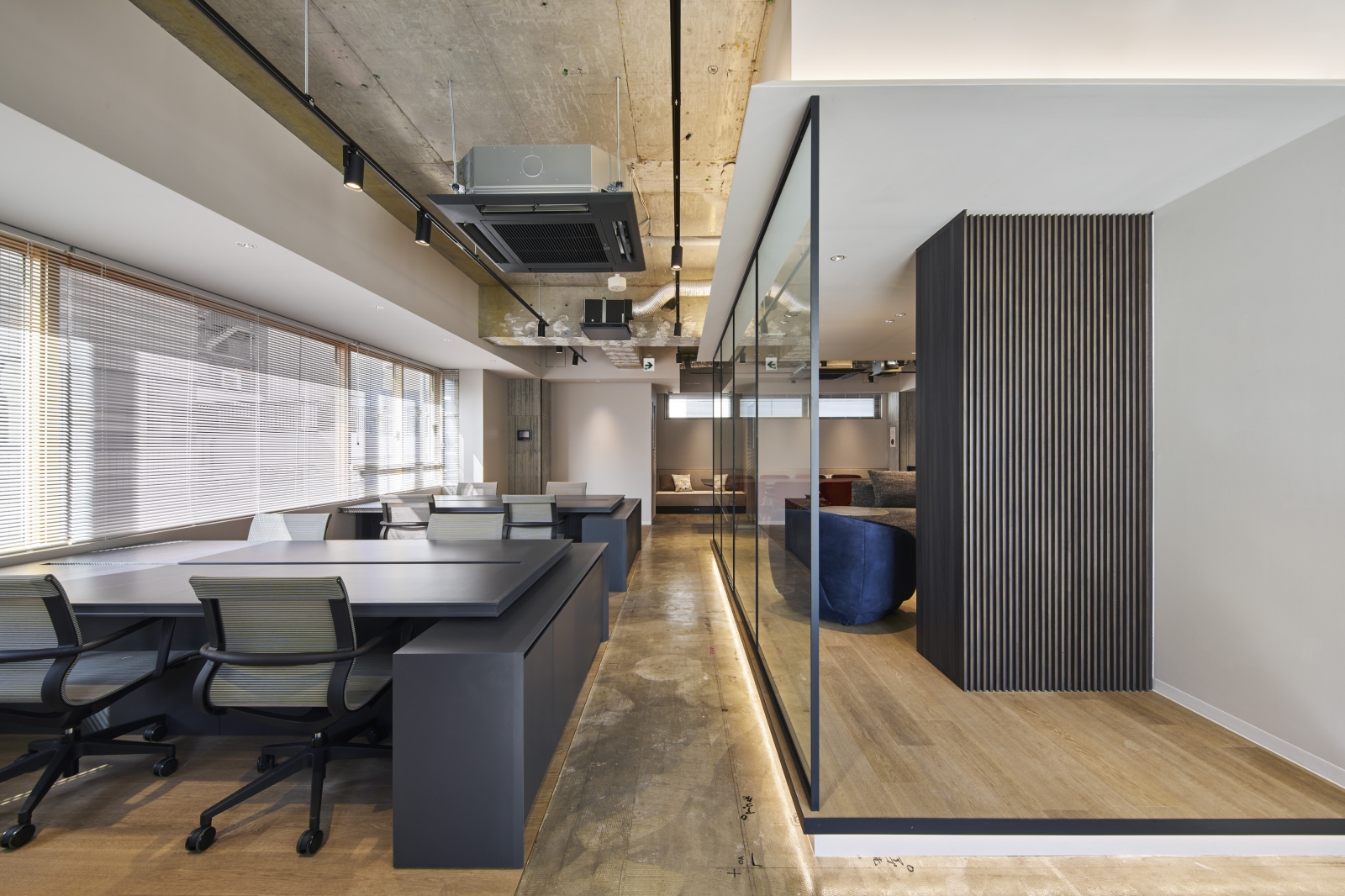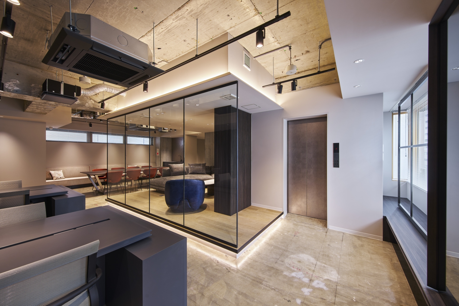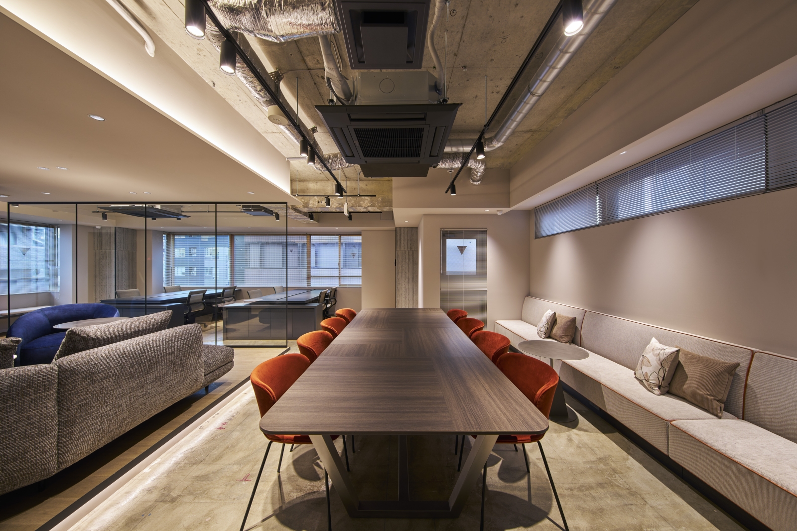 Located in Tokyo, this renovation project explores a new workplace model combining the comfort of residential living with office functionality. The 5th and 7th floors adopt a unique “Living Plan,” where users remove their shoes and transition toward lounge seating and communal tables, offering a home-like experience. Warm materials, a subdued color palette, and soft indirect lighting create a calm atmosphere that encourages creativity and natural communication.