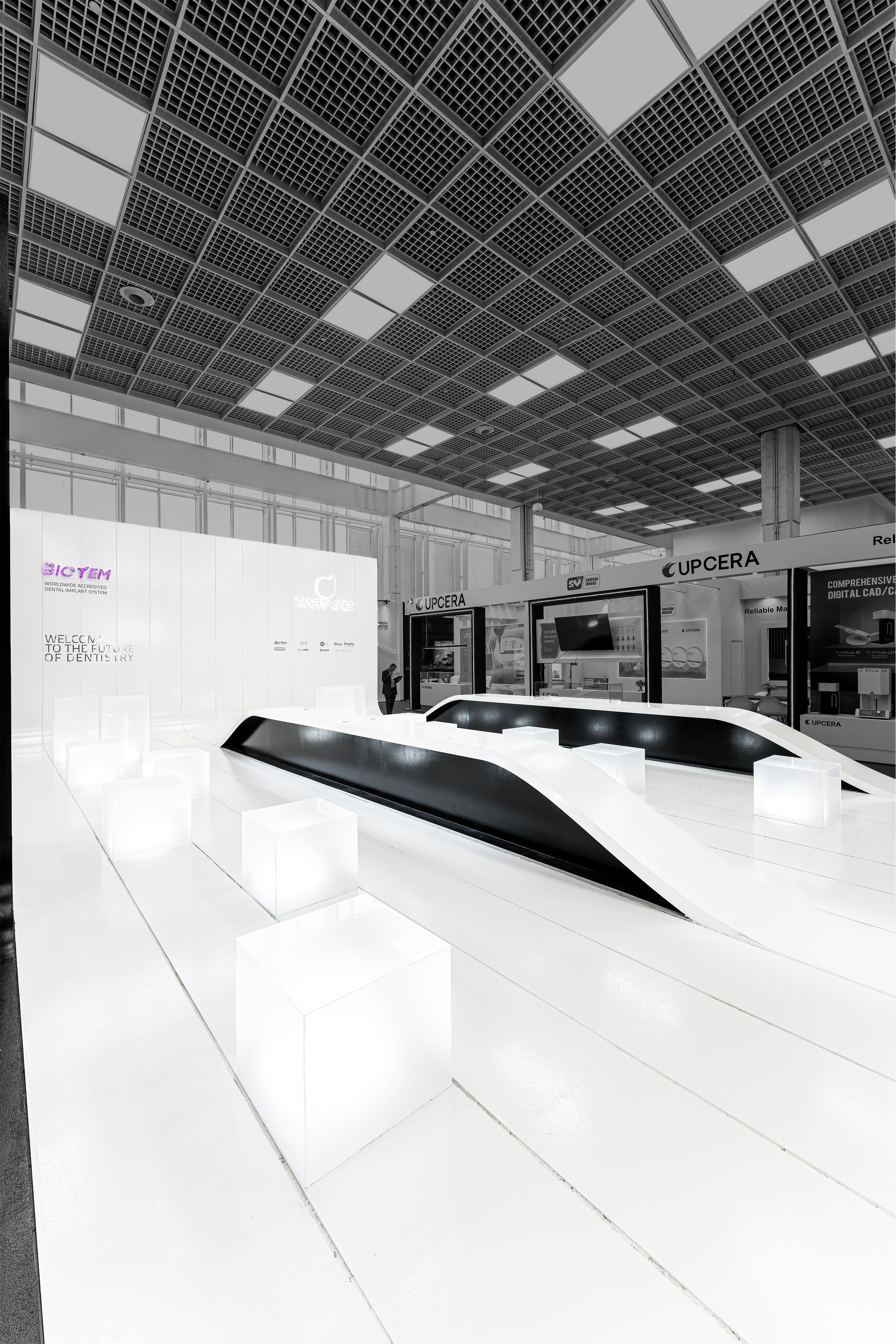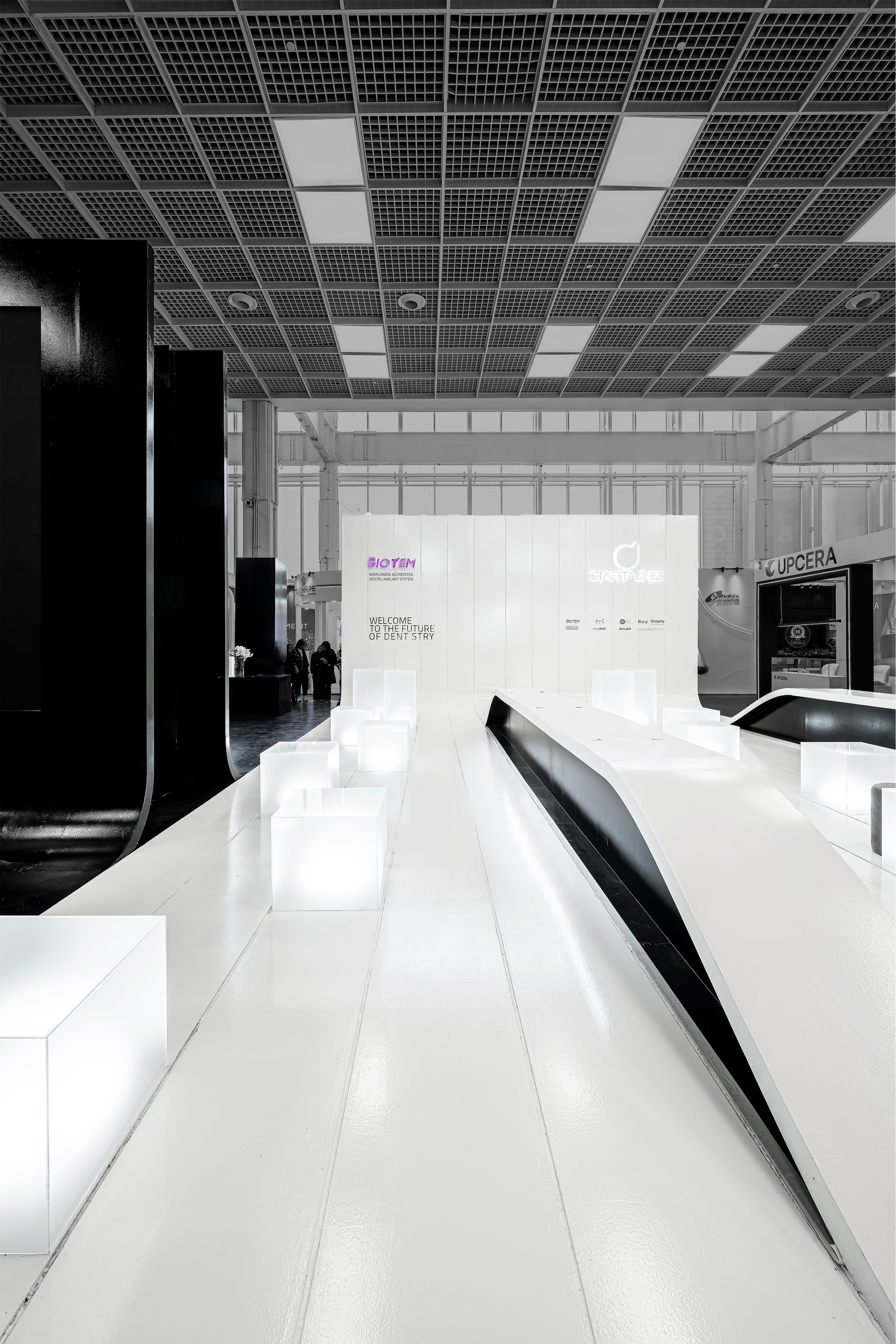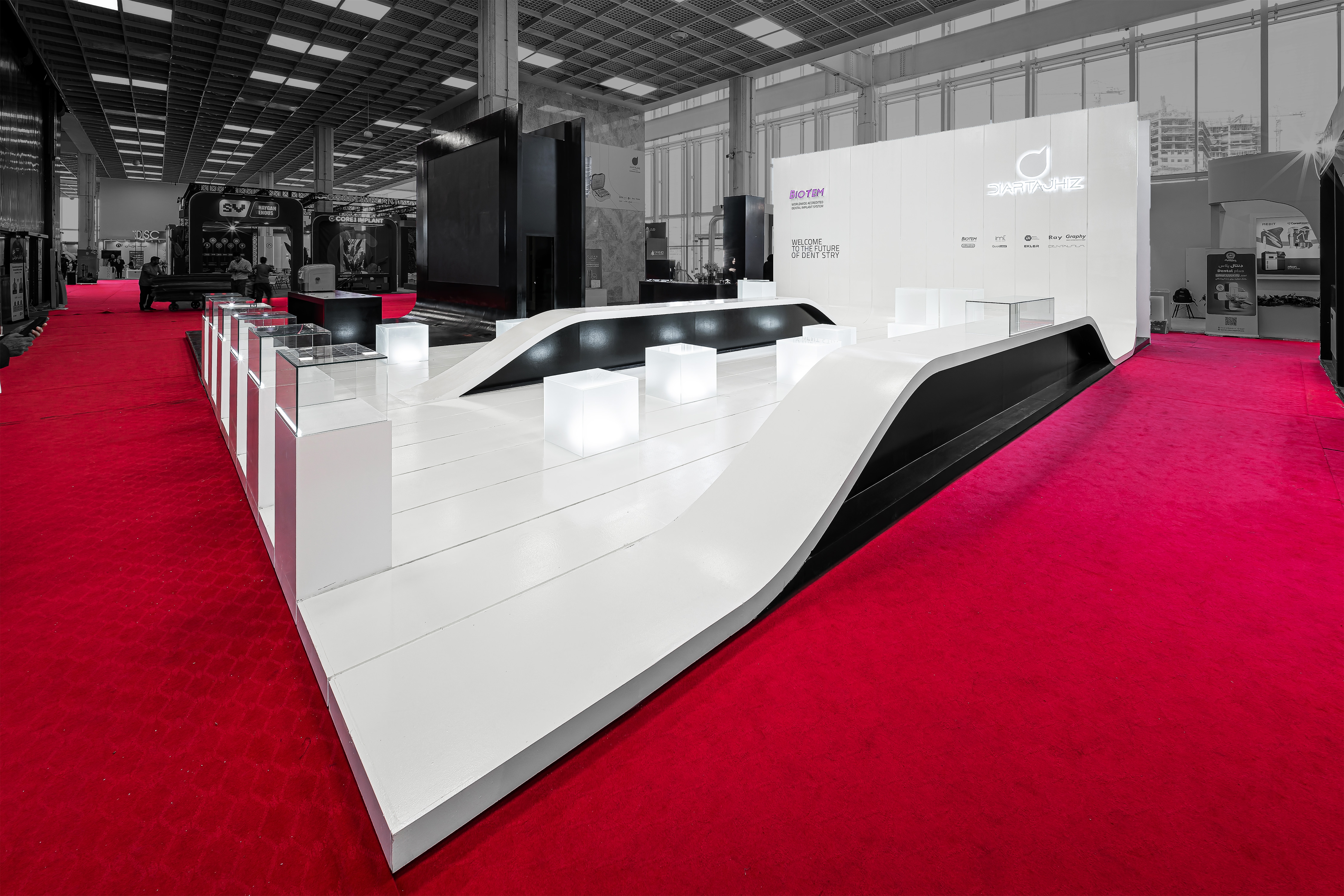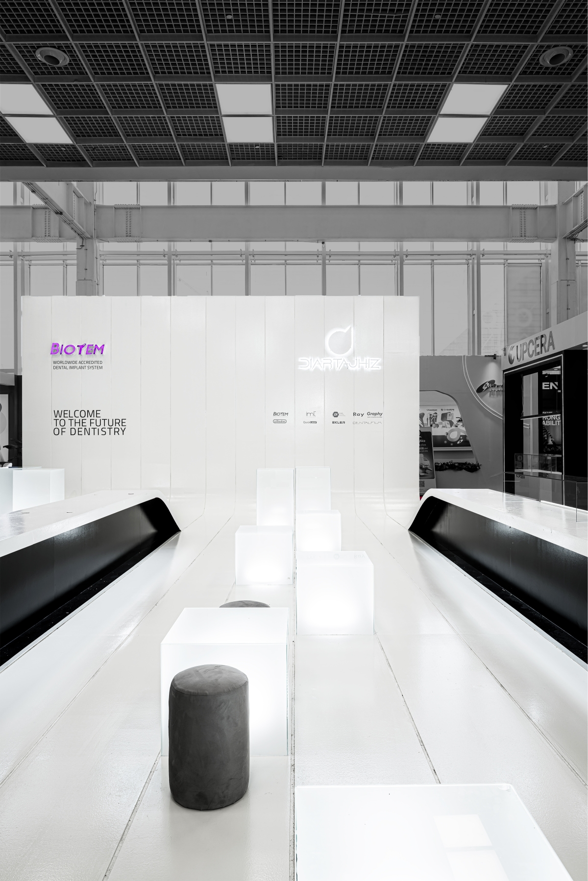 The 203 m² exhibition booth at Iran Mall, Tehran, was designed for a leading dental equipment company to boost brand awareness and sales. The challenge was to create a space that attracted visitors, encouraged dialogue, and supported business agreements.