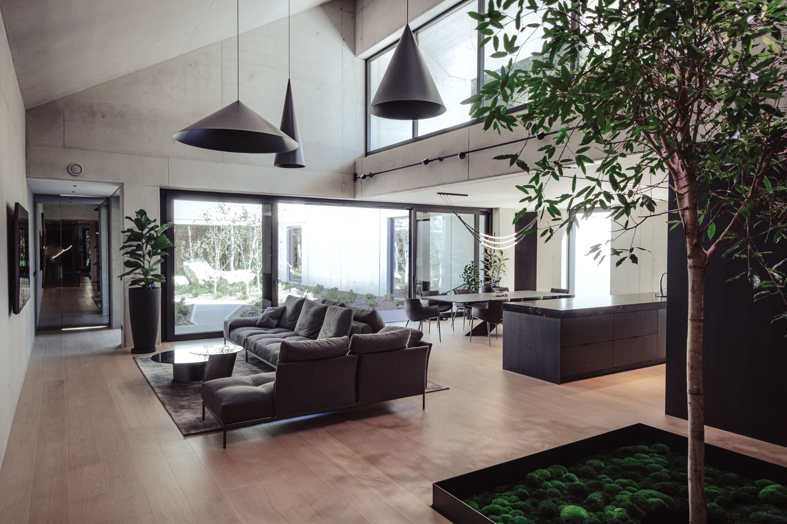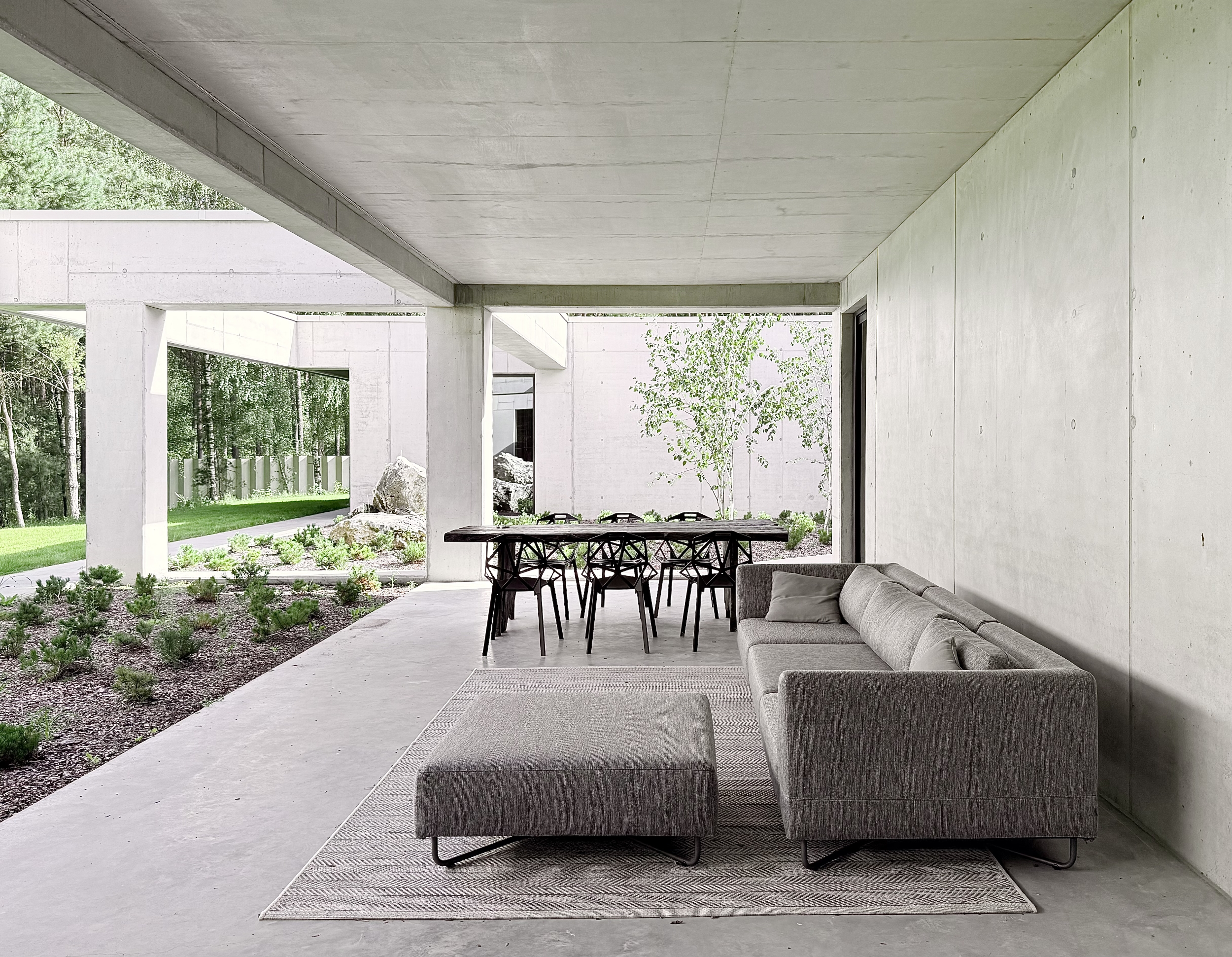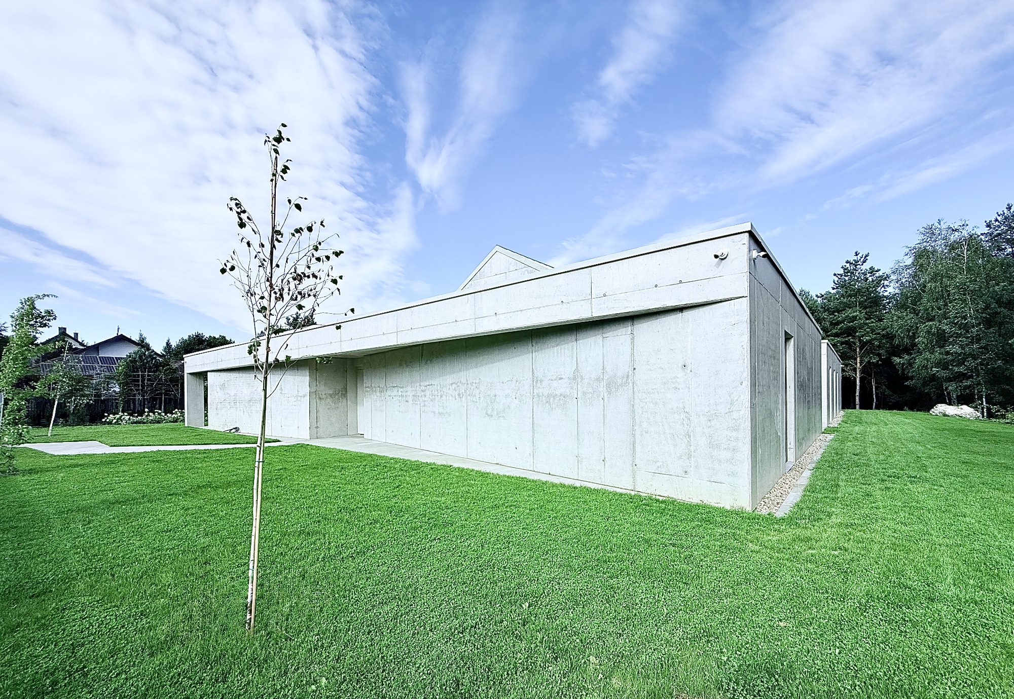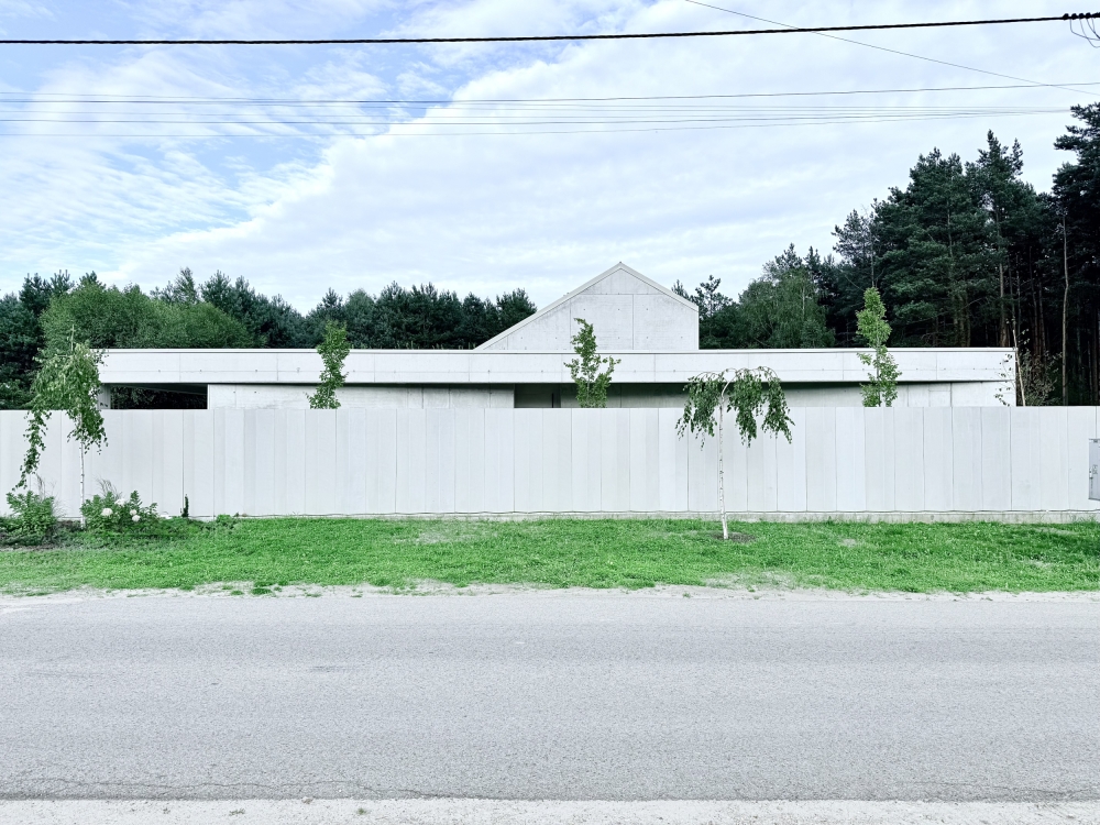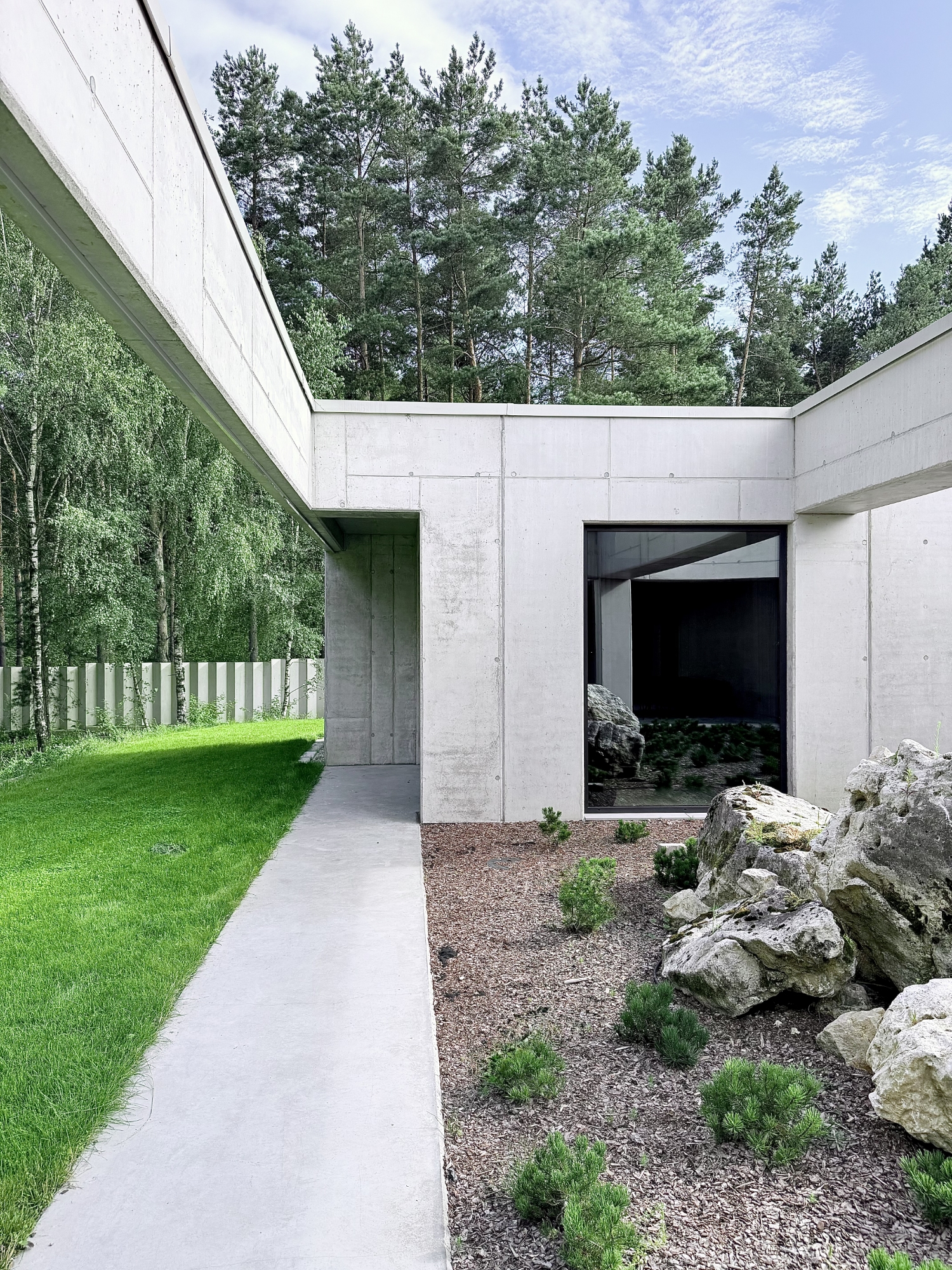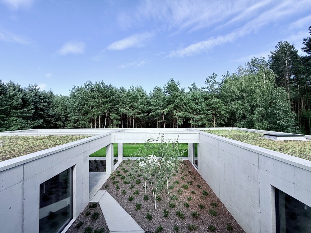 The idea of the project was to create still harsh unchanged monolith, referring to the rocks scattered in the region, which is constantly being complemented by the surrounding nature.The pictures around the house change in the rhythm of seasons, weather conditions, day and night cycles.Therefore the house interiors are flexibly exposed to the influence of the surrounding environment and adopt nature decorations through spacious windows and skylights.Images change cyclically giving the interiors unpredictable sets of colors and shades.Moving around the building you are welcome to admire different views and perspectives. Entrance to the house is located from the street side, the front elevation was broken inside indicating in a symbolic way its place. The house is similar to a broken rock, in the interior where, like in a cave, you can hide from the storm.The building's construction frame has appointed additional rooms outside. Green frames of the garden complement the raw architecture, allowing for a little reflection and meditation. Structural divisions, internal patios, green courtyards and terraces among the tops of the trees give the opportunity to rediscover the house.