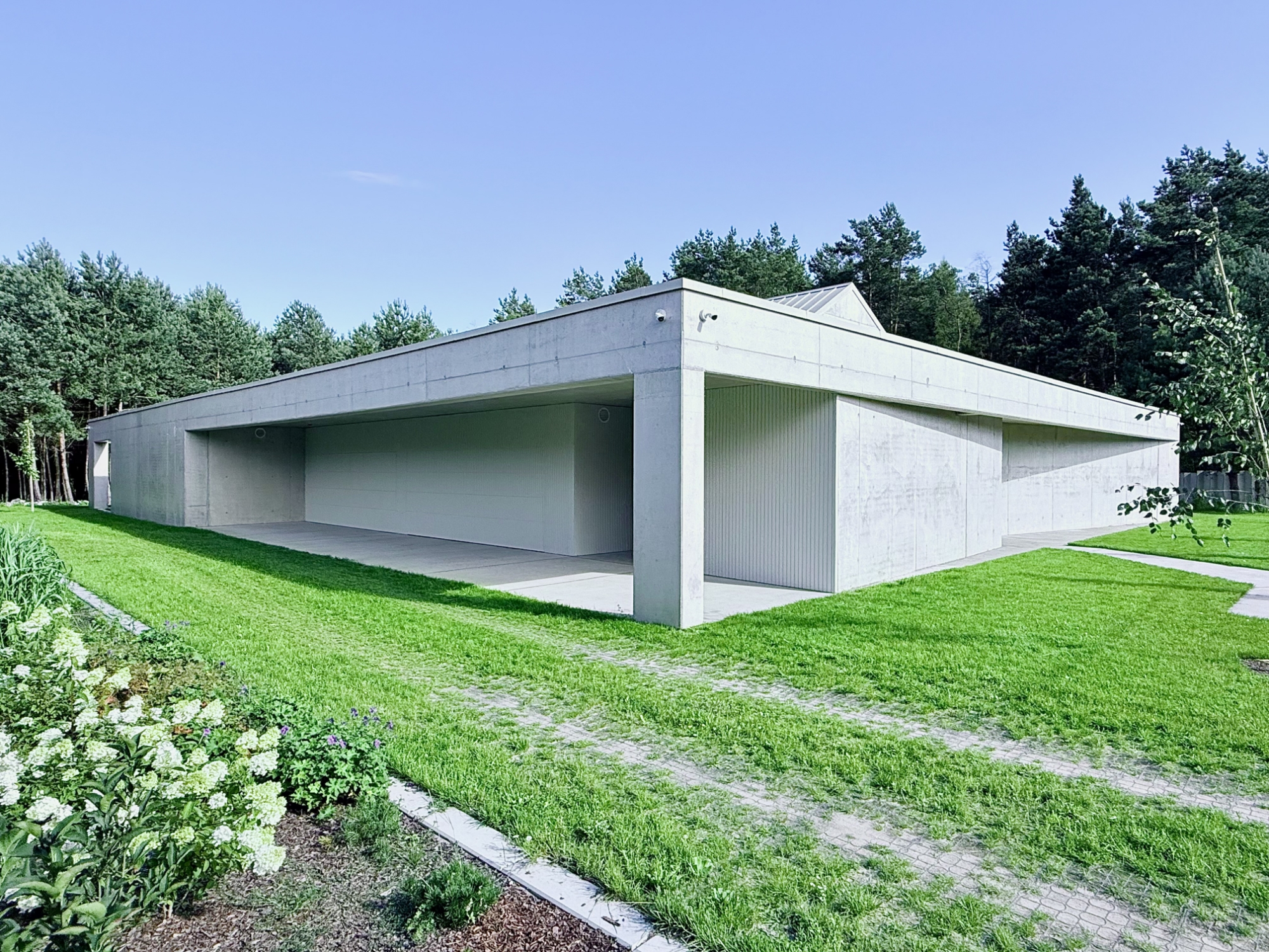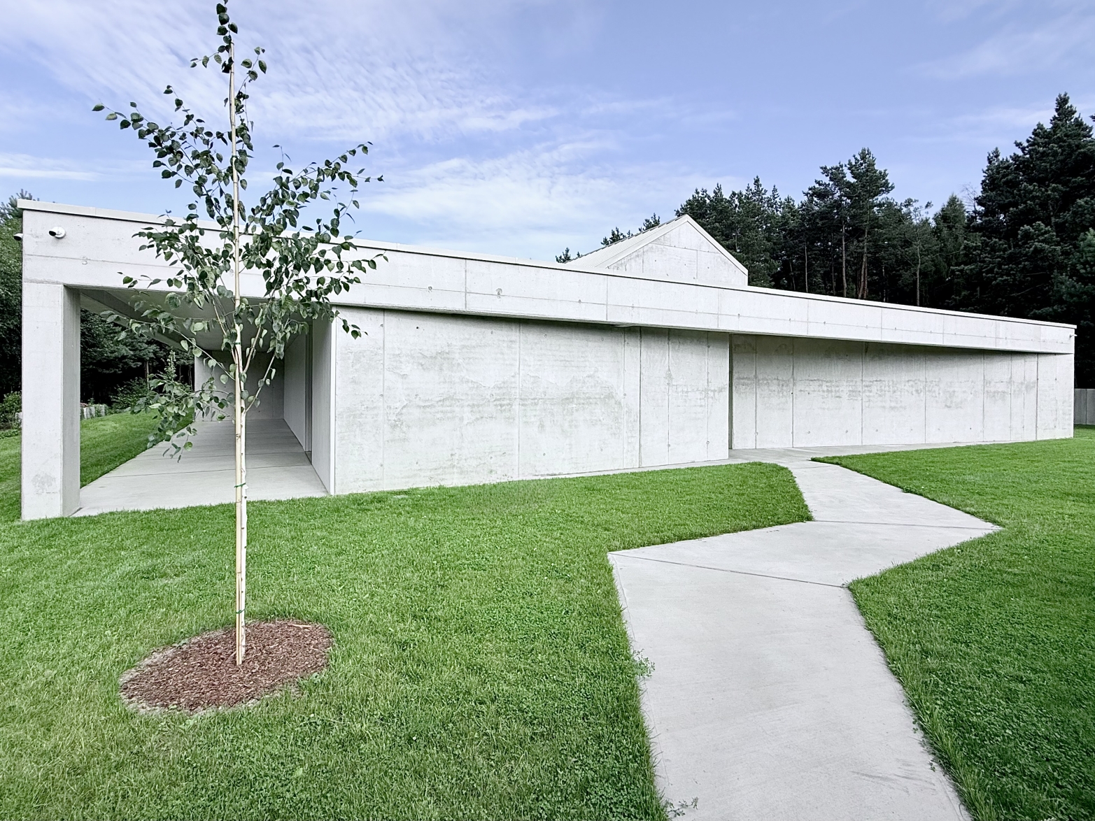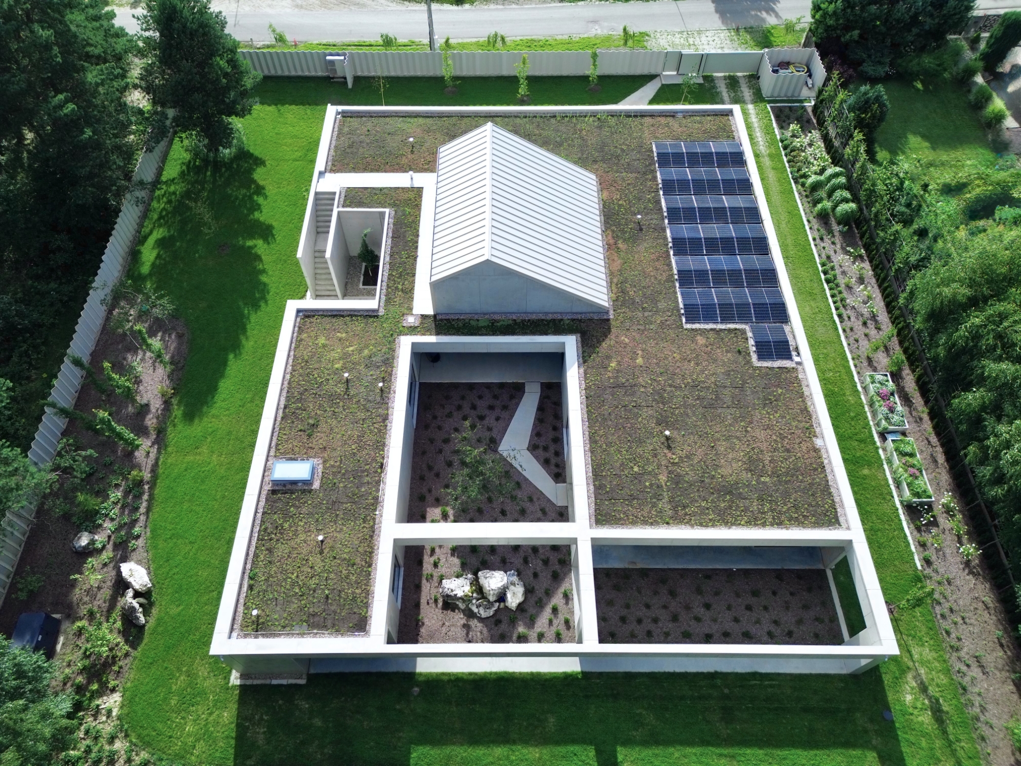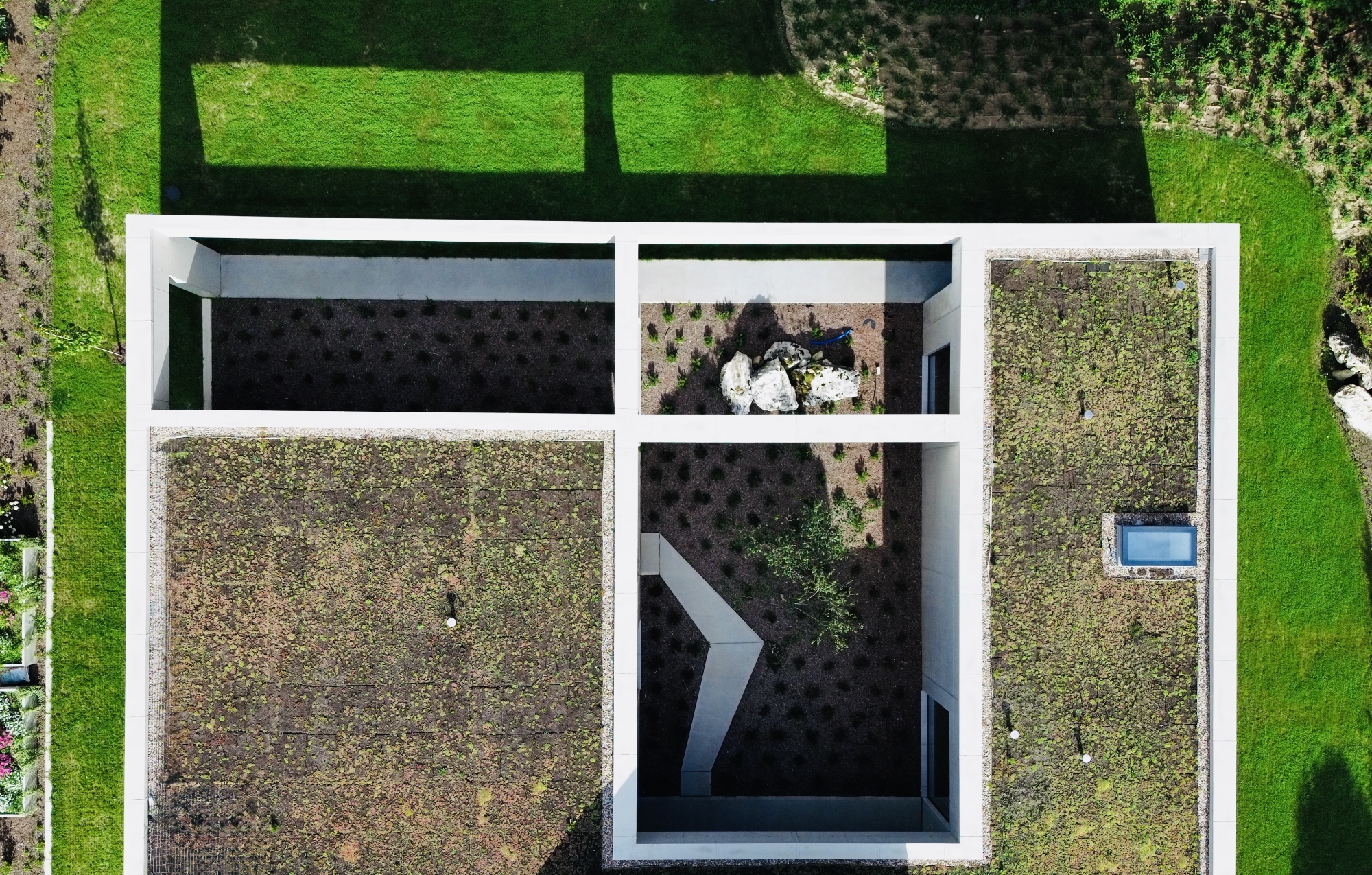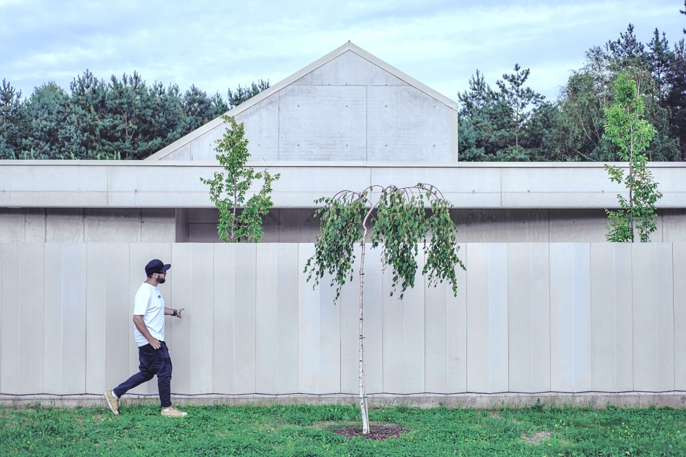 The idea of the project was to create still harsh unchanged monolith, referring to the rocks scattered in the region, which is constantly being complemented by the surrounding nature.The pictures around the house change in the rhythm of seasons, weather conditions, day and night cycles.Therefore the house interiors are flexibly exposed to the influence of the surrounding environment and adopt nature decorations through spacious windows and skylights.Images change cyclically giving the interiors unpredictable sets of colors and shades.Moving around the building you are welcome to admire different views and perspectives. Entrance to the house is located from the street side, the front elevation was broken inside indicating in a symbolic way its place. The house is similar to a broken rock, in the interior where, like in a cave, you can hide from the storm.The building's construction frame has appointed additional rooms outside. Green frames of the garden complement the raw architecture, allowing for a little reflection and meditation. Structural divisions, internal patios, green courtyards and terraces among the tops of the trees give the opportunity to rediscover the house.