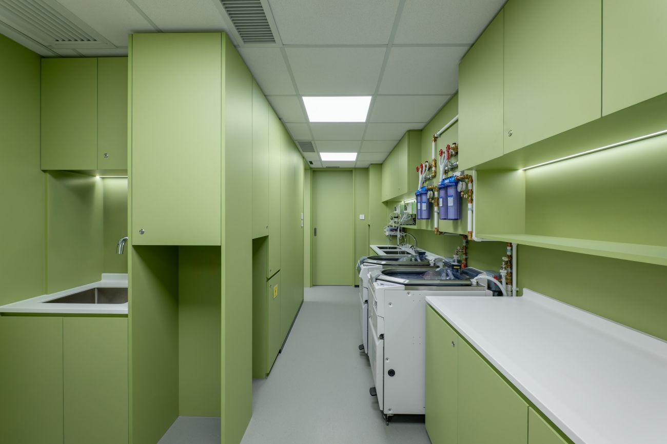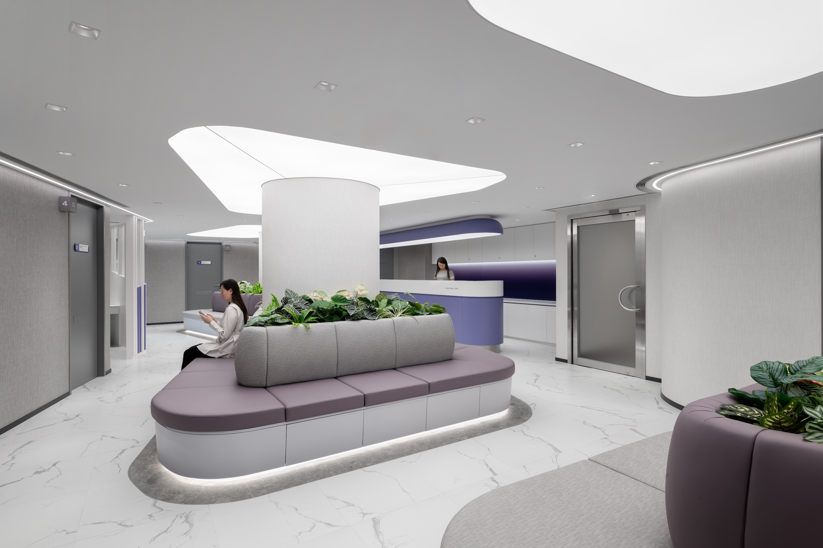 Function and beauty intertwine throughout. Terrazzo floors create a continuous riverbed, while a colour-coded wayfinding system is derived from the client’s brand palette. Each zone is introduced through gradient glass in the corresponding hue, guiding patients with clarity. Biophilic curves and calming aromatherapy enhance the restorative atmosphere, placing well-being at the heart of the design.