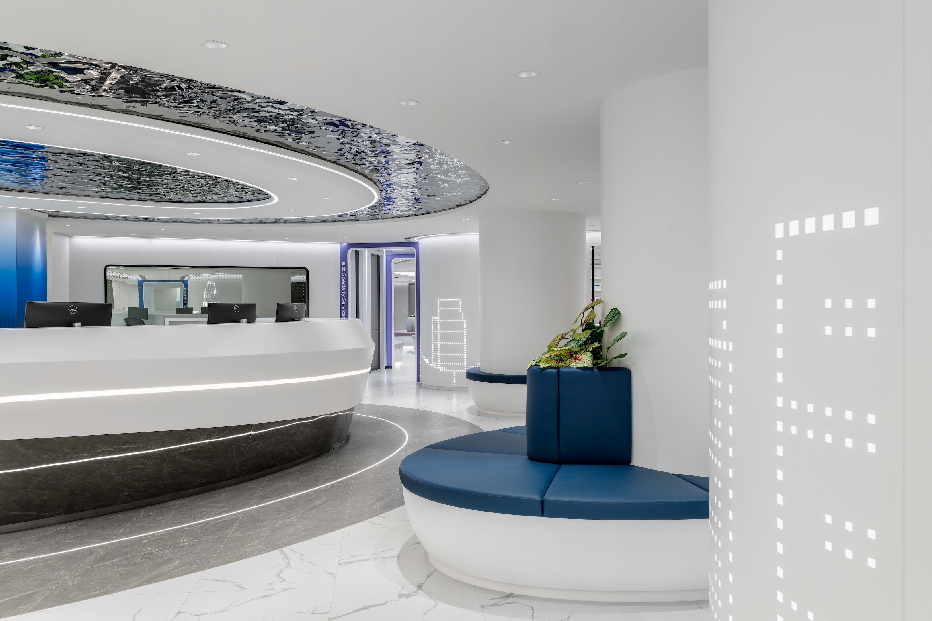 The journey begins at a striking reception, where a shimmering aluminium ceiling suggests the fluidity of water, complemented by a custom LED Hong Kong skyline and a sweeping counter that warmly welcomes visitors.