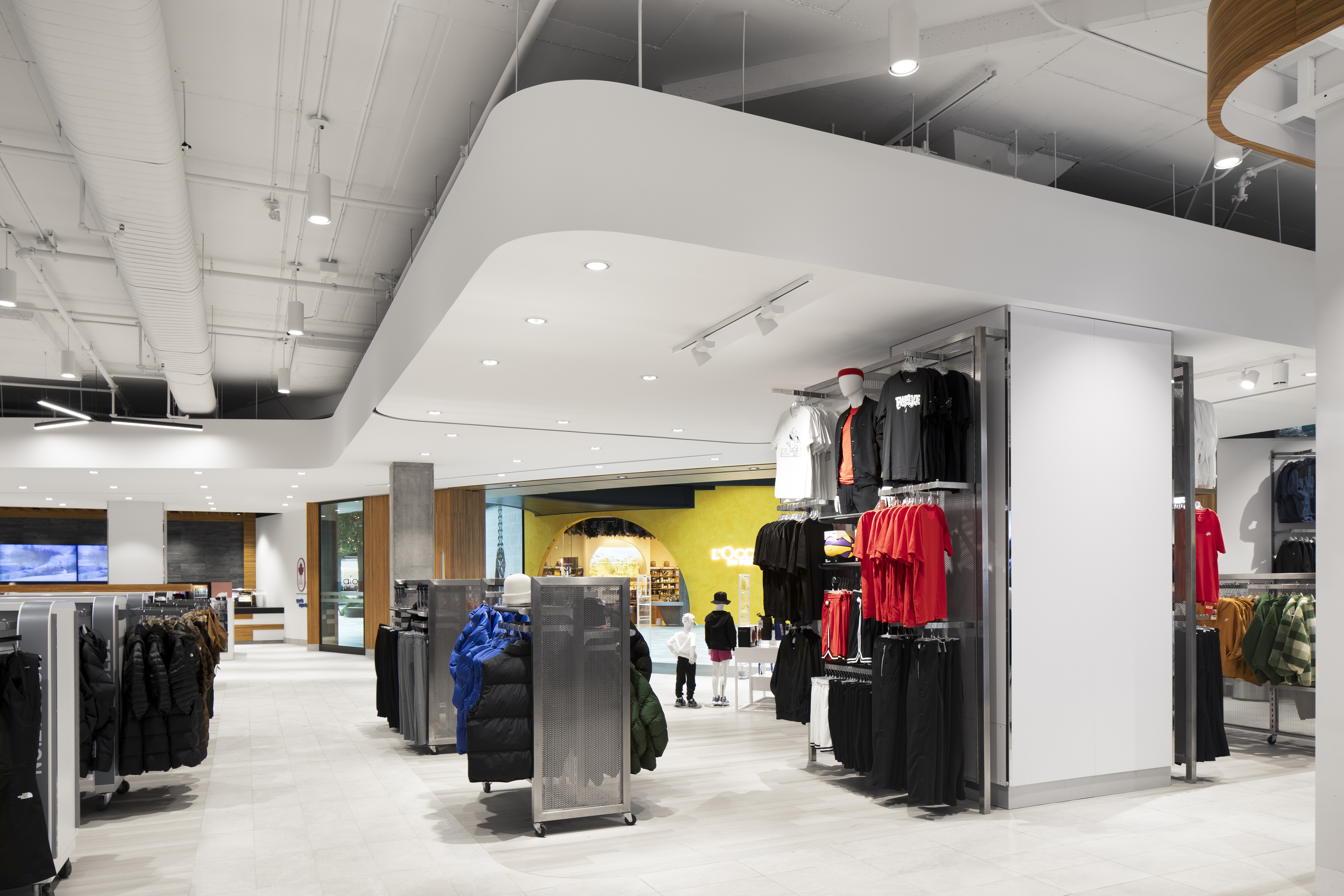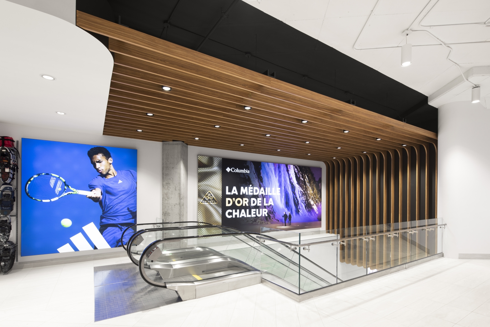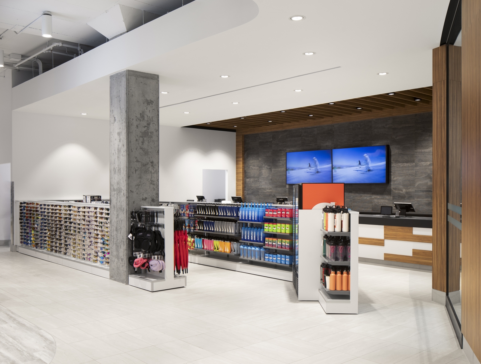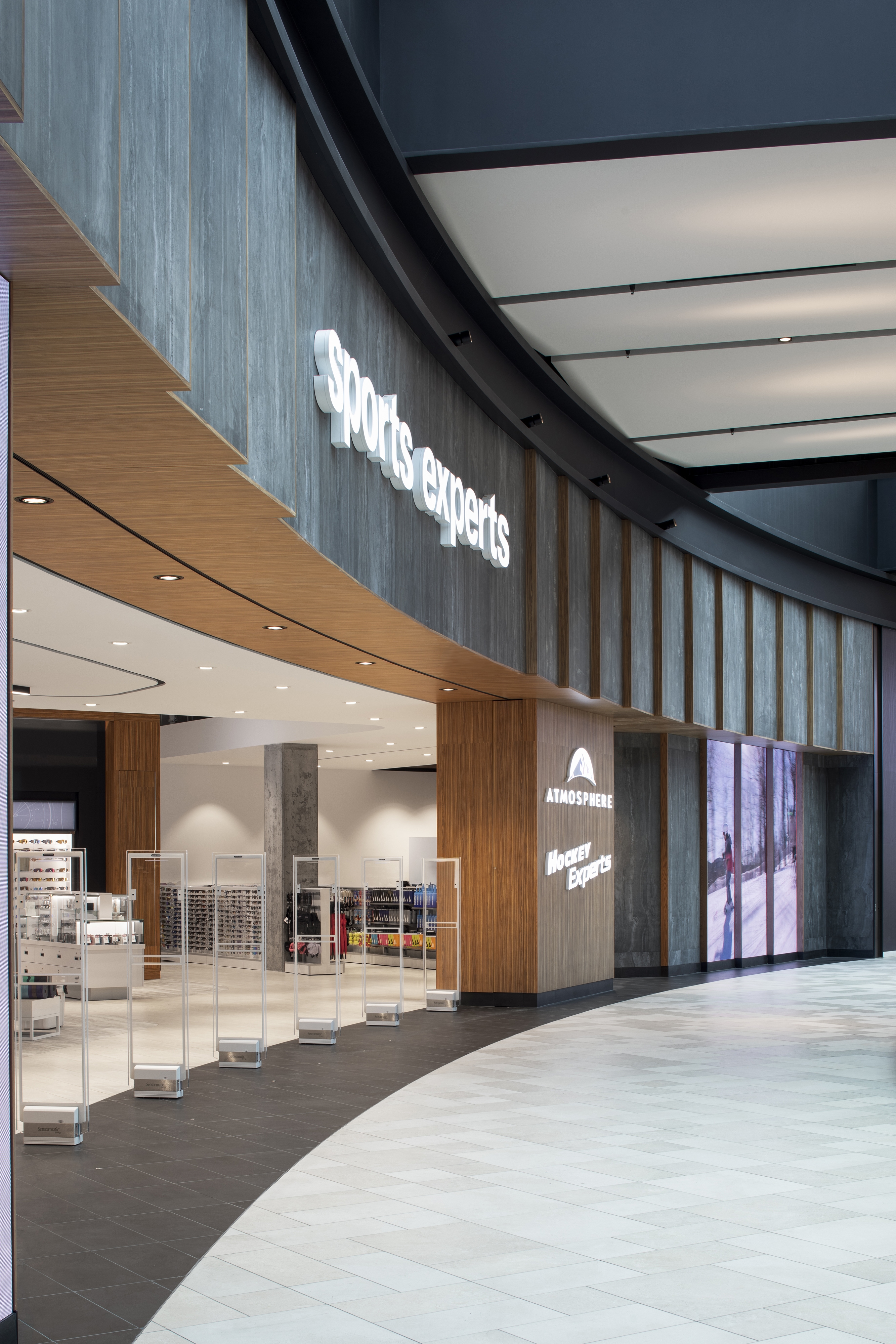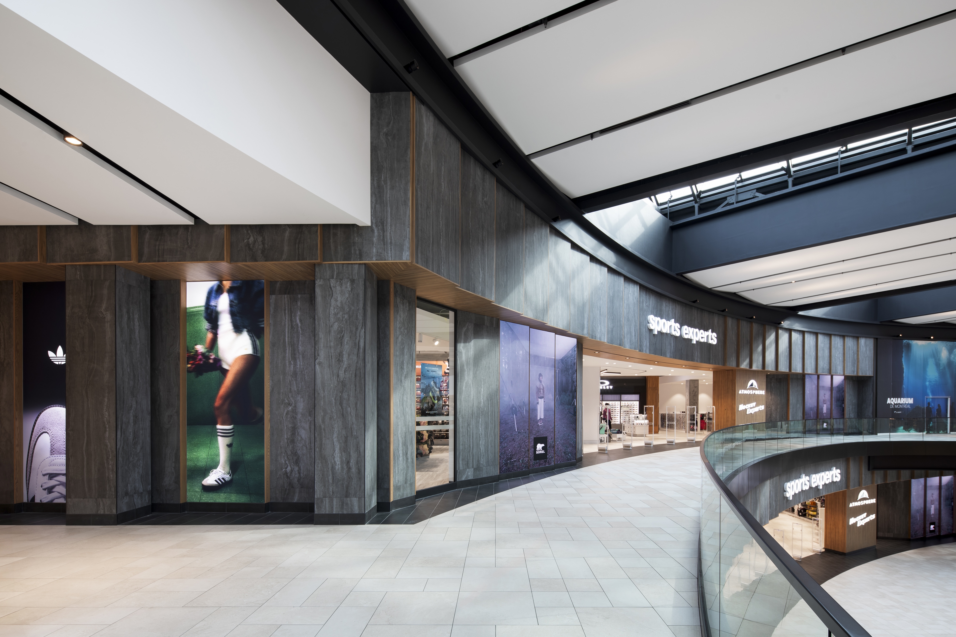 The façade design resolves all conflictual issues. Folding surfaces of wood and stone proceed with ease across the multiple surface configurations and heights. The intentional climbing cliff imagery of the façade design resonates with the natural outdoor world where so much of sporting activities take place. Critical for the merchandise floors was the positioning of elevators and escalators within the building structure to ensure maximum fluidity for vertical and horizontal clientele movements. Similarly essential were delivery dock and conveyor systems for internal merchandise operations. The spatial layout was refined in 35 merchandise zones along walls and on center floor islands providing noticeable visibility to all collections and product categories. Strategically within this gameplan are 15 specially designed feature concepts that harbor and highlight the most sought after retail brands. Ultimately, a powerfully recognizable and uncompromising design concept, and enticing marketing brand image is brought into being.