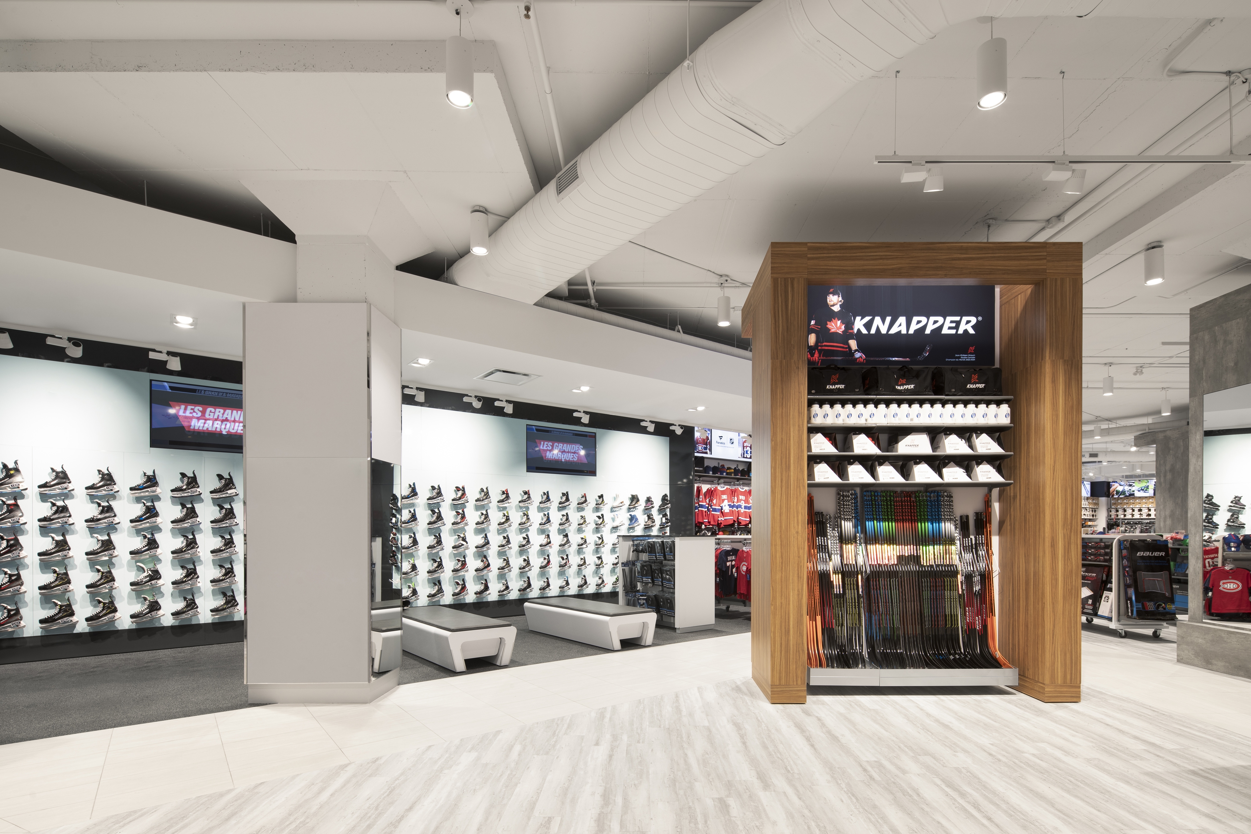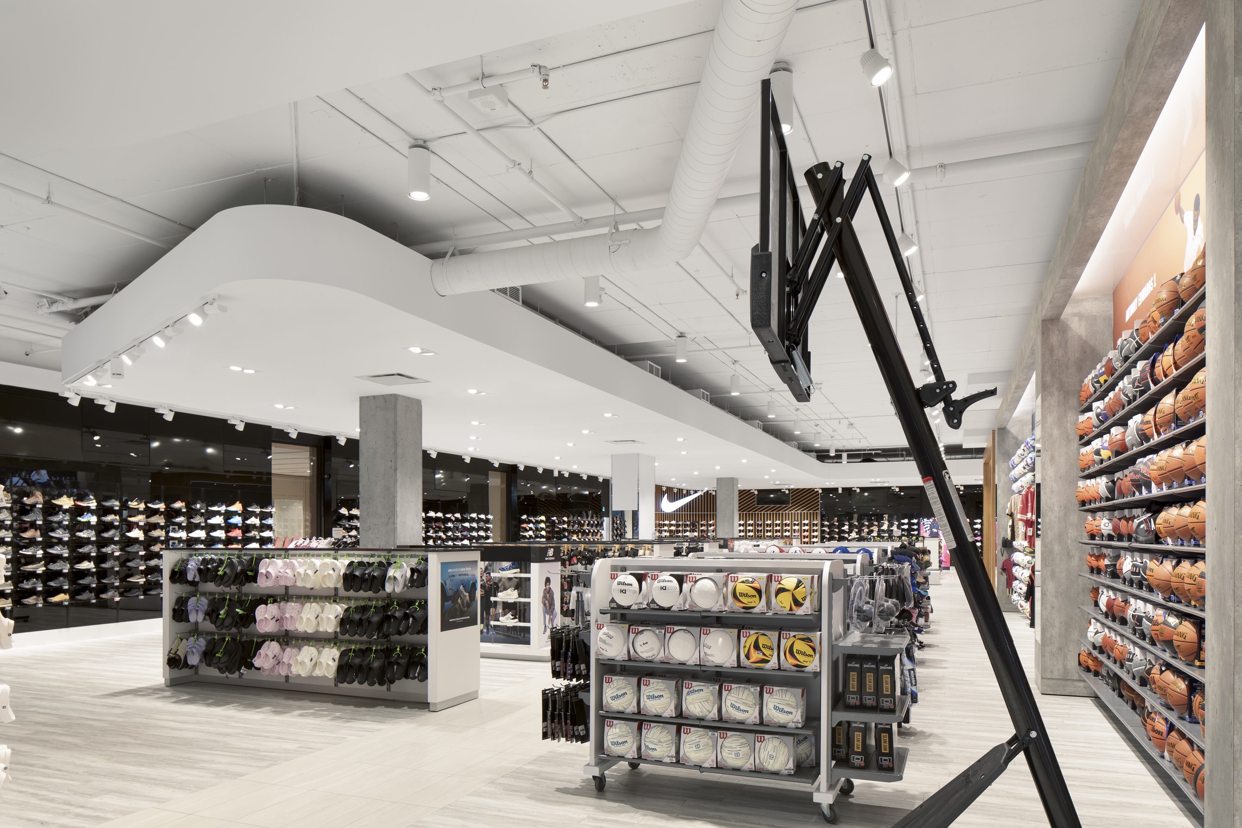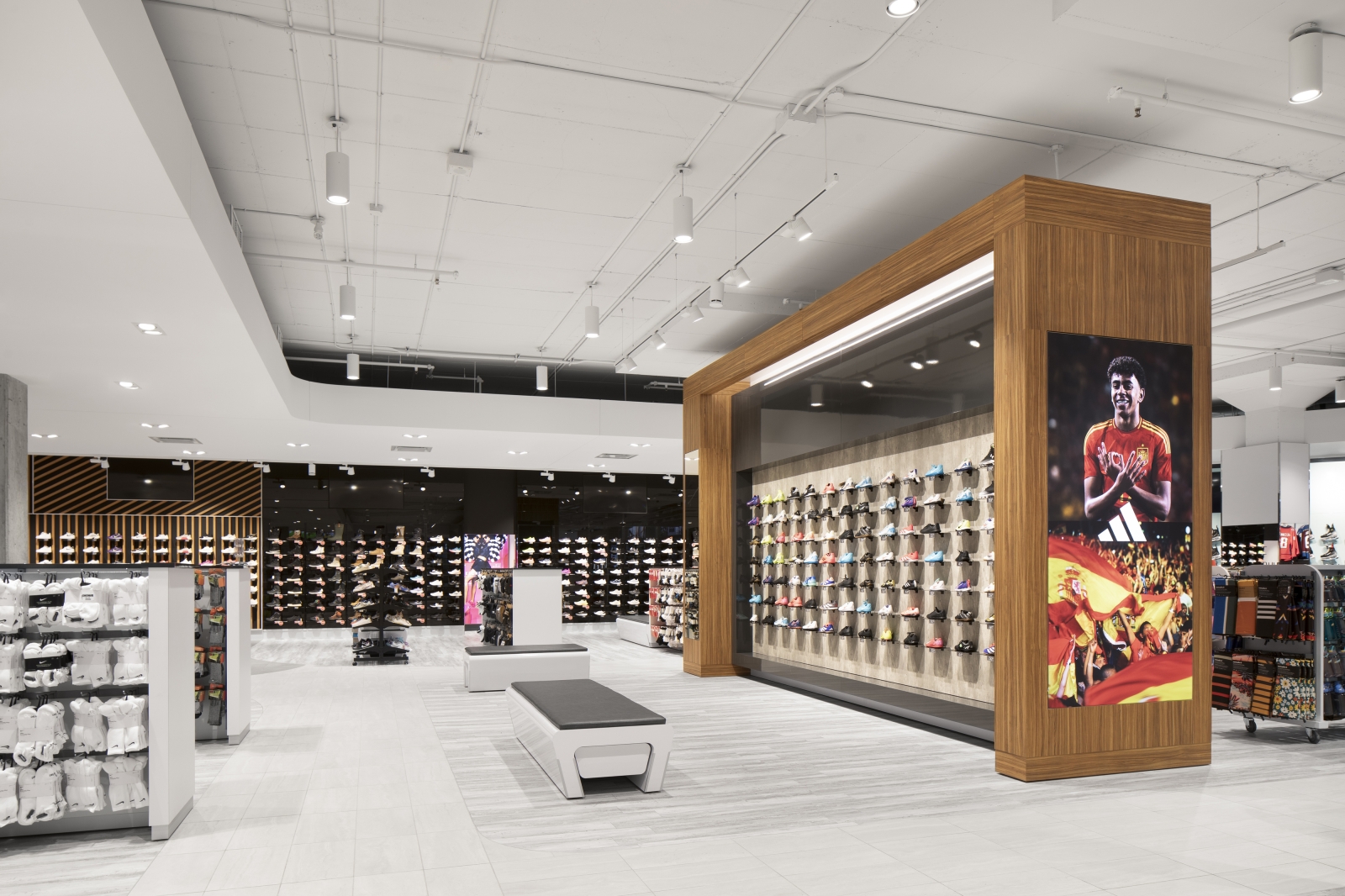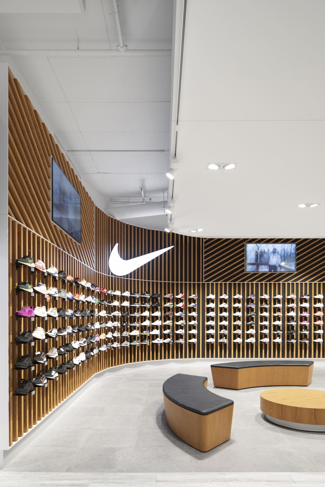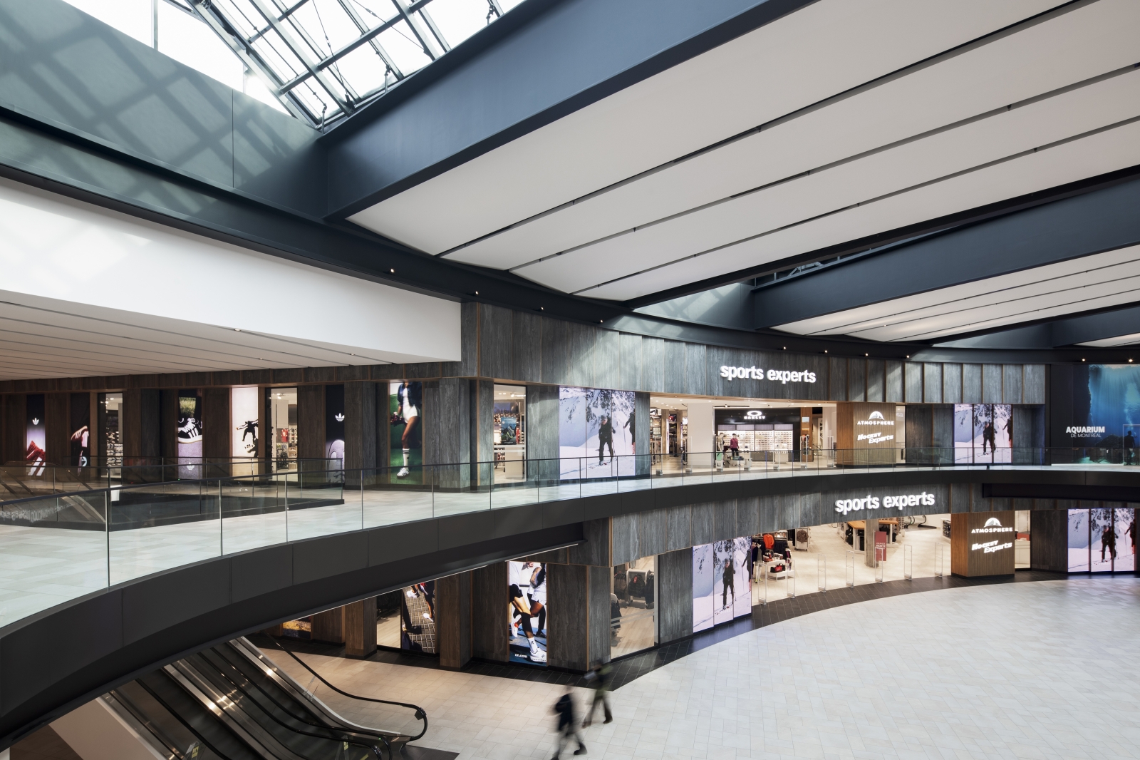 The façade design resolves all conflictual issues. Folding surfaces of wood and stone proceed with ease across the multiple surface configurations and heights. The intentional climbing cliff imagery of the façade design resonates with the natural outdoor world where so much of sporting activities take place. Critical for the merchandise floors was the positioning of elevators and escalators within the building structure to ensure maximum fluidity for vertical and horizontal clientele movements. Similarly essential were delivery dock and conveyor systems for internal merchandise operations. The spatial layout was refined in 35 merchandise zones along walls and on center floor islands providing noticeable visibility to all collections and product categories. Strategically within this gameplan are 15 specially designed feature concepts that harbor and highlight the most sought after retail brands. Ultimately, a powerfully recognizable and uncompromising design concept, and enticing marketing brand image is brought into being.