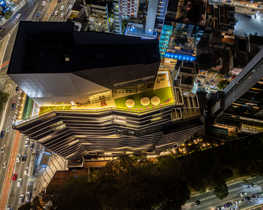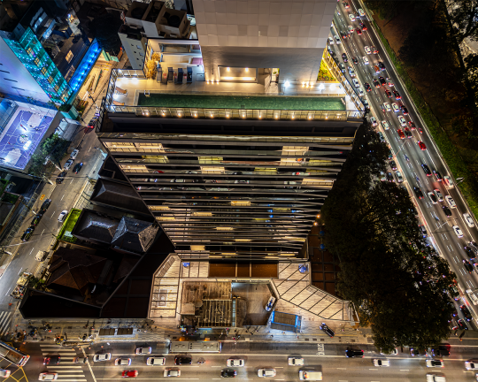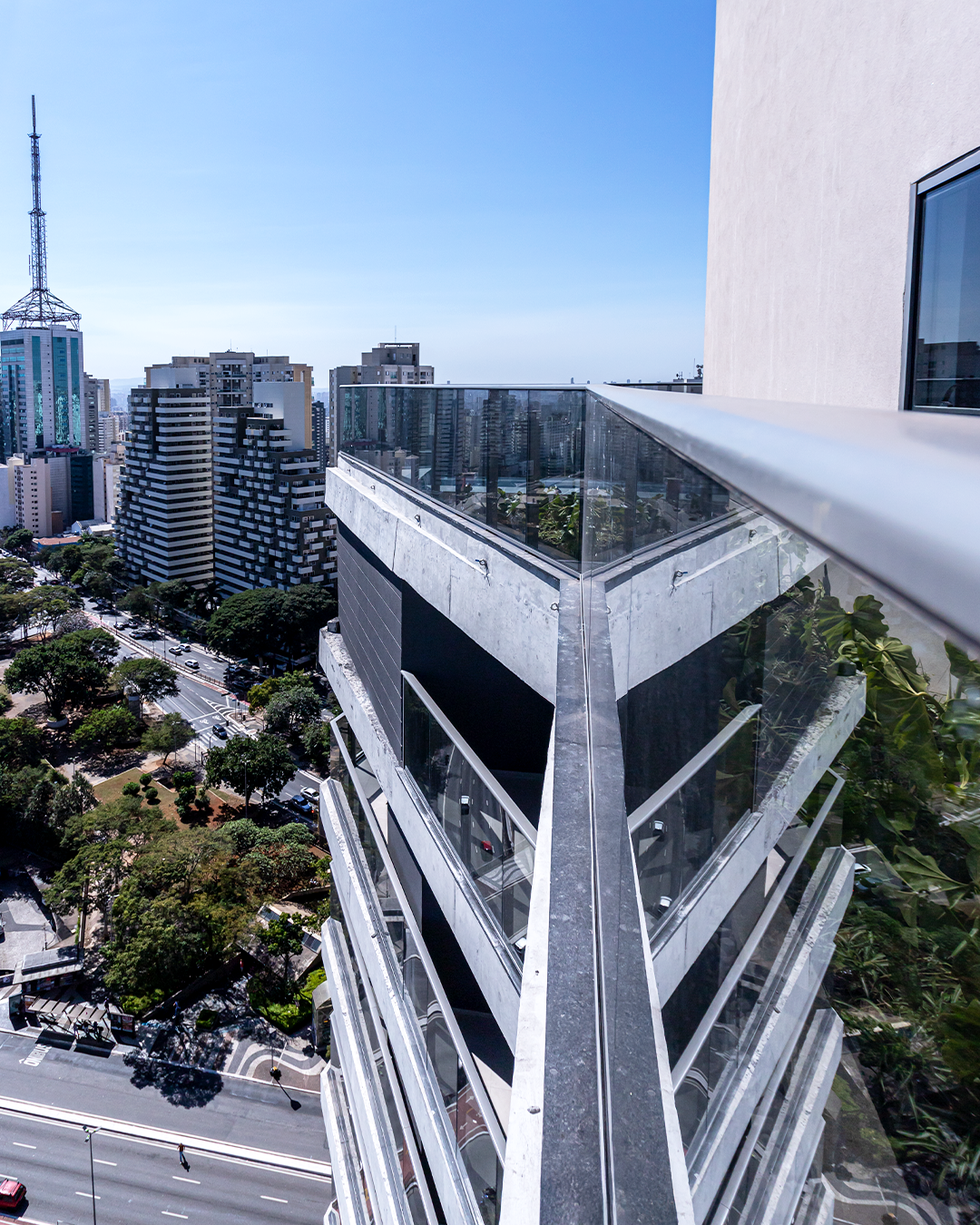 As an architectural design, the vitality and dynamism of a city that never sleeps like São Paulo was uniquely replicated in its volume and finishes. Harking back to a brutalist past, the volumes juxtapose one another, facing Ibirapuera Park to the south, but with their front facades pointing north. Their uses were always separated according to the north (looking towards Serra da Cantareira) and south (Ibirapuera Park) orientations. Both are abundant green areas, teeming with life, both urban and natural. Thus, their final shape resembles a large compass.