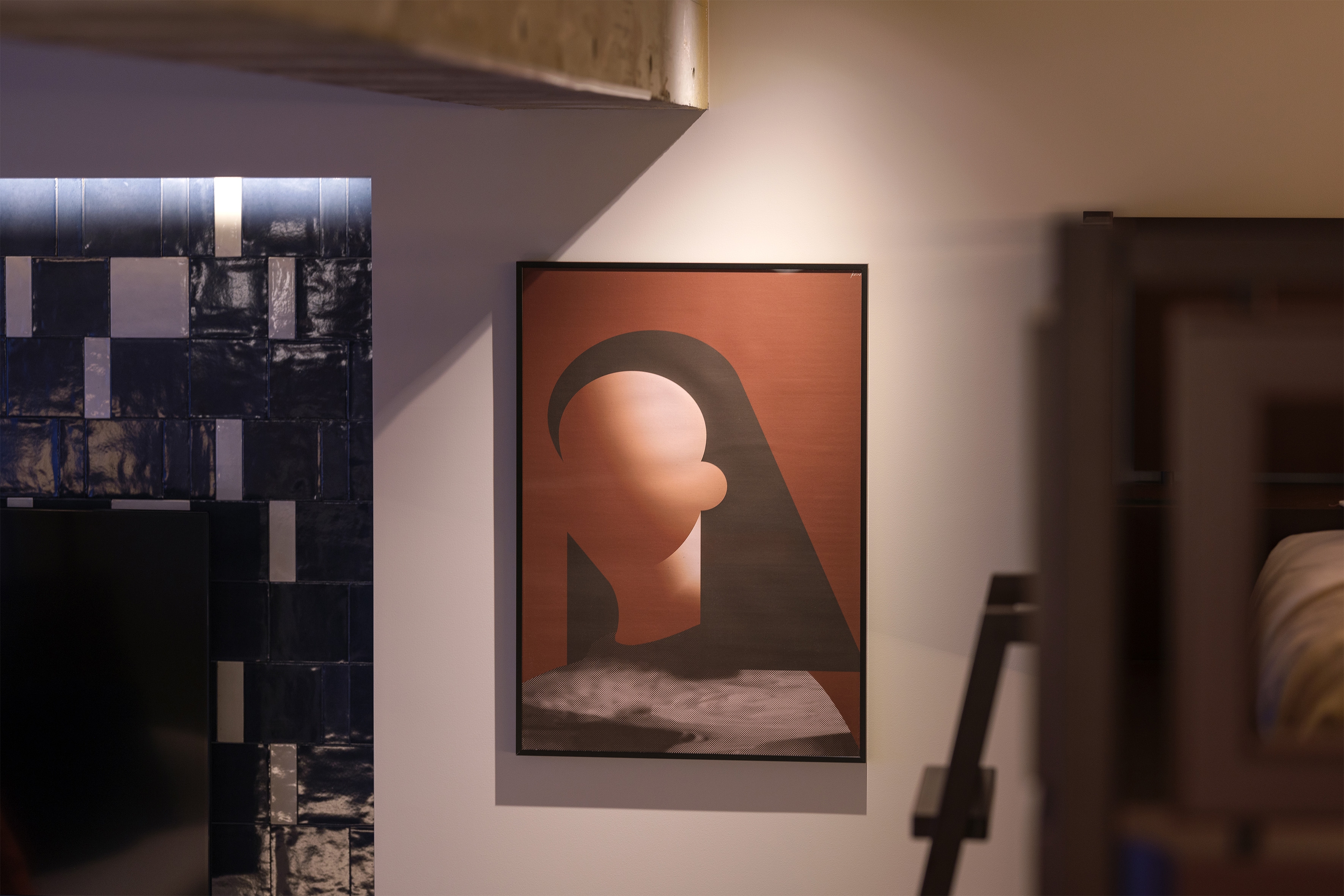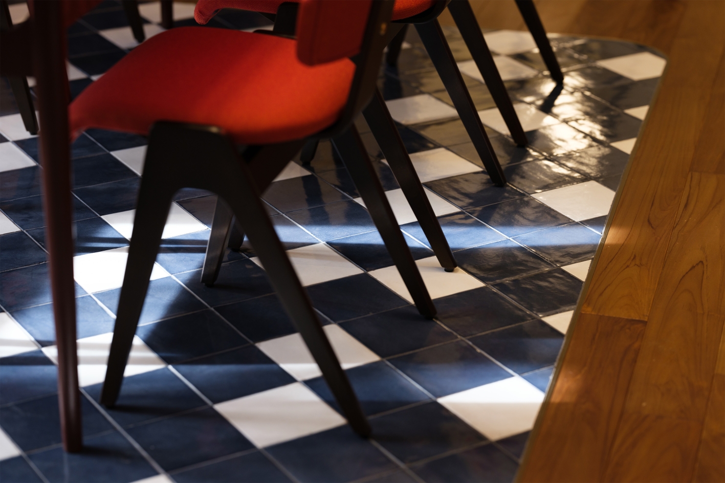 The palette centers around warm reddish-brown tones, softened by wood flooring and base colors. Bold fabrics in vivid hues add a pop sensibility, while blue tiles—complementary to the red tones—give the space clarity and contrast.