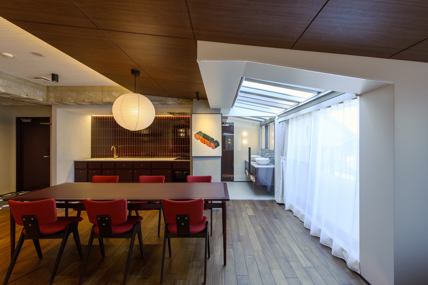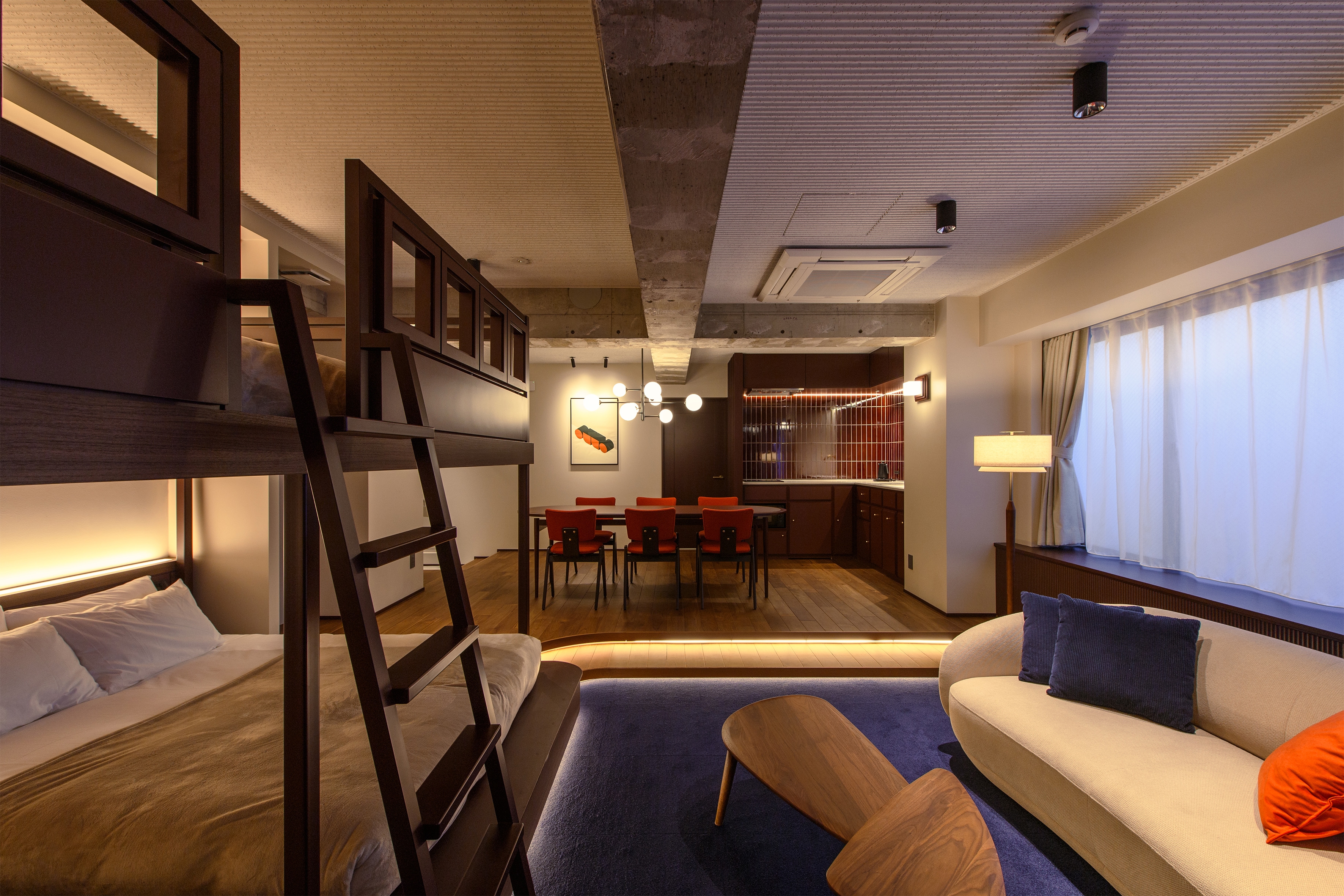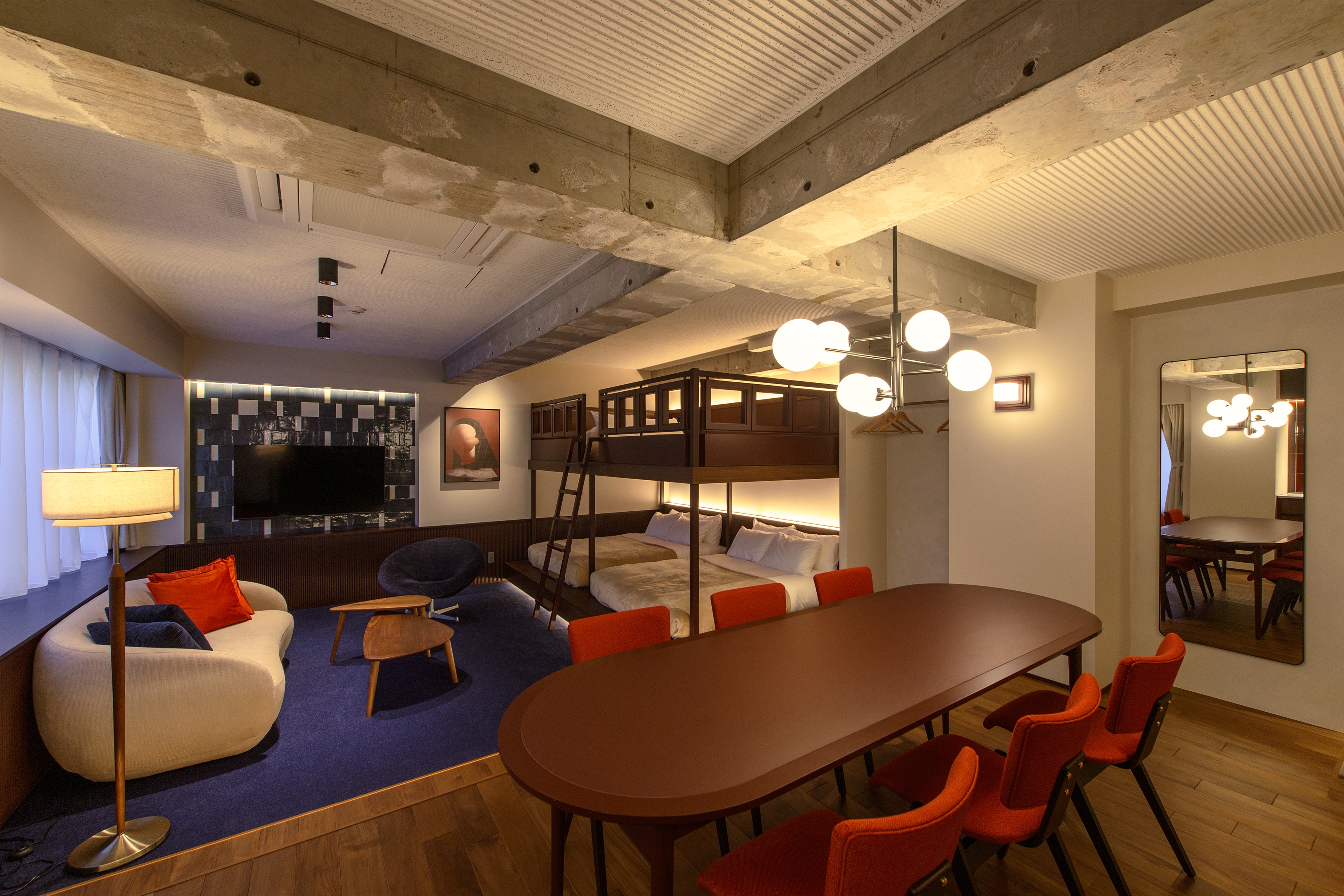 The interior is based on a mid-century modern aesthetic, chosen for its lasting appeal beyond trends. While rooted in simplicity and function, the design incorporates retro-modern details to add subtle elegance. Exposed structural elements and raw materials are paired with delicate moments to reflect Aoyama’s balance of refinement and authenticity.
