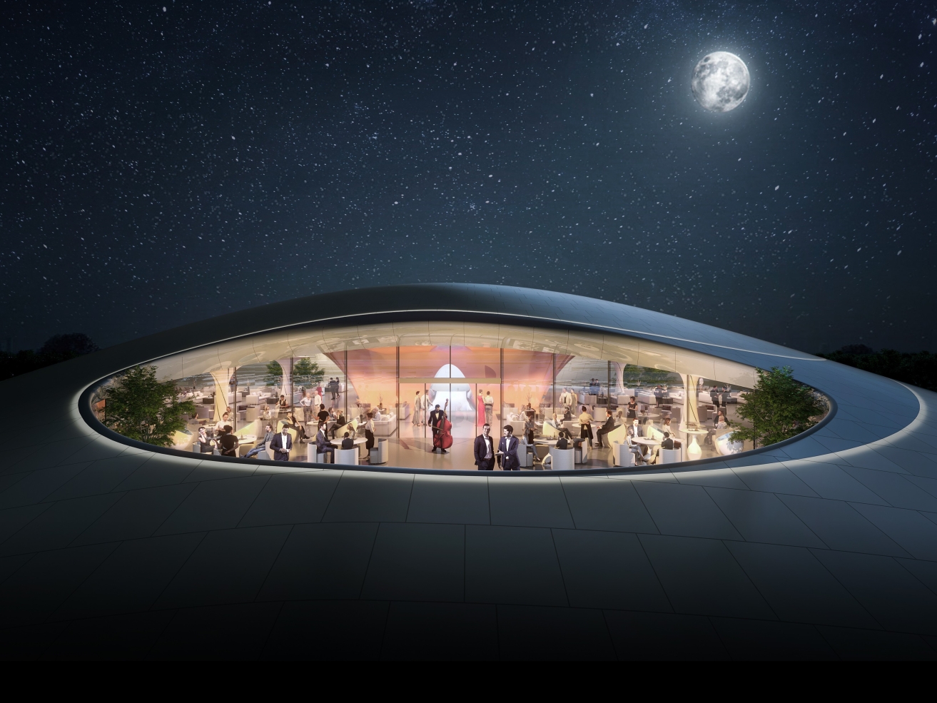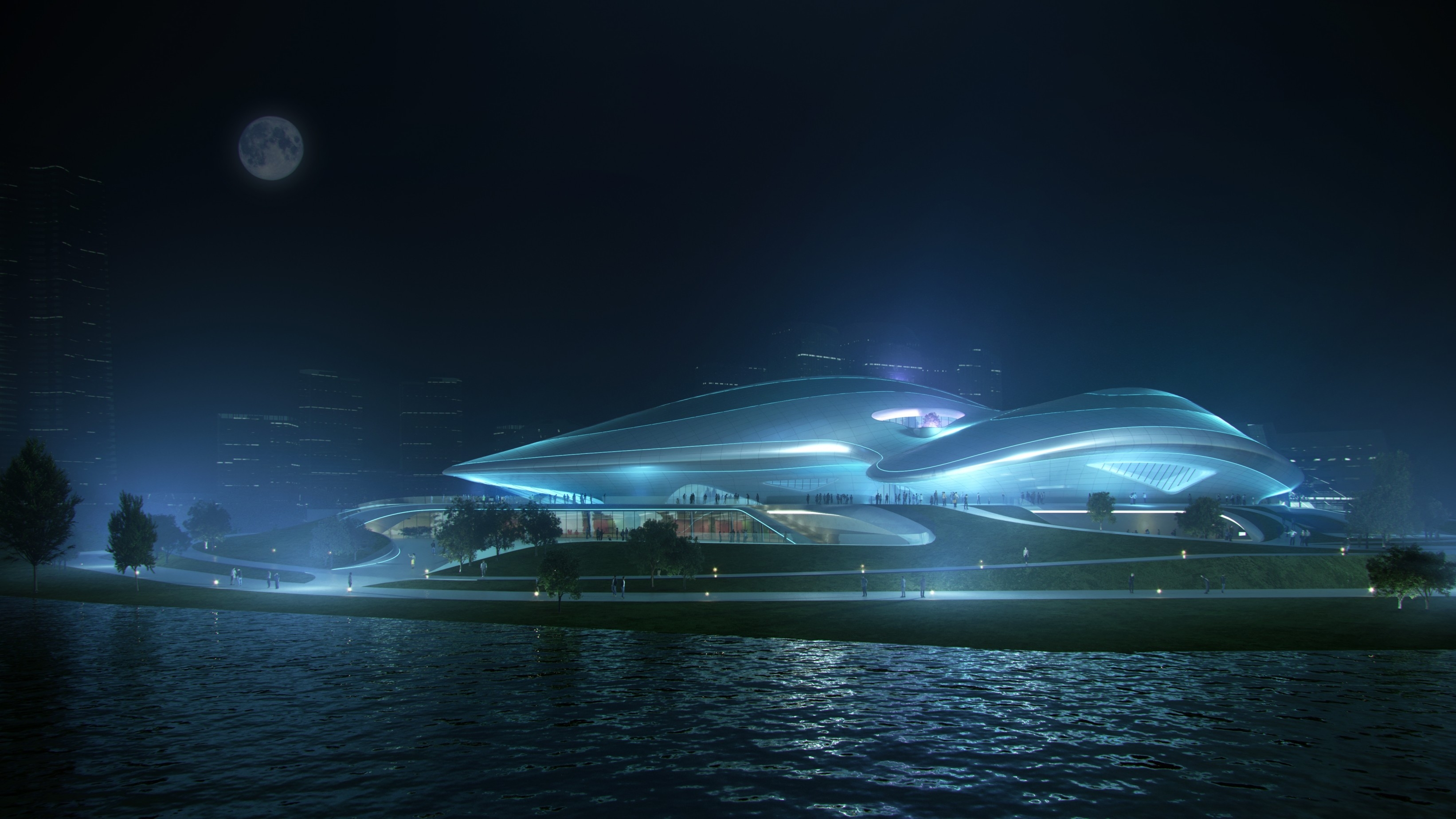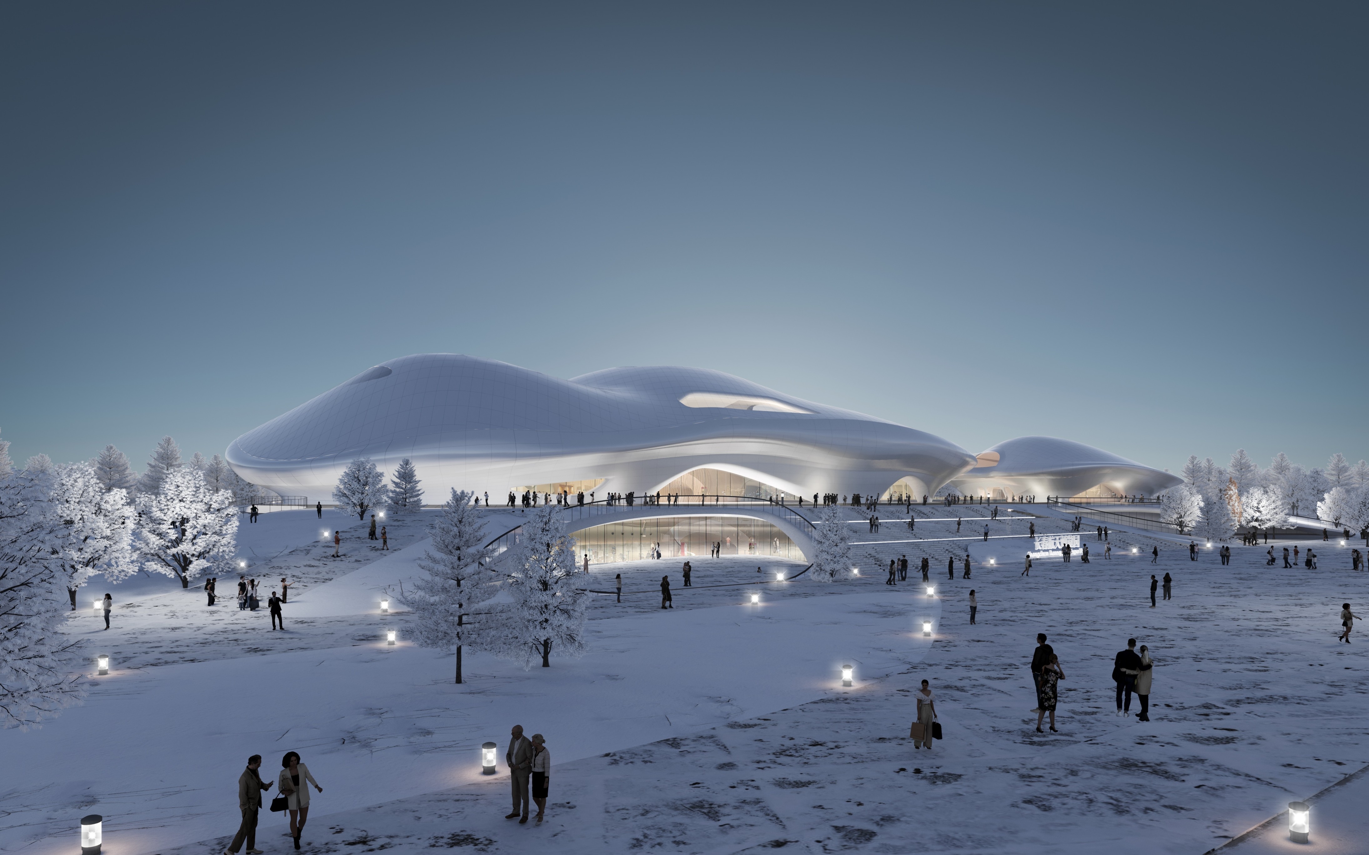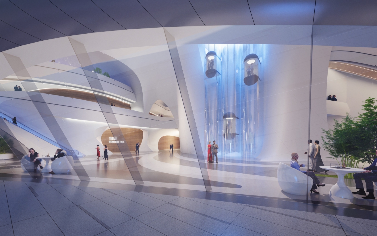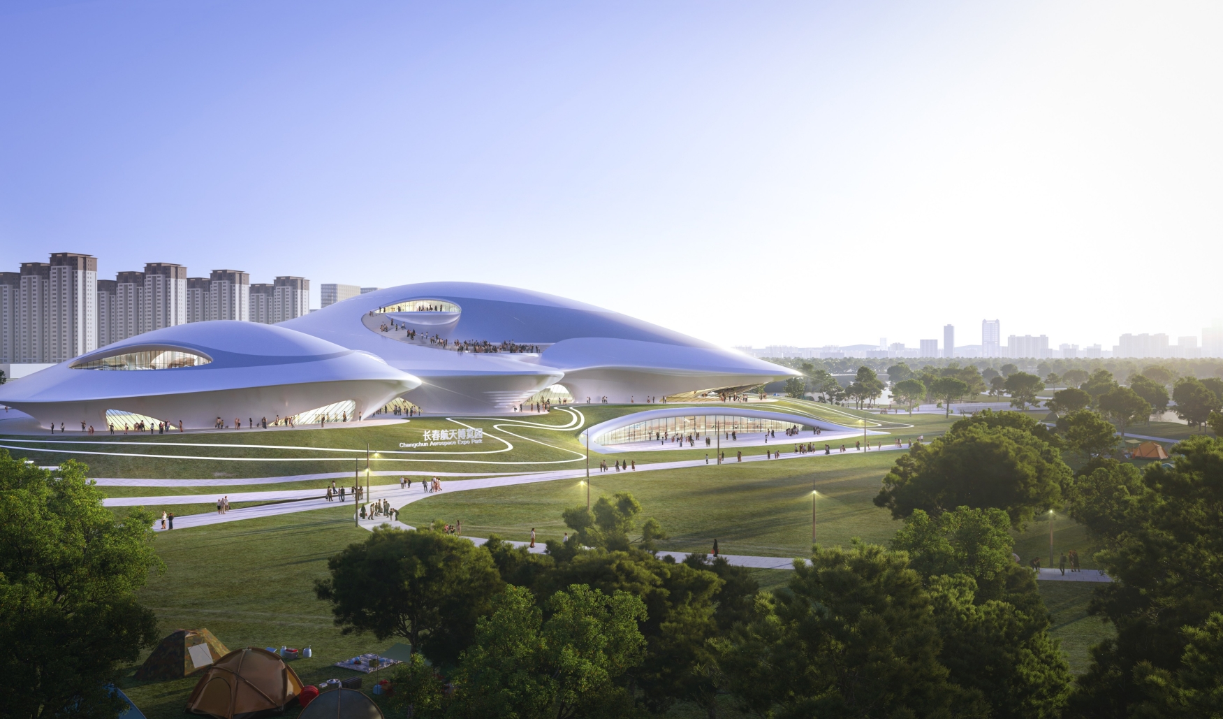 Based on Changchun’s features, the site environment and aerospace theme, the design follows the concept of "Interstellar Terminal • Wetland Symbiosis". It extracts natural forms of snowdrifts, maple leaves and tree clusters to create multiple images: an aircraft hovering by the lake, "melting snow" on the lake’s winter ice, and a metallic "floating forest". The first floor, serving as an urban living room and ecological space, connects seamlessly with the wetland via earth covering. Non-linear design is used inside and out to integrate architecture and landscape. With computational design and engineering, it becomes a large public building and urban artwork adaptable to harsh cold and snow, highlighting the city’s functions and spaces.