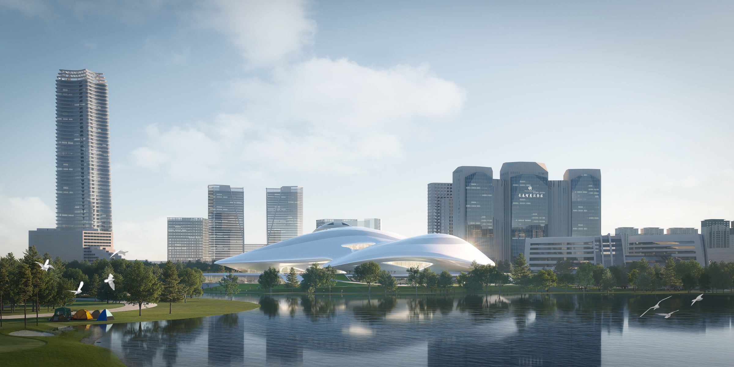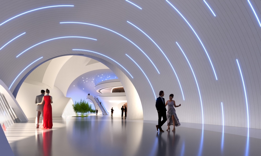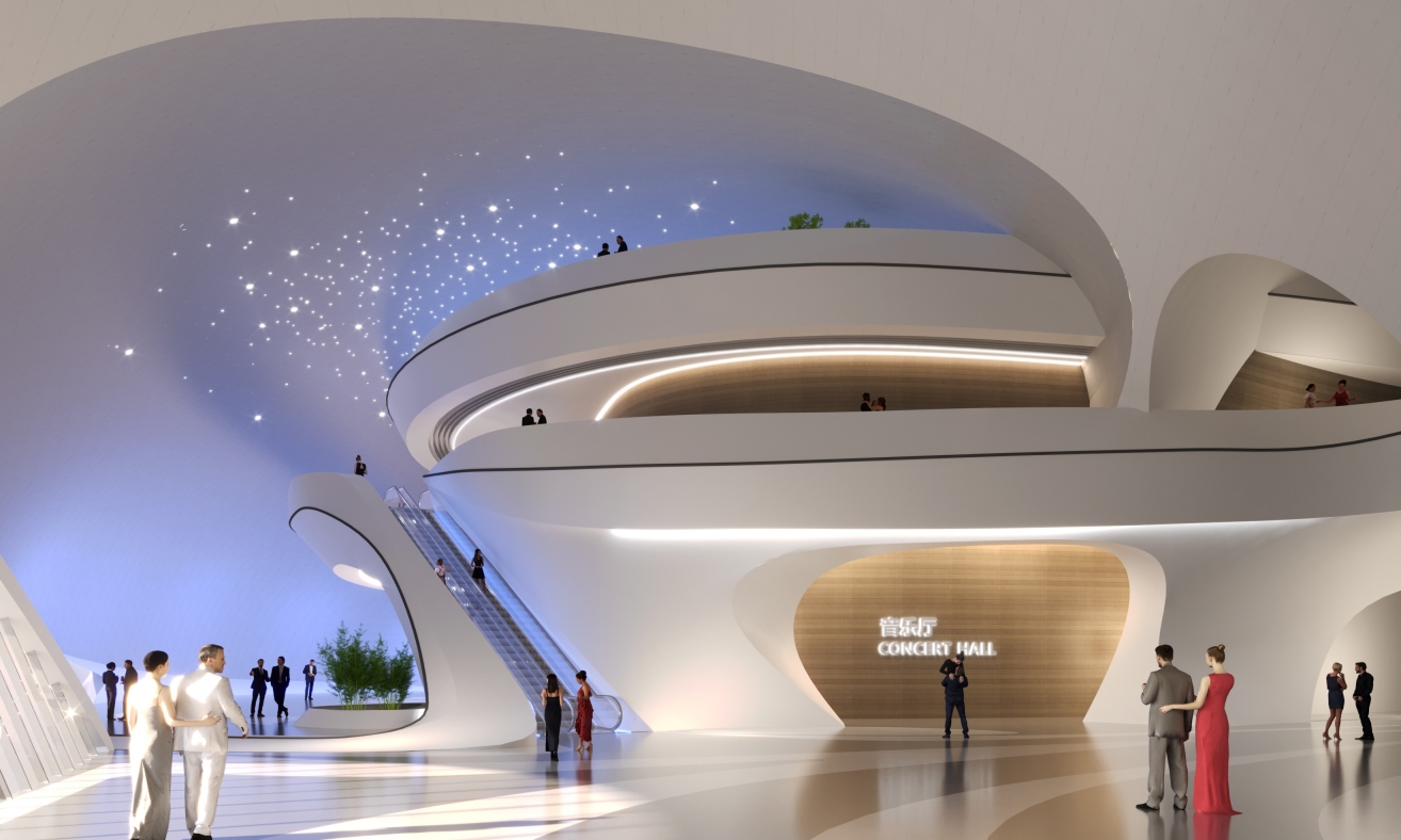 The project is located by Beihu Wetland Park in Changchun, with a construction area of 85,000 m² and a total investment of about 1.04 billion yuan. It houses an 800-seat concert hall, a 2,400-seat conference center, a comprehensive exhibition center and multi-functional halls.