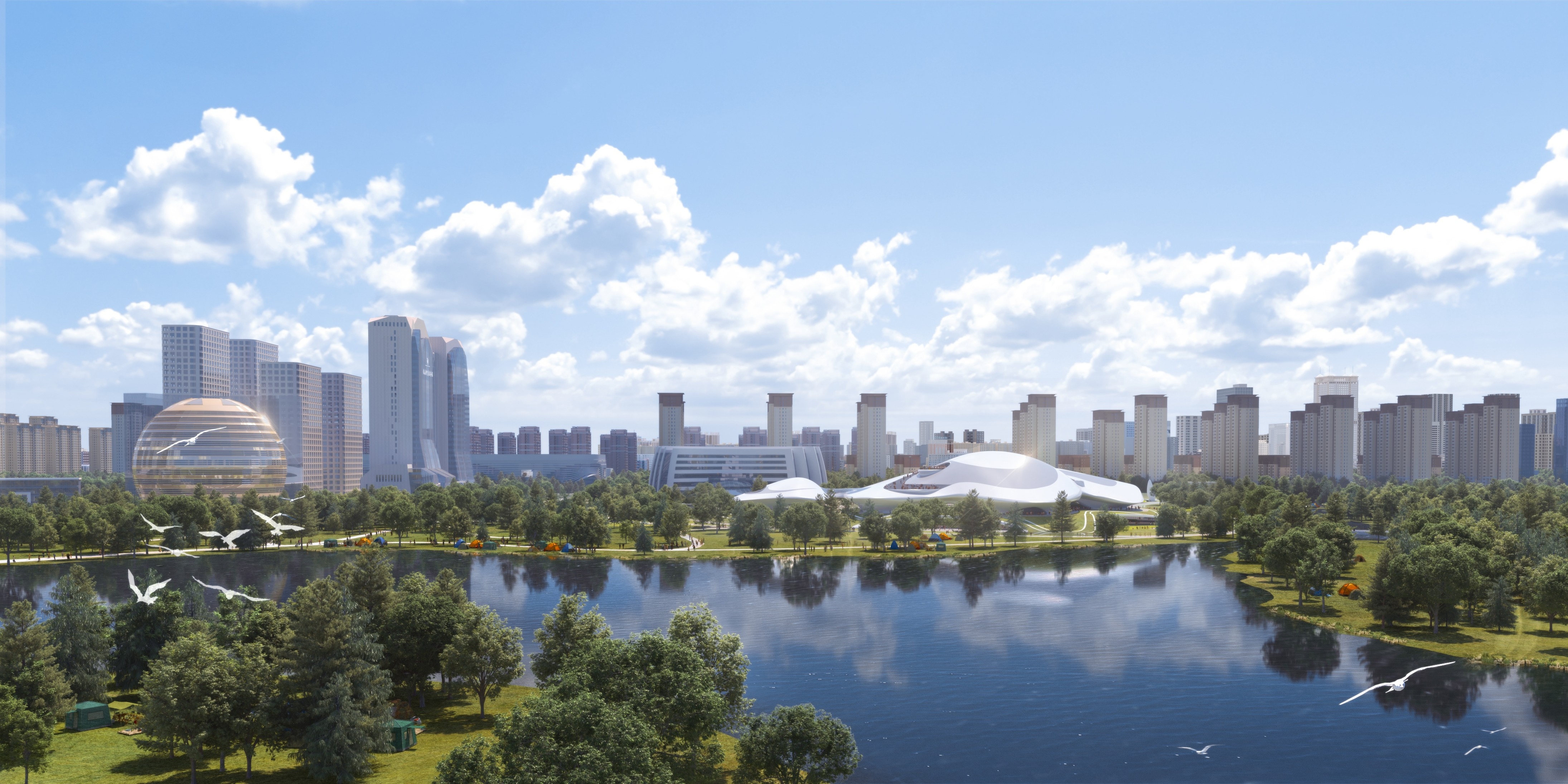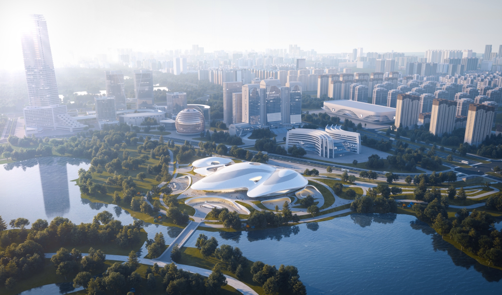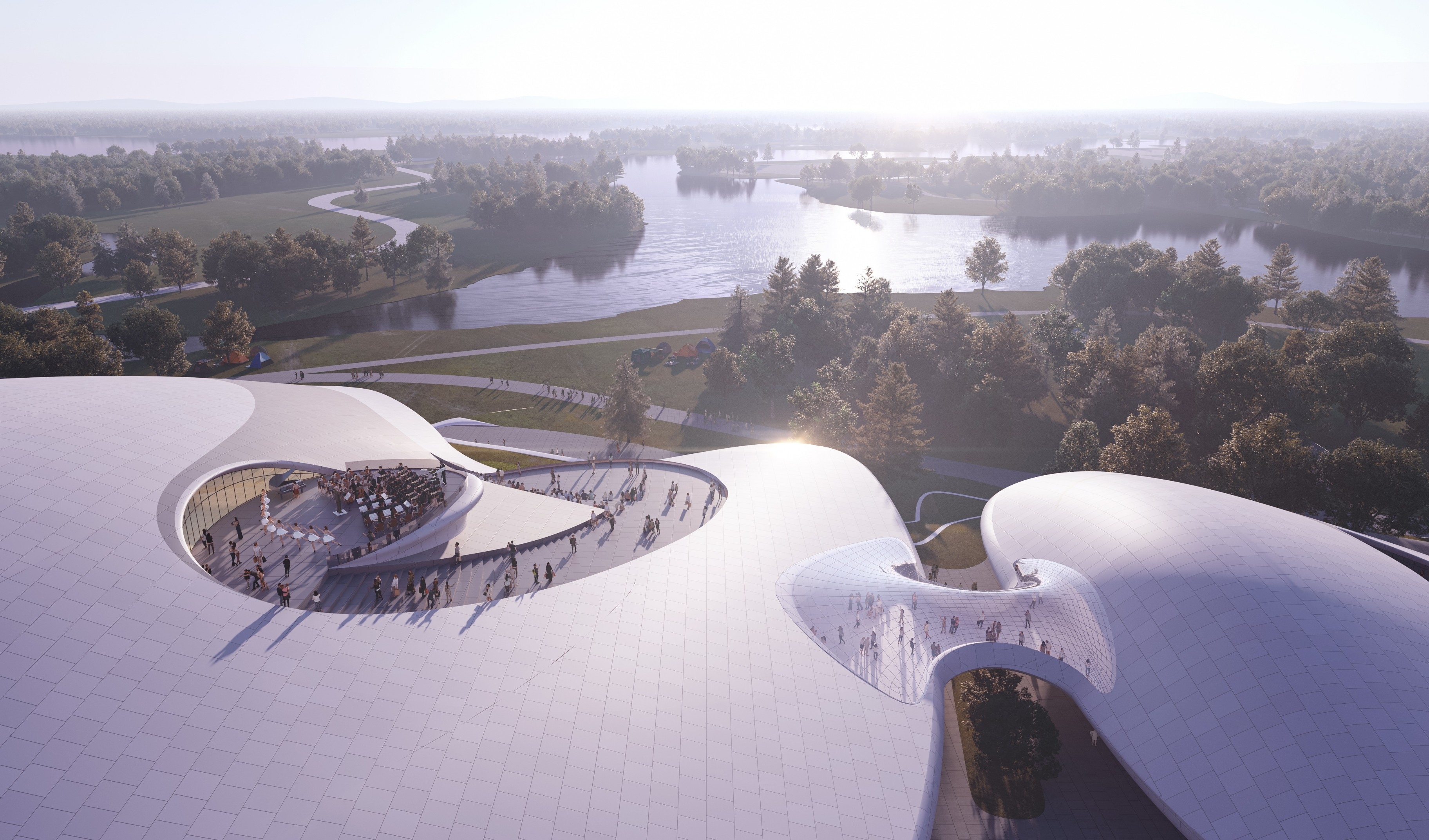 The project is located by Beihu Wetland Park in Changchun, with a construction area of 85,000 m² and a total investment of about 1.04 billion yuan. It houses an 800-seat concert hall, a 2,400-seat conference center, a comprehensive exhibition center and multi-functional halls.