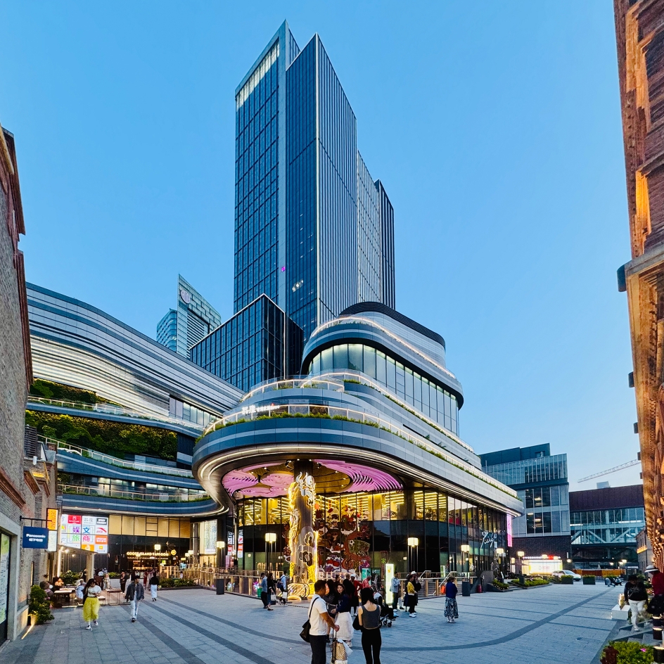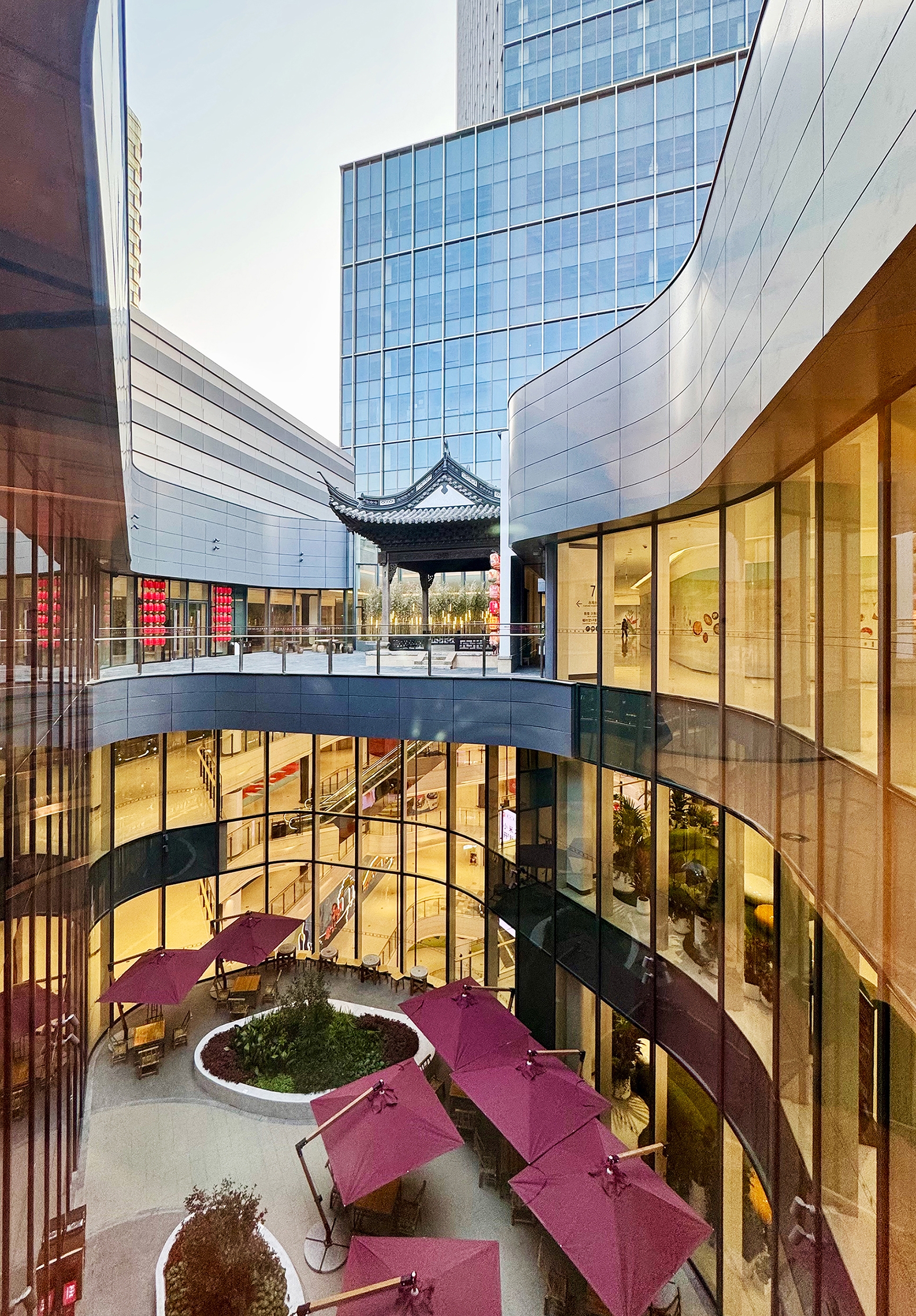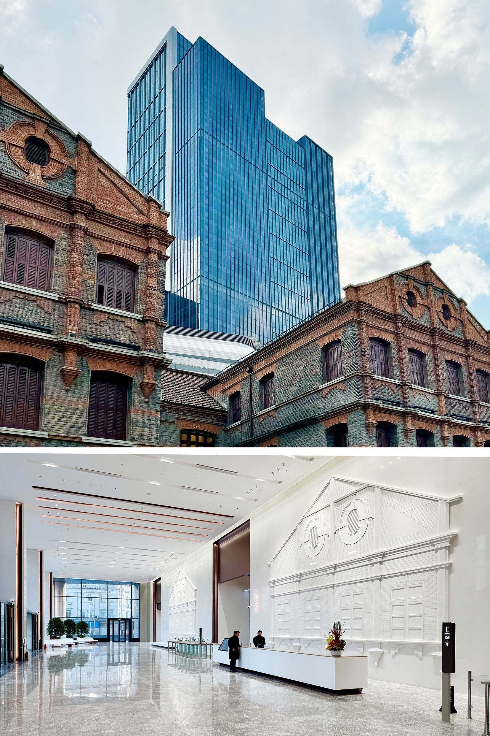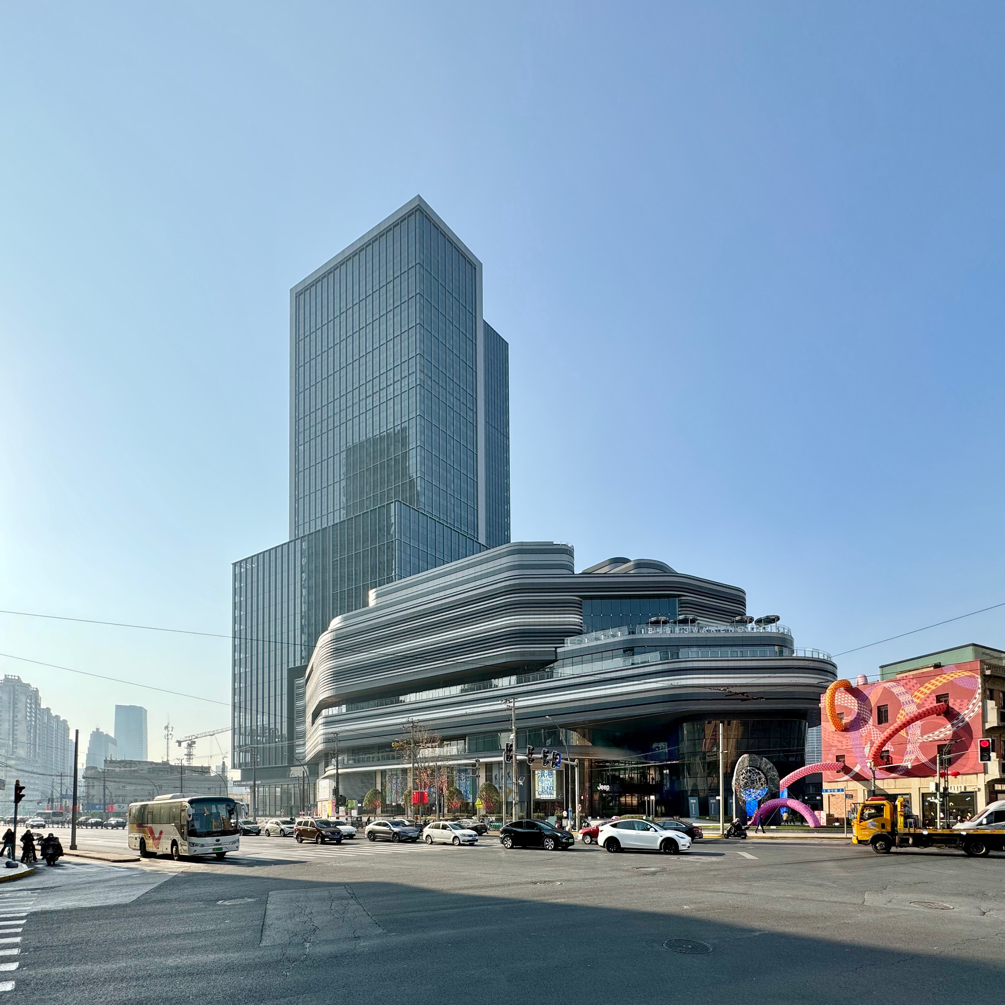 Along the city’s main thoroughfare on Haining Road, the office tower anchors the corner, rising as stacked blocks that open towards Shanghai’s skyline. The adjoining seven-storey podium mall presents itself as a City Gallery with retail boxes and open terraces, accented by the City Window that faces The Bund.
