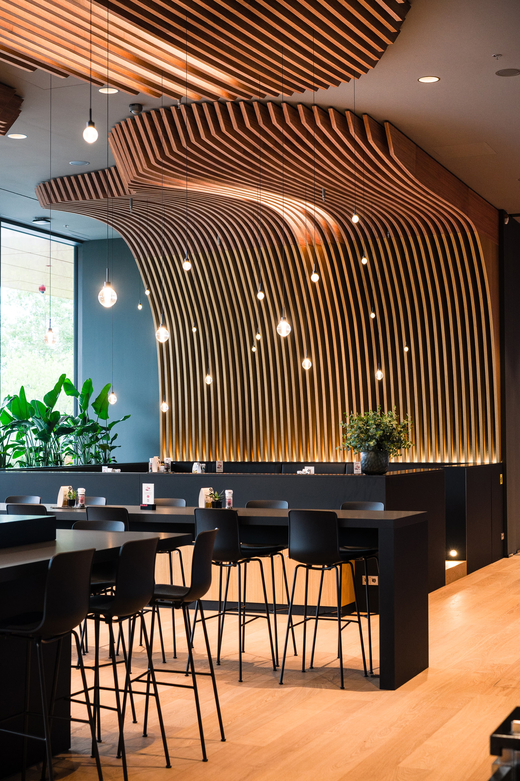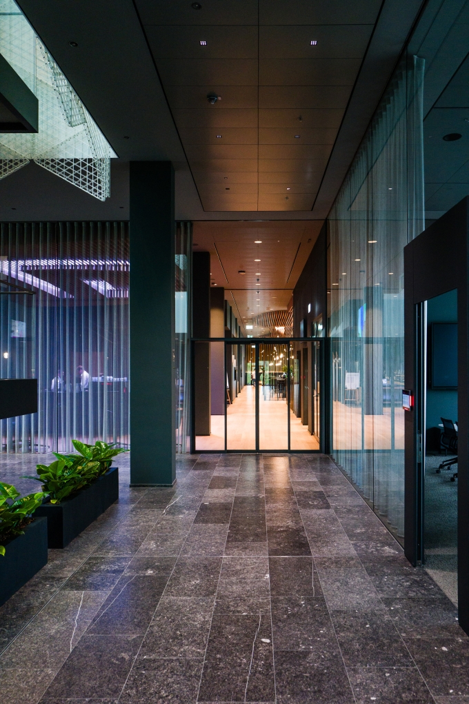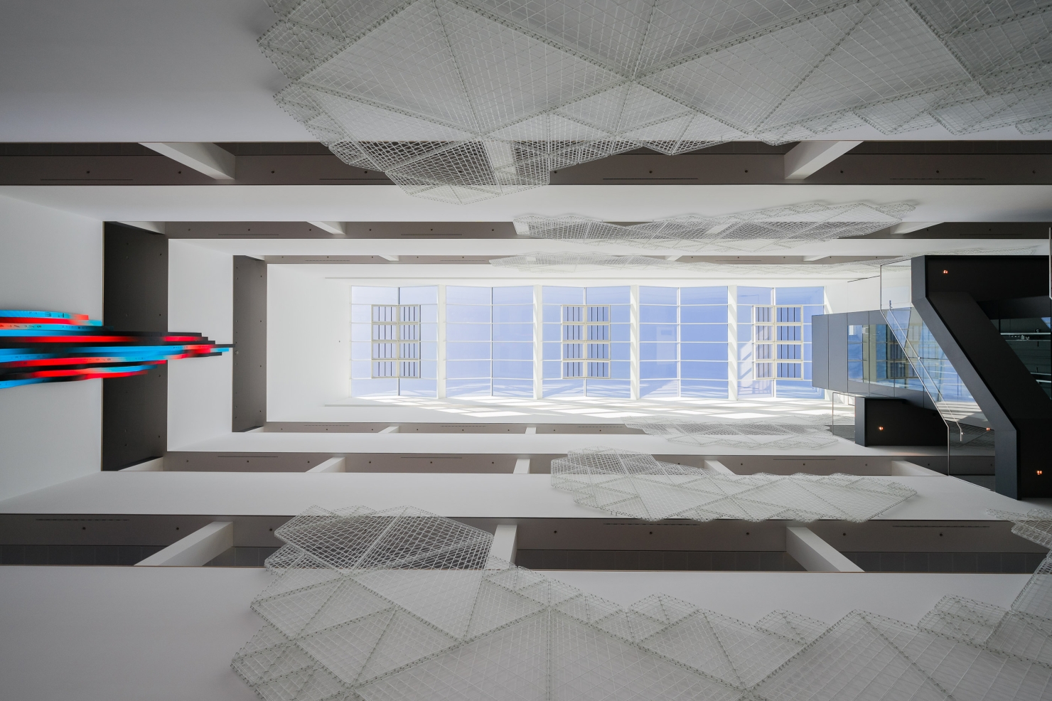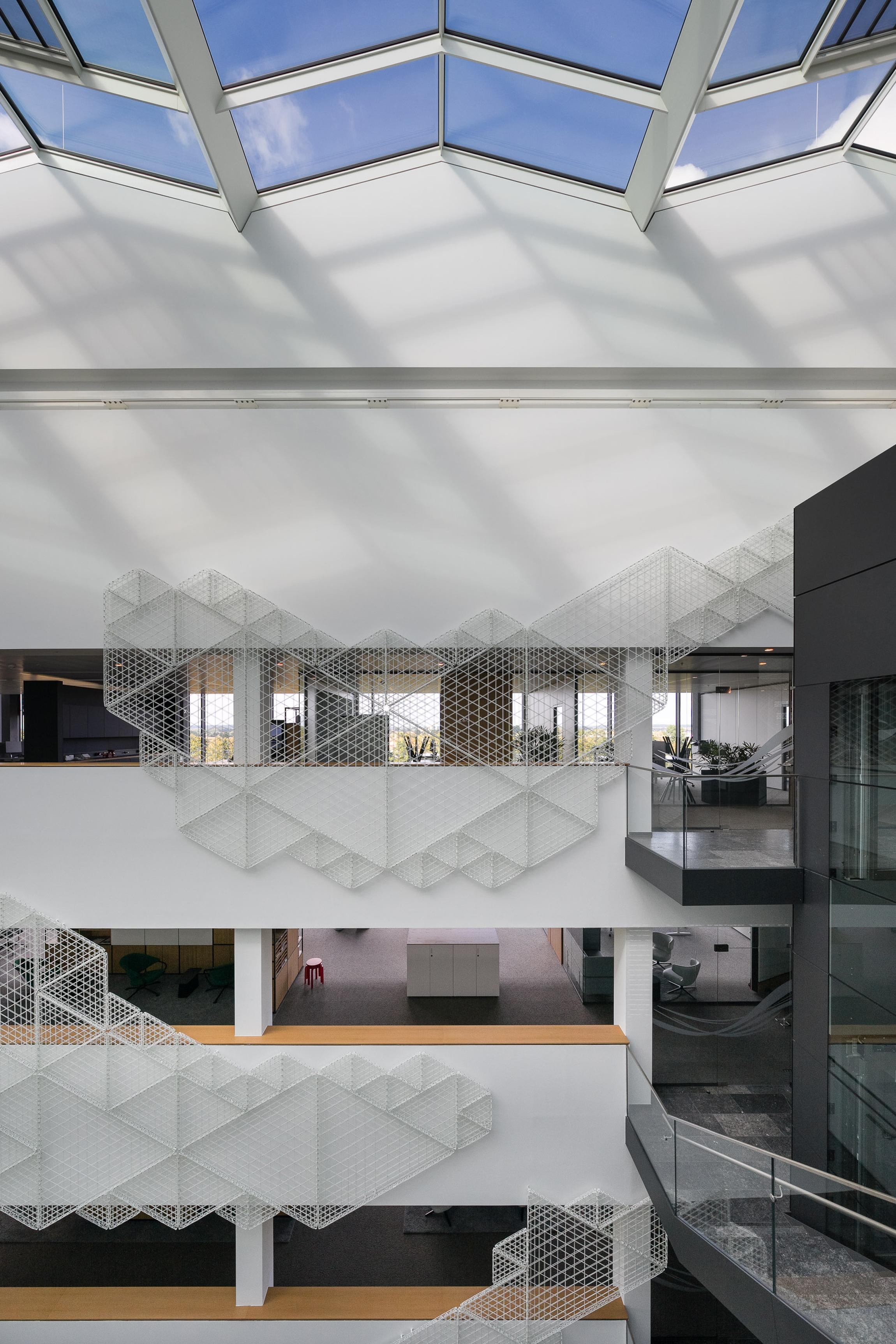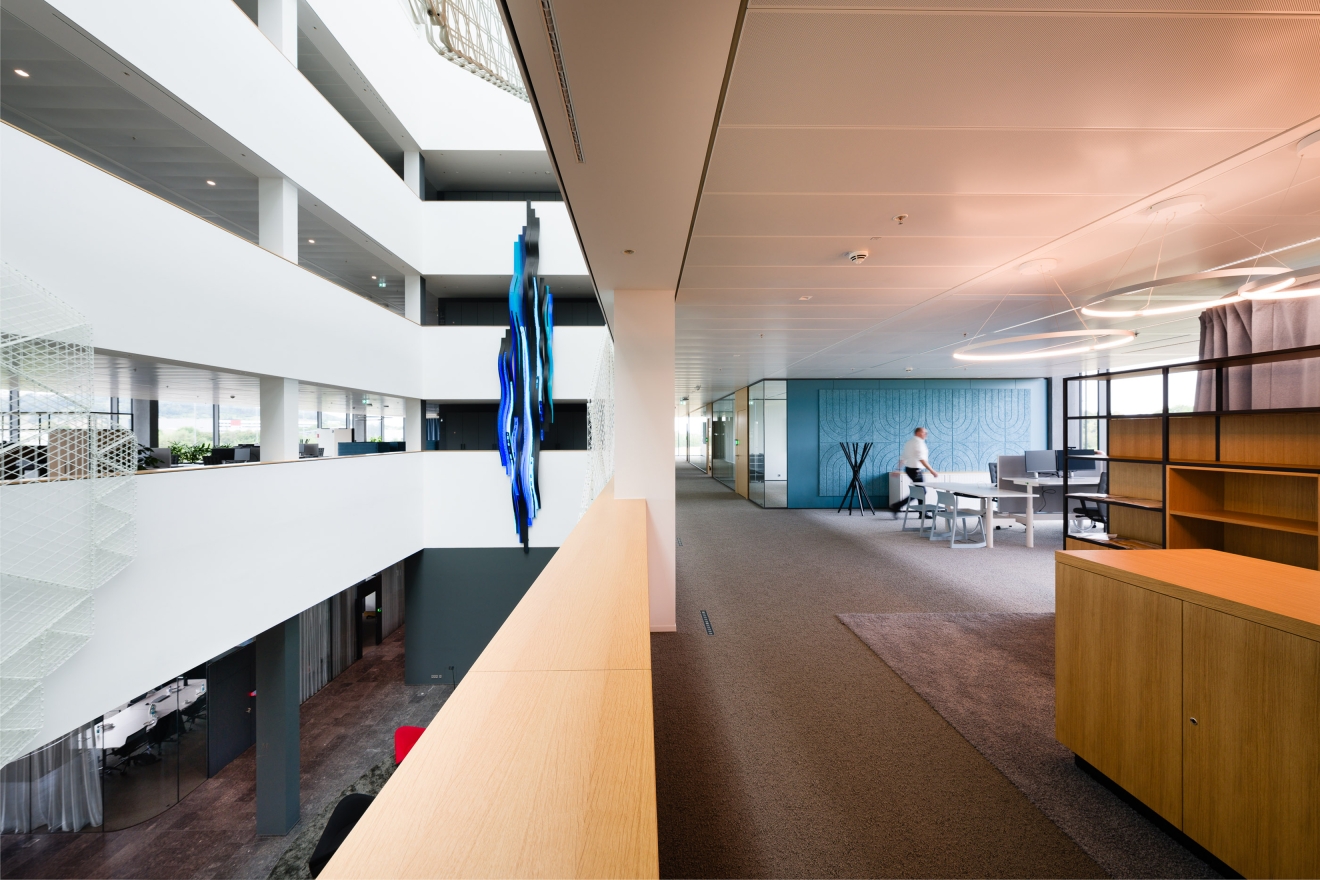 Open Space Offices are flexibly designed, with workshops for agile work integrated. On the third floor, the executive area houses conference rooms, a lounge, a bar, an art installation, and a greened roof terrace. Sustainability is driven by photovoltaic systems, a heat pump, a combined heat and power plant, and a double facade that reduces cooling demand. Thirty-three thousand hollow-core elements save 110 t of CO?. Retention facilities improve the microclimate. With SHIMMER, Art in Architecture, and a media installation by Daniel Canogar, data from 13 German rivers are visualized.