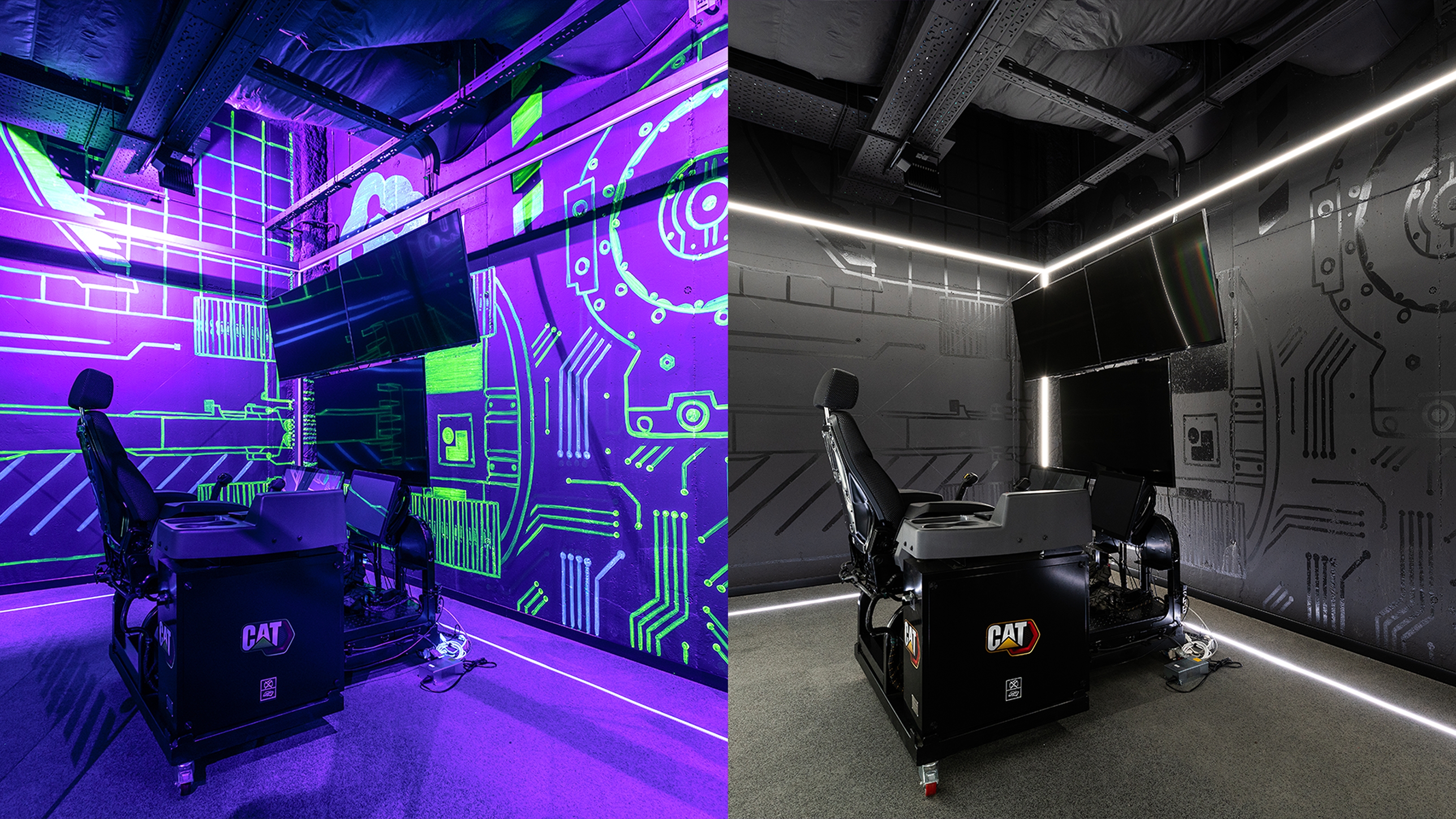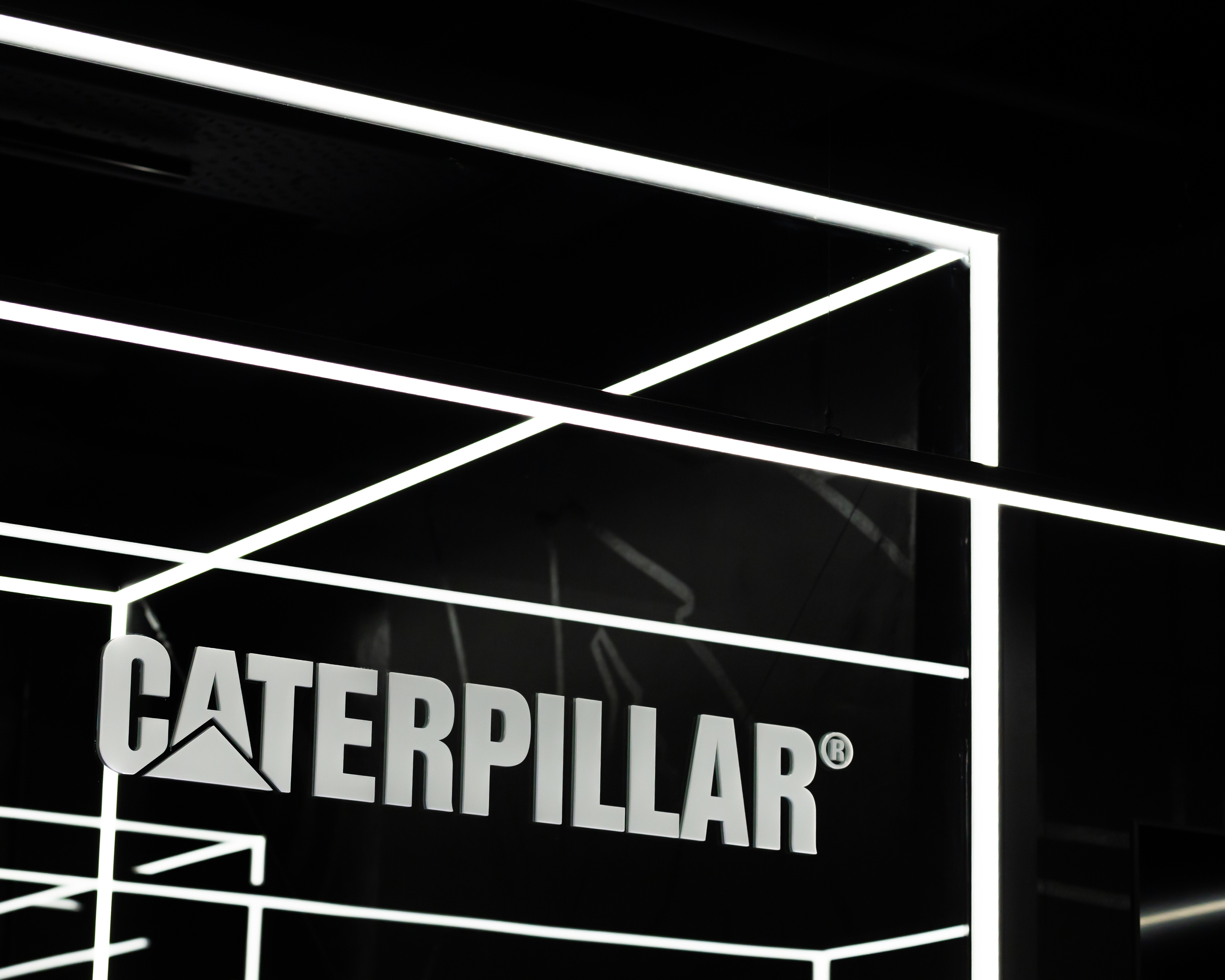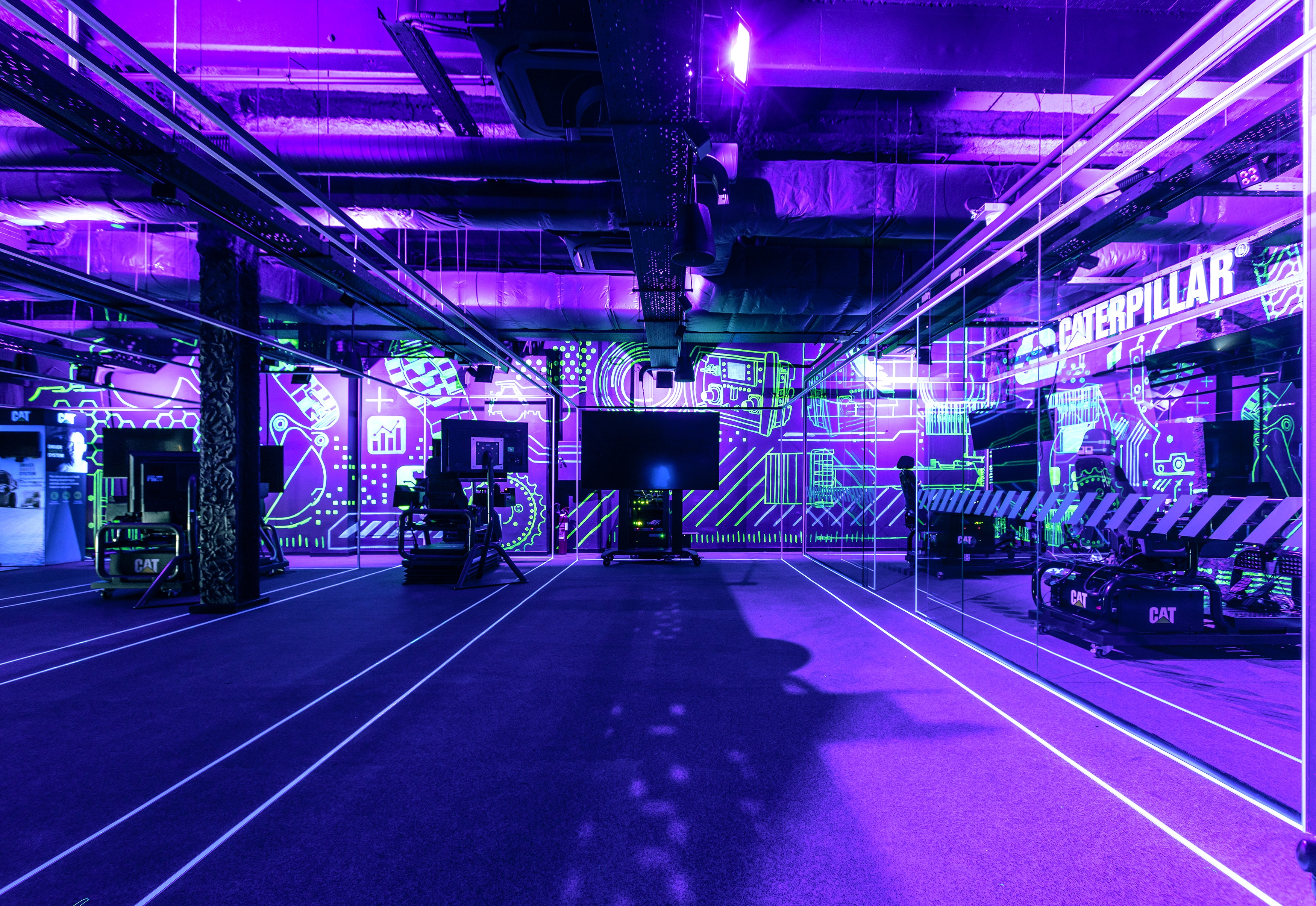 The walls transform into a large mural of photoluminescent paint with graphic motifs related to Caterpillar's industry. The graffiti then disappears, making way for the true protagonist: Caterpillar's cutting-edge technology.