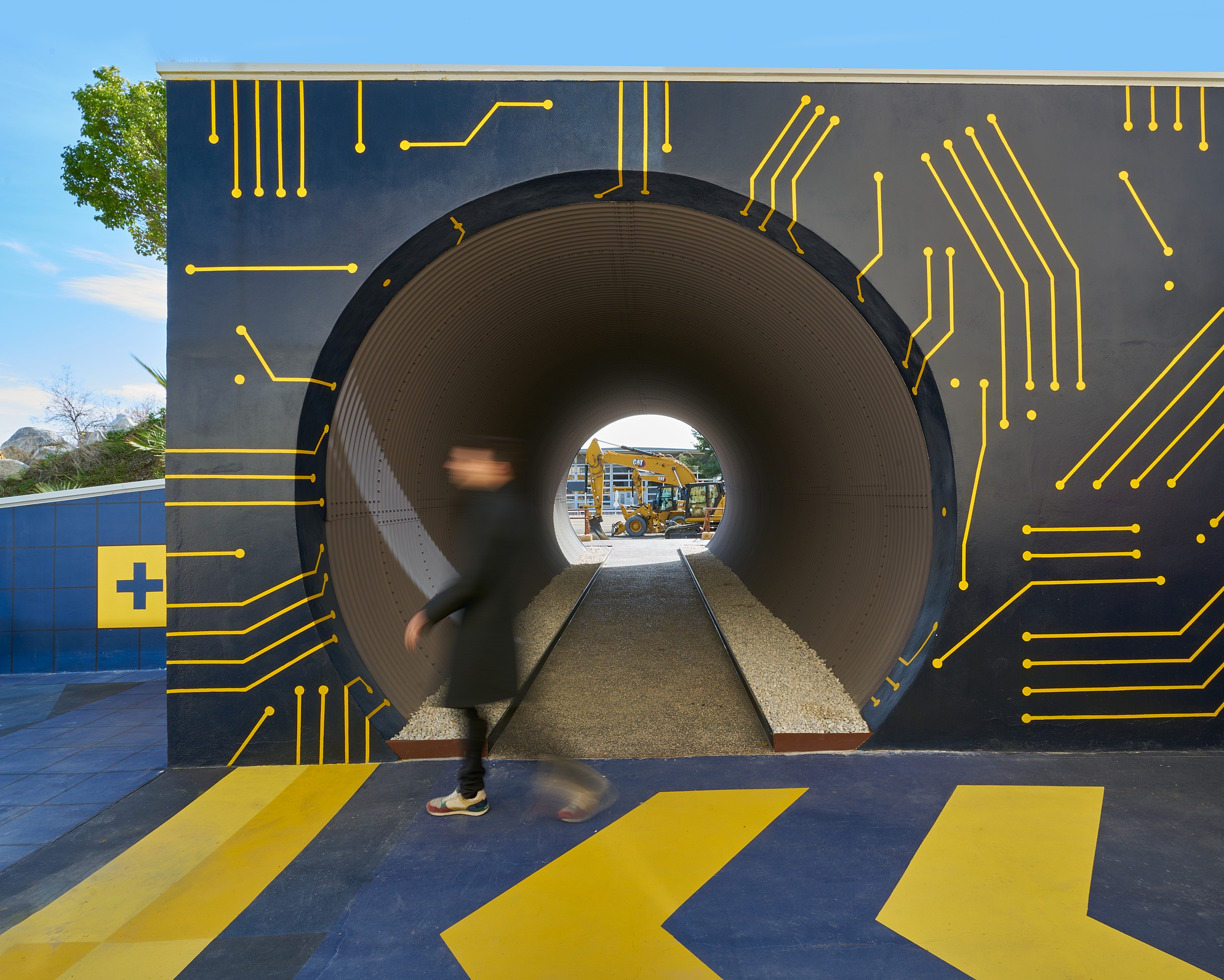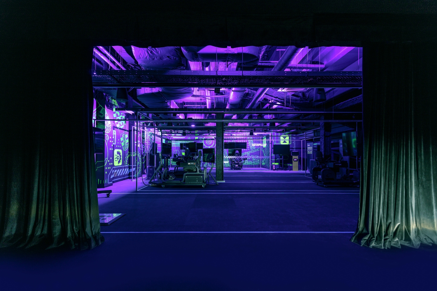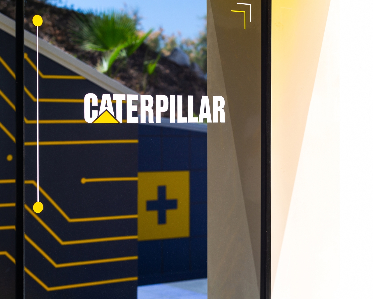 The walls transform into a large mural of photoluminescent paint with graphic motifs related to Caterpillar's industry. The graffiti then disappears, making way for the true protagonist: Caterpillar's cutting-edge technology.