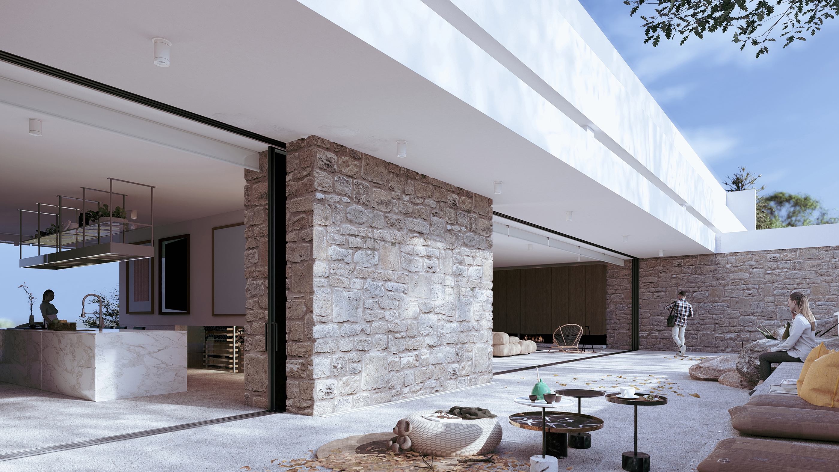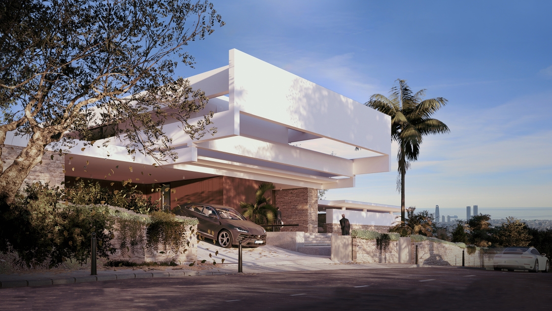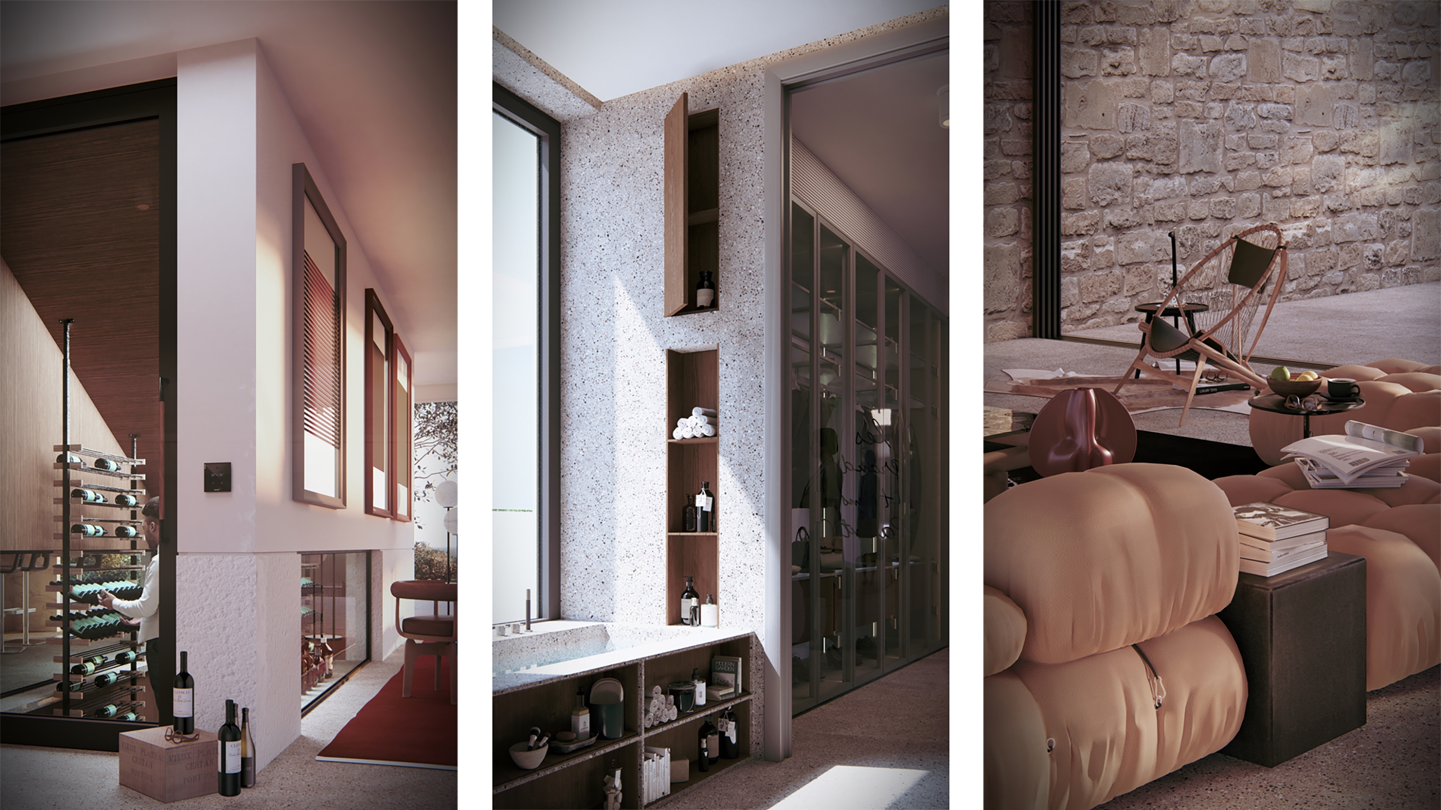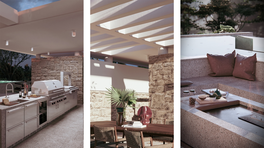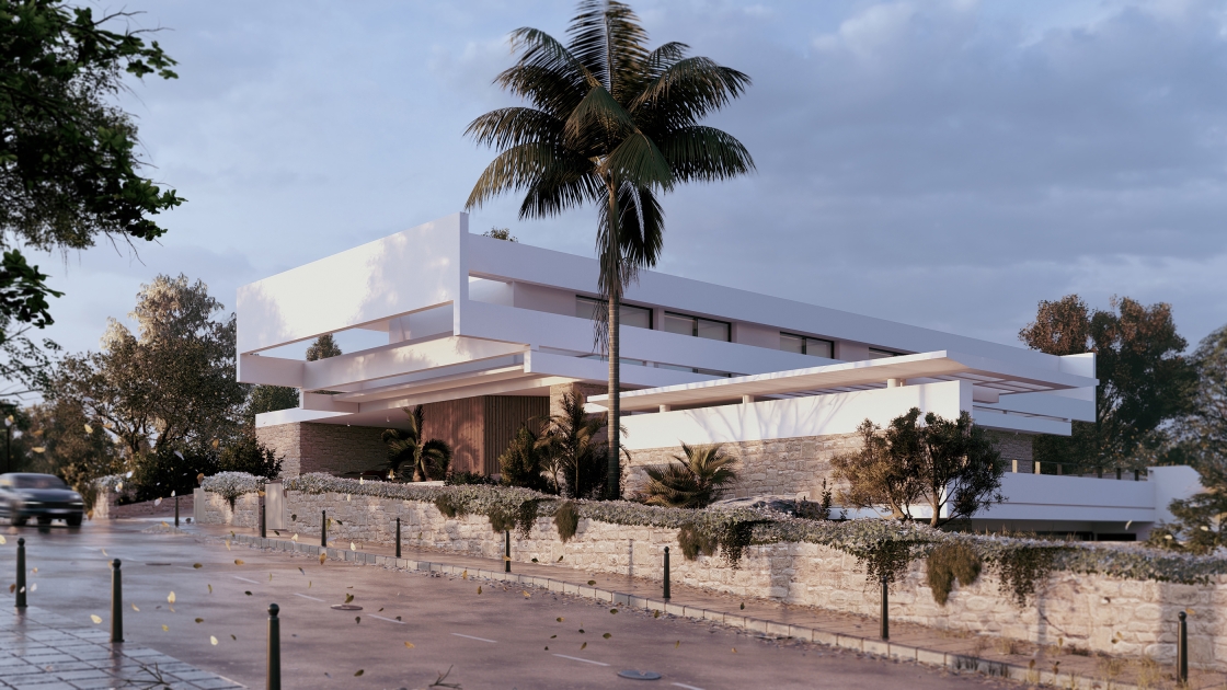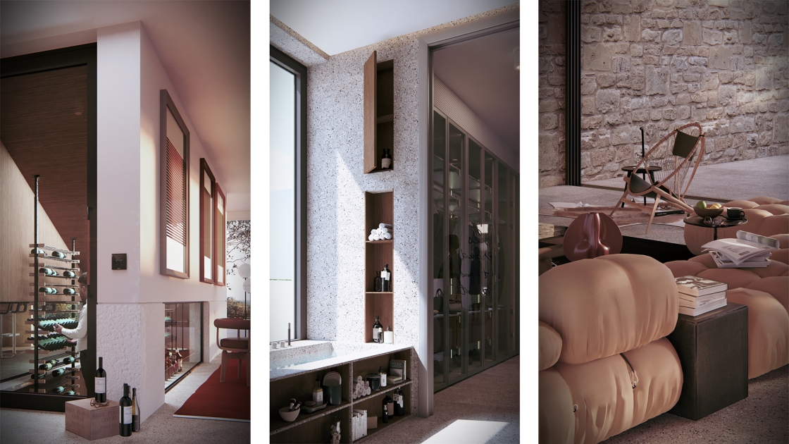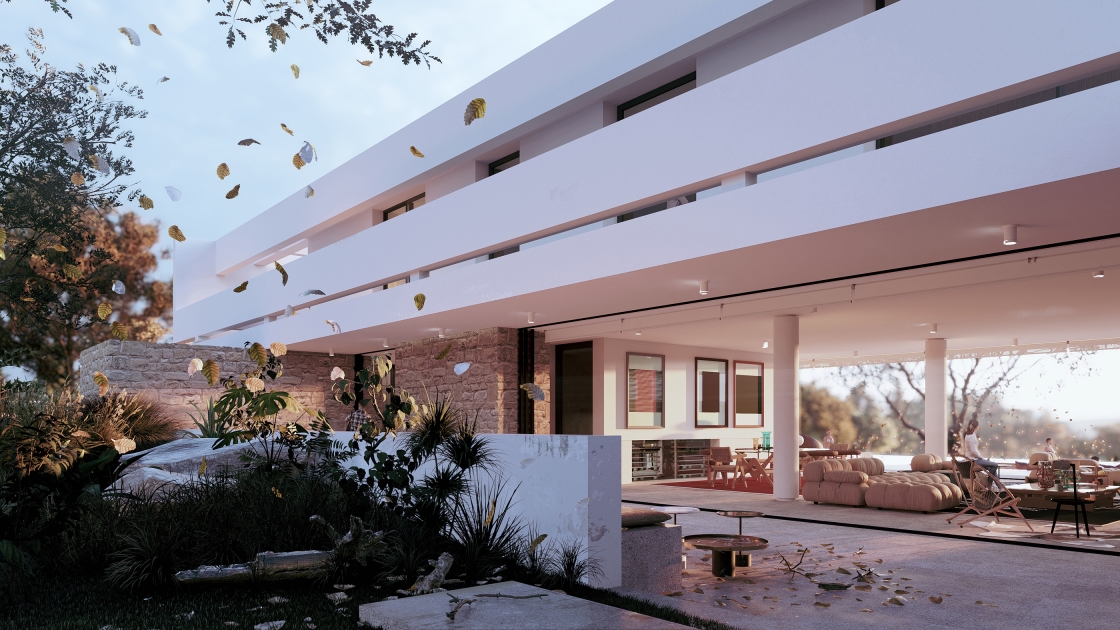 Cantilevered beams, inspired by Mediterranean pergolas, filter sunlight, cool the interiors, and extend shaded outdoor living. Local stone and wood root the architecture in its terrain, while Mediterranean planting and a semi-public park establish a sustainable microclimate.