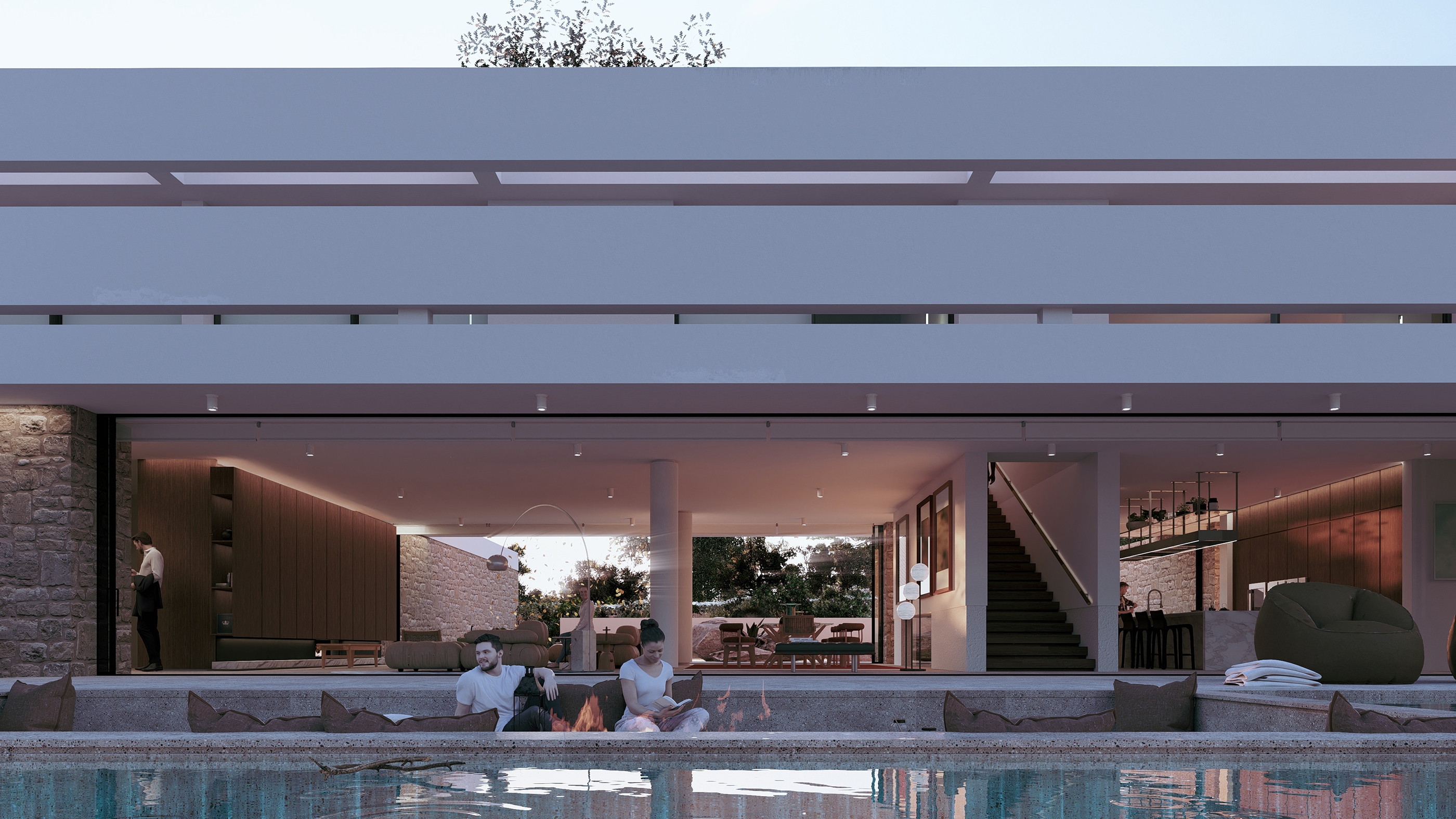 Two volumes define the composition: a grounded stone base accommodating communal living and a pure white hovering upper volume for private quarters.