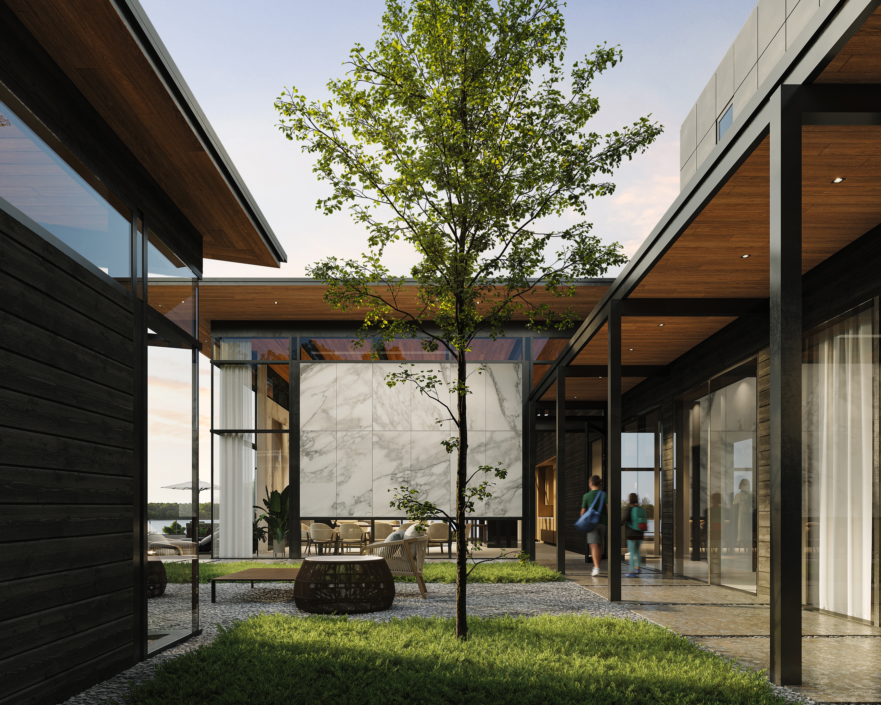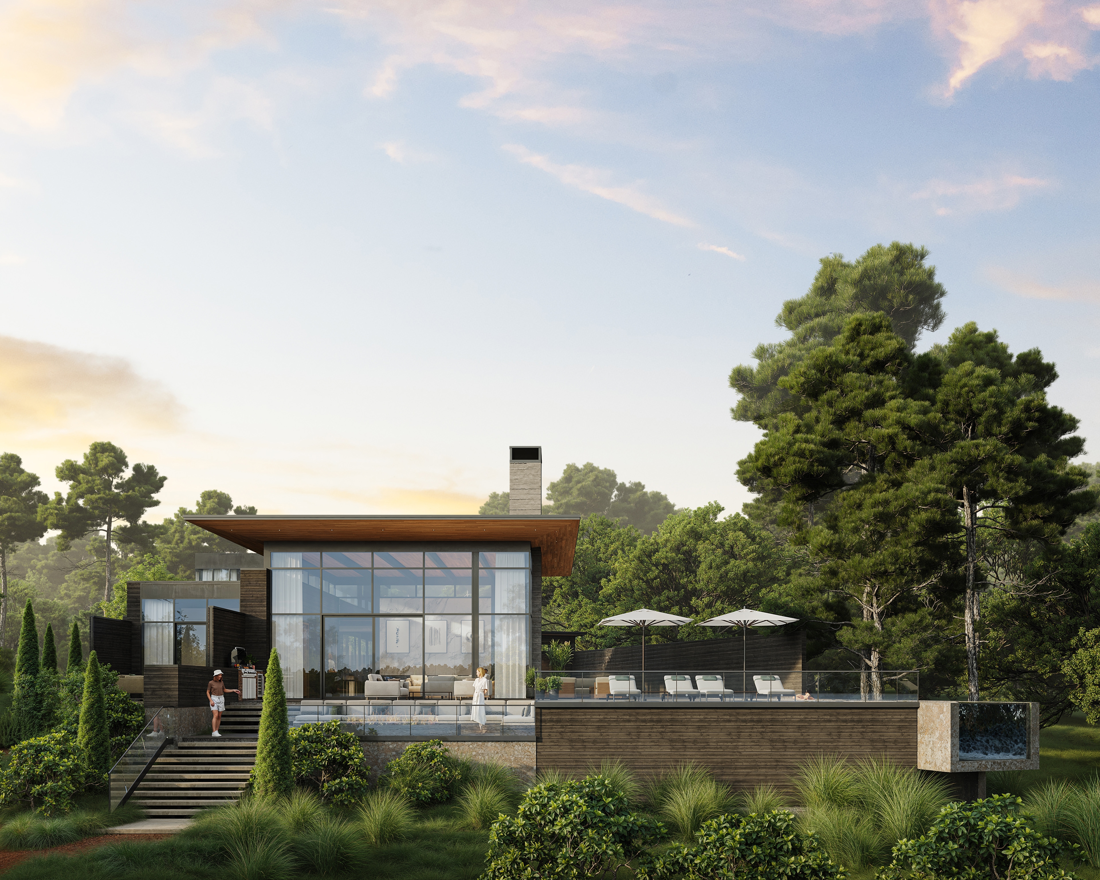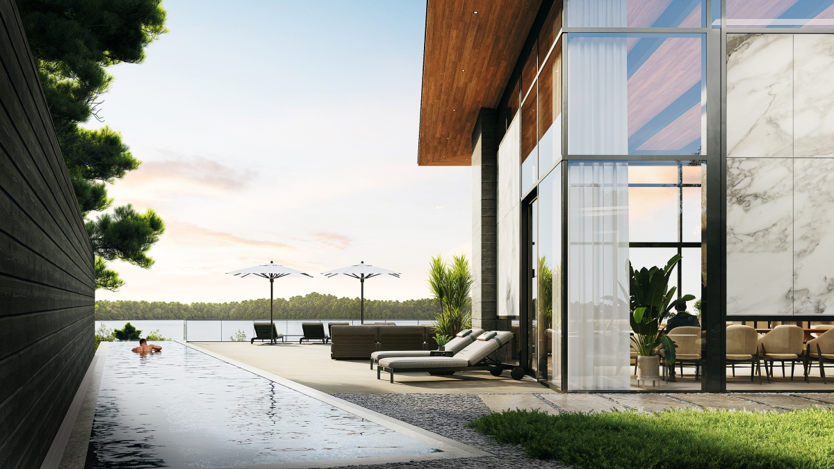 Potomac Overlook exemplifies a modern residential design that harmoniously engages with its waterfront setting. Composed of sleek rectilinear volumes, the architecture is carefully oriented to capture uninterrupted views of the Potomac River. Expansive glazing blurs the boundary between interior and landscape, creating luminous, open-concept living, kitchen, and dining areas that foster connection with the serene environment. The design terraces naturally down the site’s grade, establishing a seamless transition to the river and integrating built forms with the landscape. Materials are chosen to complement the surroundings, emphasizing warmth and textural resonance. The property functions as a private enclave, enhanced by tailored landscaping and framing of water vistas. A standout feature is the custom pool house with a cantilevered 25-meter lap pool, boldly extending over the terrain to maximize visual impact. Potomac Overlook reflects a thoughtful balance of innovative architectural expression, refined functionality, and careful consideration of the site, offering a compelling residential experience that is both striking and contextually attuned.