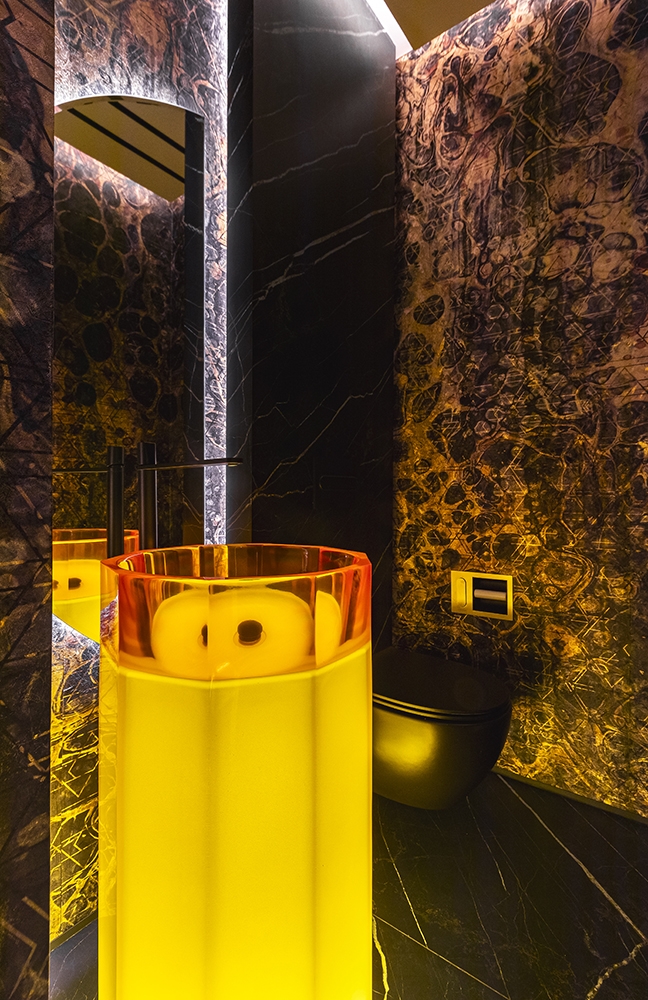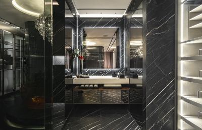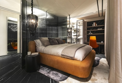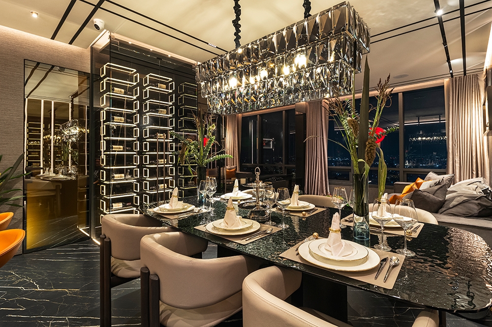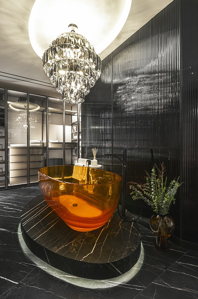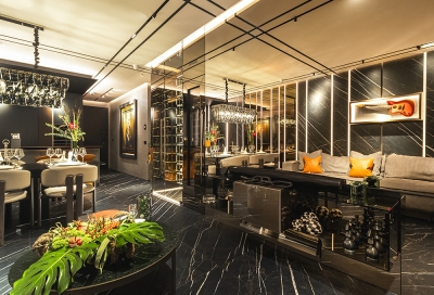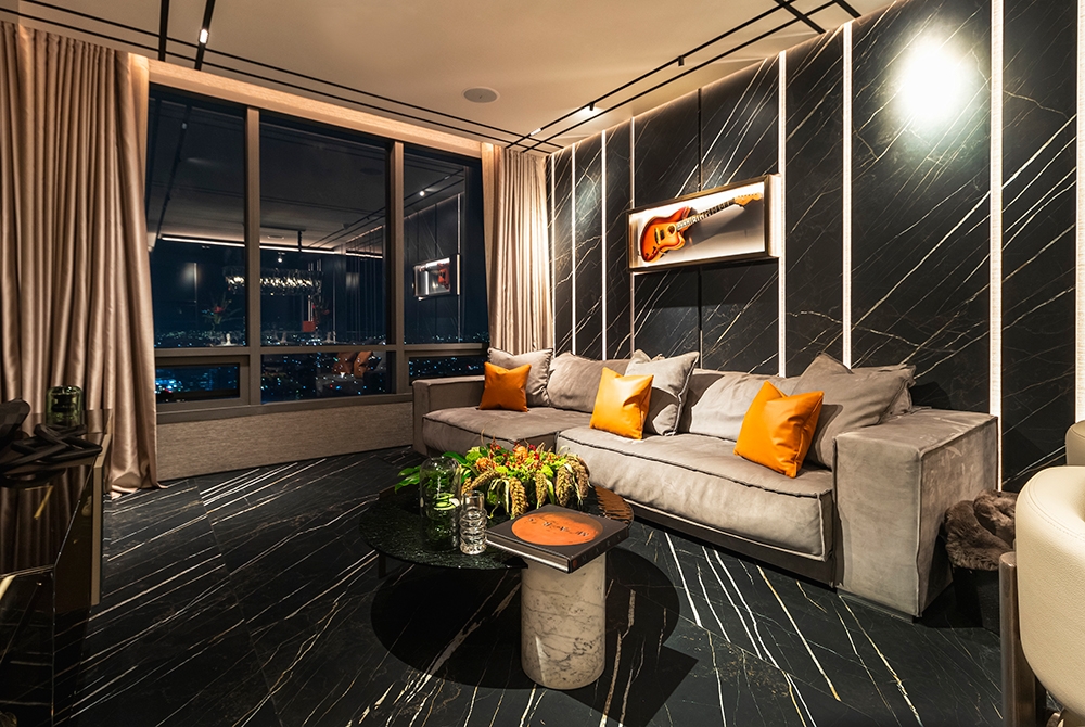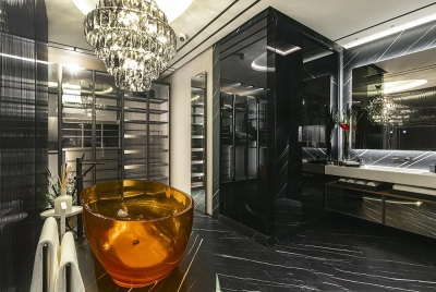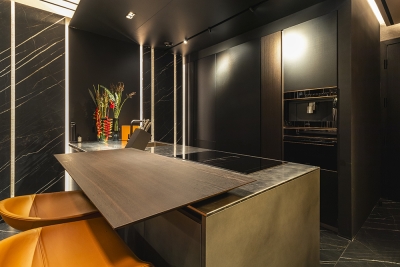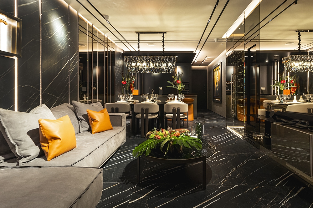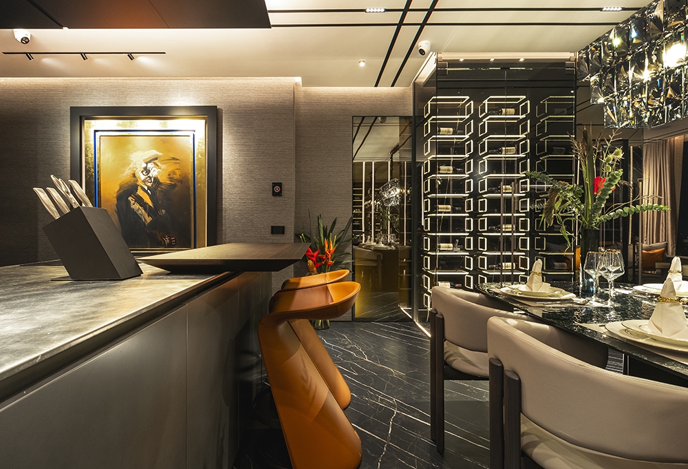Perched atop a prestigious high-rise in Mexico City, this private suite embodies a vision of masculine sophistication and Italian luxury. Conceived for a discerning single gentleman, the design juxtaposes deep, dramatic tones with vibrant orange accents—his signature color—while seamlessly integrating the client’s own art collection. Upon entry, a Coronel painting sets the tone beside a bespoke Italian kitchen with surgical-steel countertops, brushed-steel doors, and sculpted wood panels. A black-glass dining table with hand-crafted leather chairs faces a sculptural wine cellar, while the guest bath features a matte-black floating WC and a handmade orange resin pedestal basin under bold, masculine wallpaper. The living area offers a nabuck-leather sofa, mirrored bronze elements, and a floor-to-ceiling cube concealing the TV. In the bedroom, twin dressing rooms flank a Hermes-hued Italian leather bed and a smoked-glass headboard framing an orange resin soaking tub and a smoked-glass shower cube. Every surface and detail elevates the suite to timeless, understated opulence.