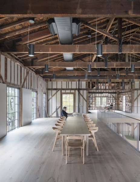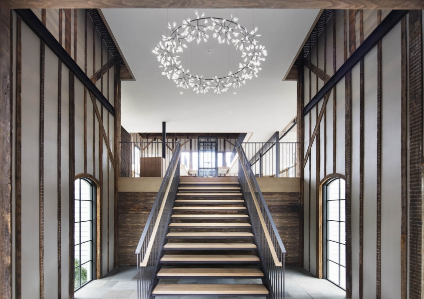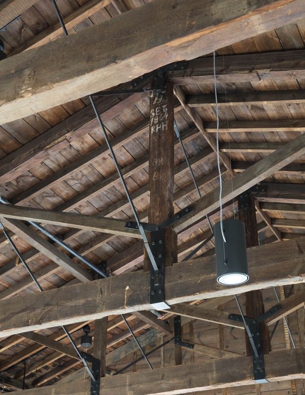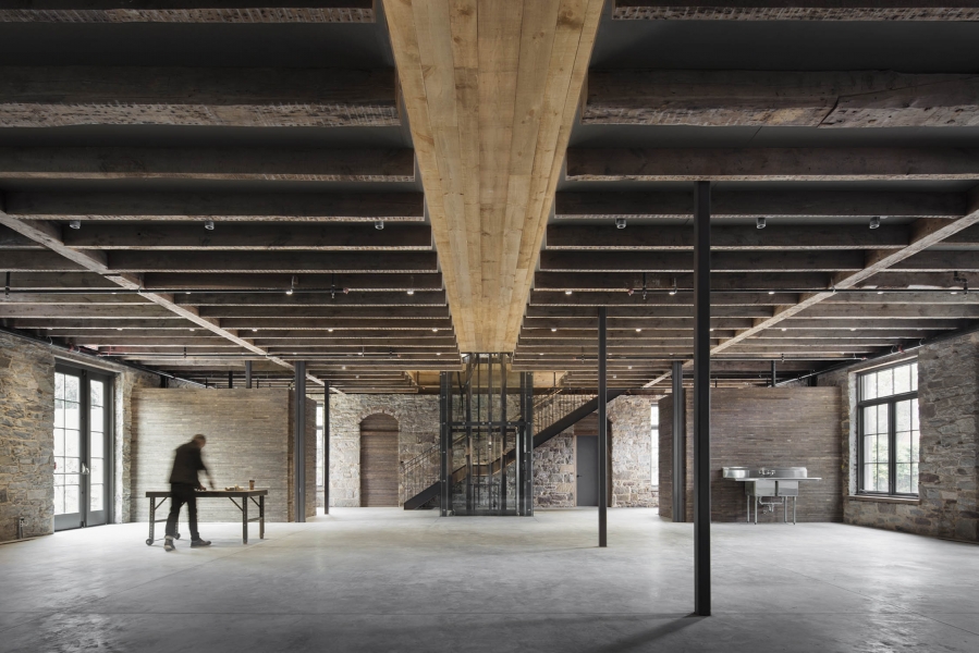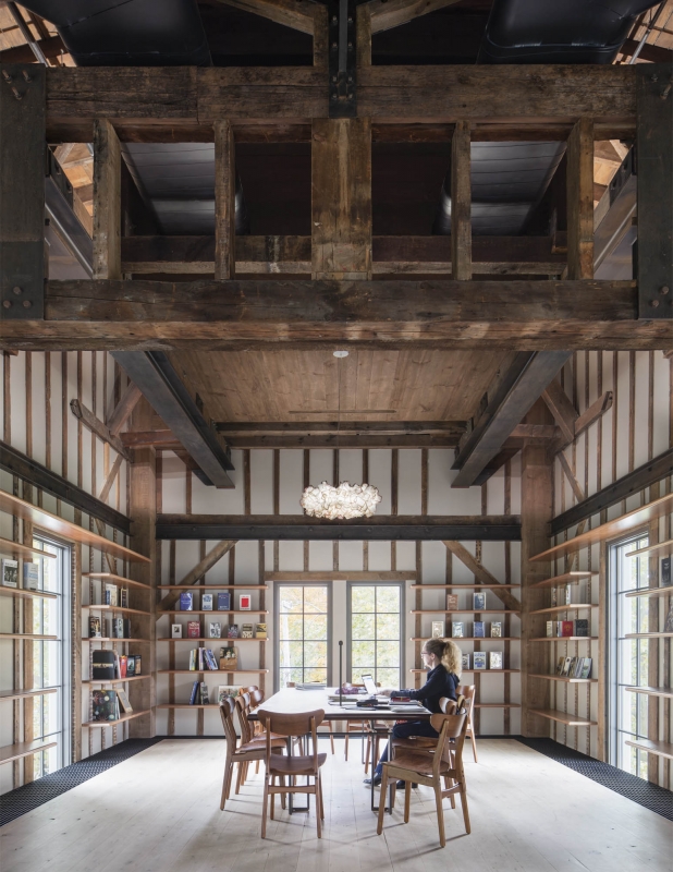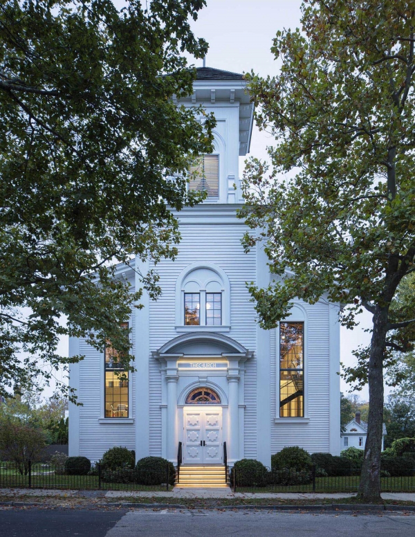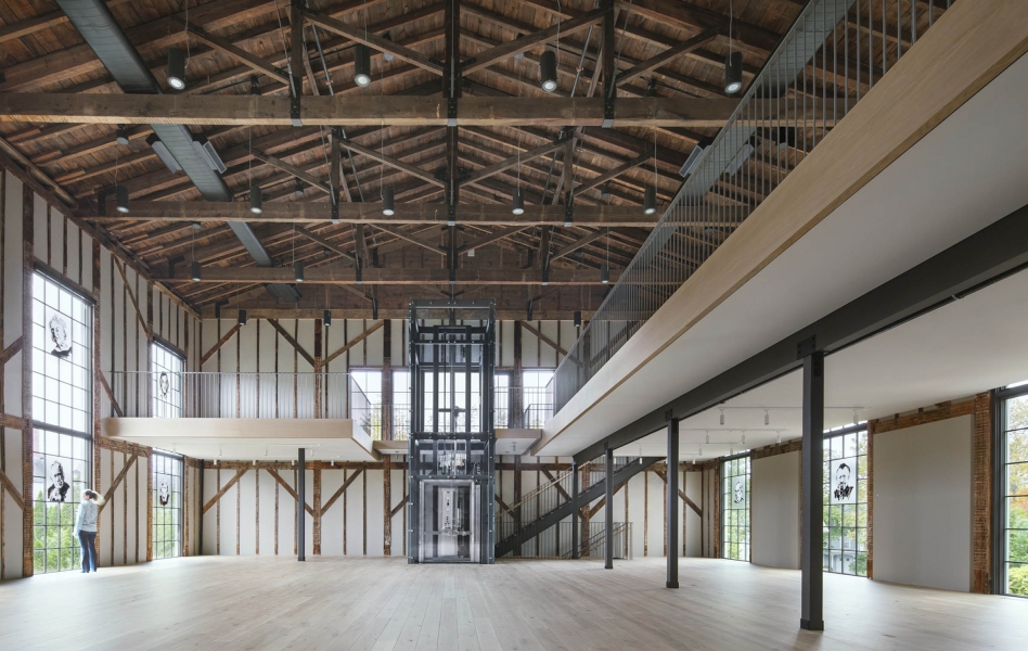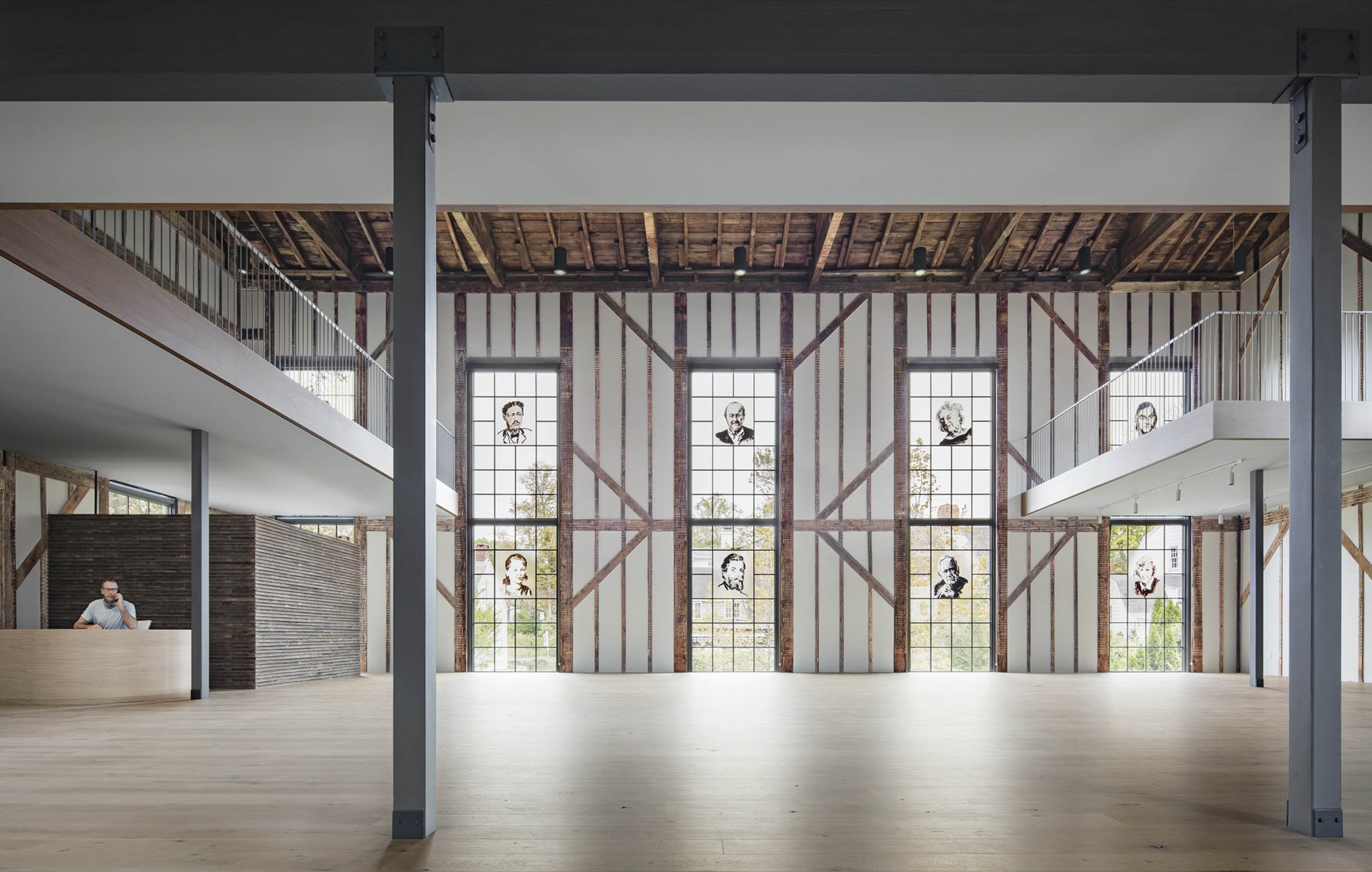 The Church is an adaptive reuse project that returns a once-shuttered 1836 Methodist Church back to the community as a vibrant arts center. The reimagined facility features an artists-in-residence program with accommodations, flexible studios, galleries, a resource library, and public garden. The building's exposed wood framing sets up a compelling dialogue between past and present, allowing for the sublime geometry of the original structure to emerge in dramatic relief. Portraits of local artists, painted by our client Eric Fischl, are mounted on the windows, acting as modern versions of stained glass. Surrounded by 22-inch-thick stone masonry walls, the ground floor has been transformed into studio space with new spatial volumes clad in reclaimed wood lath. The main floor, accessed through the restored east façade entry, retains much of the processional sequence from its time as a sanctuary. Upon entry, visitors encounter the dramatic double height exhibition hall beyond, drawing them into the experience. The mezzanine level, a slender plane floating above the main floor, is clad in pale white oak finishes. A glass elevator and minimal steel and wood stairways connect all levels.