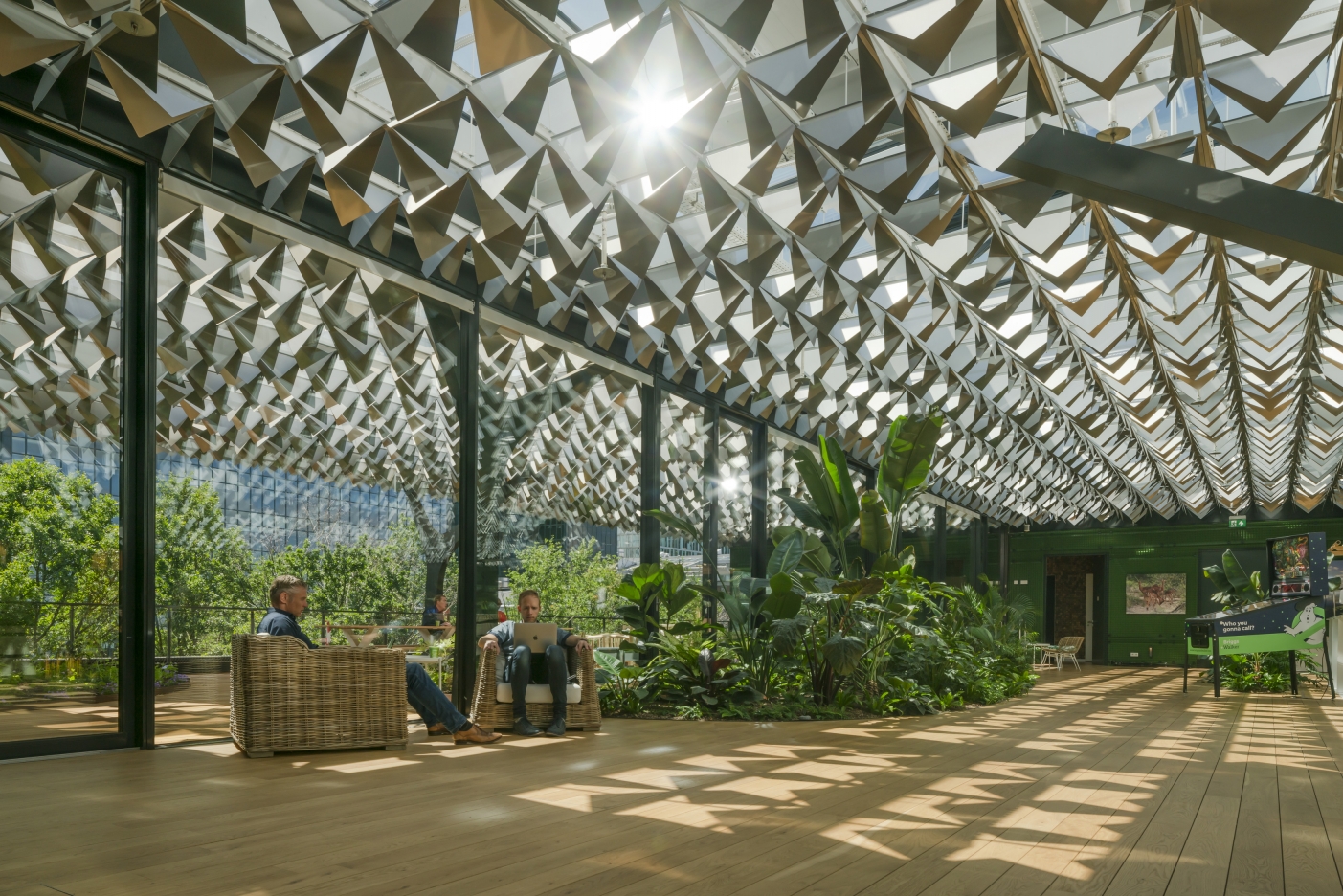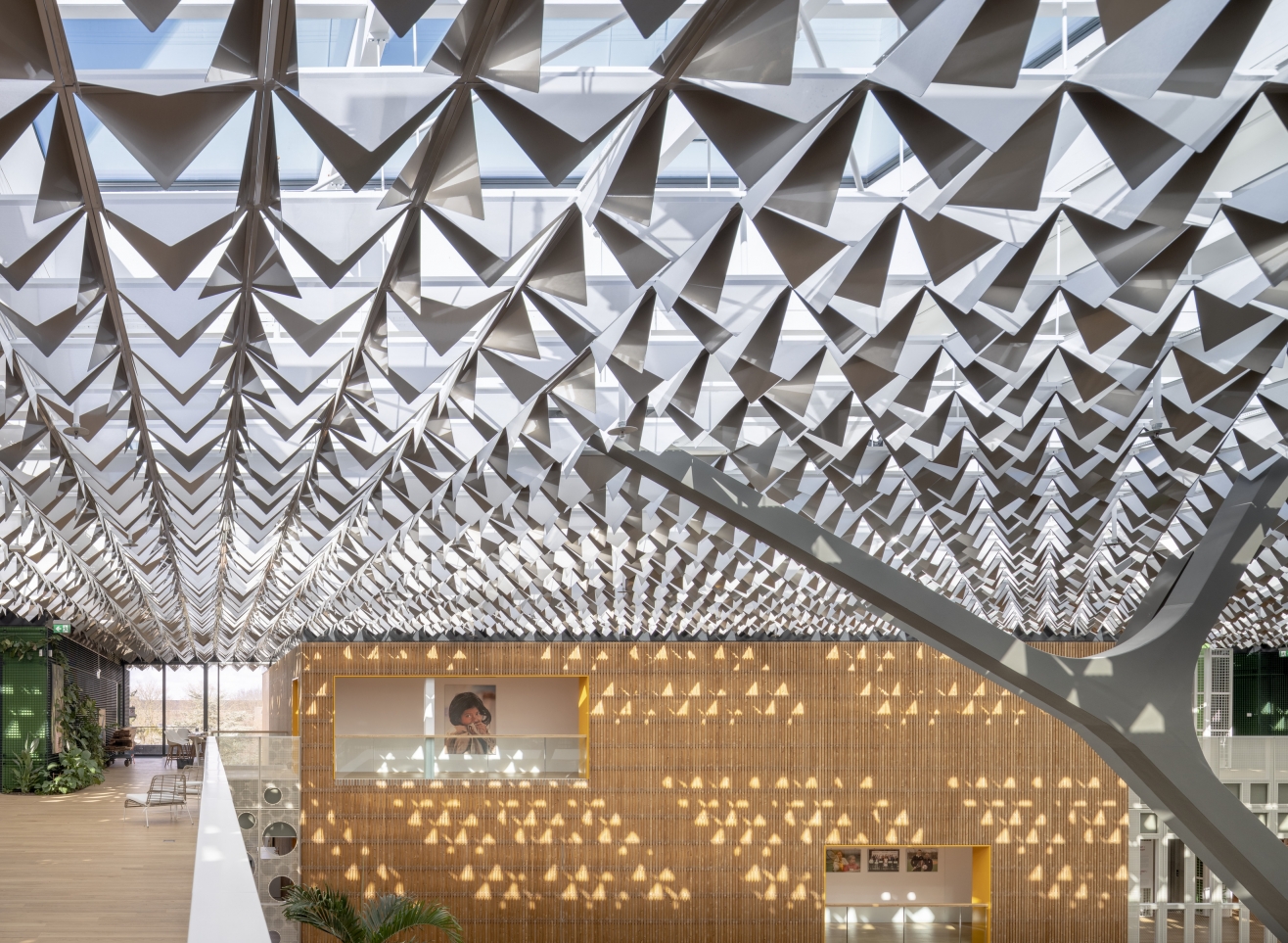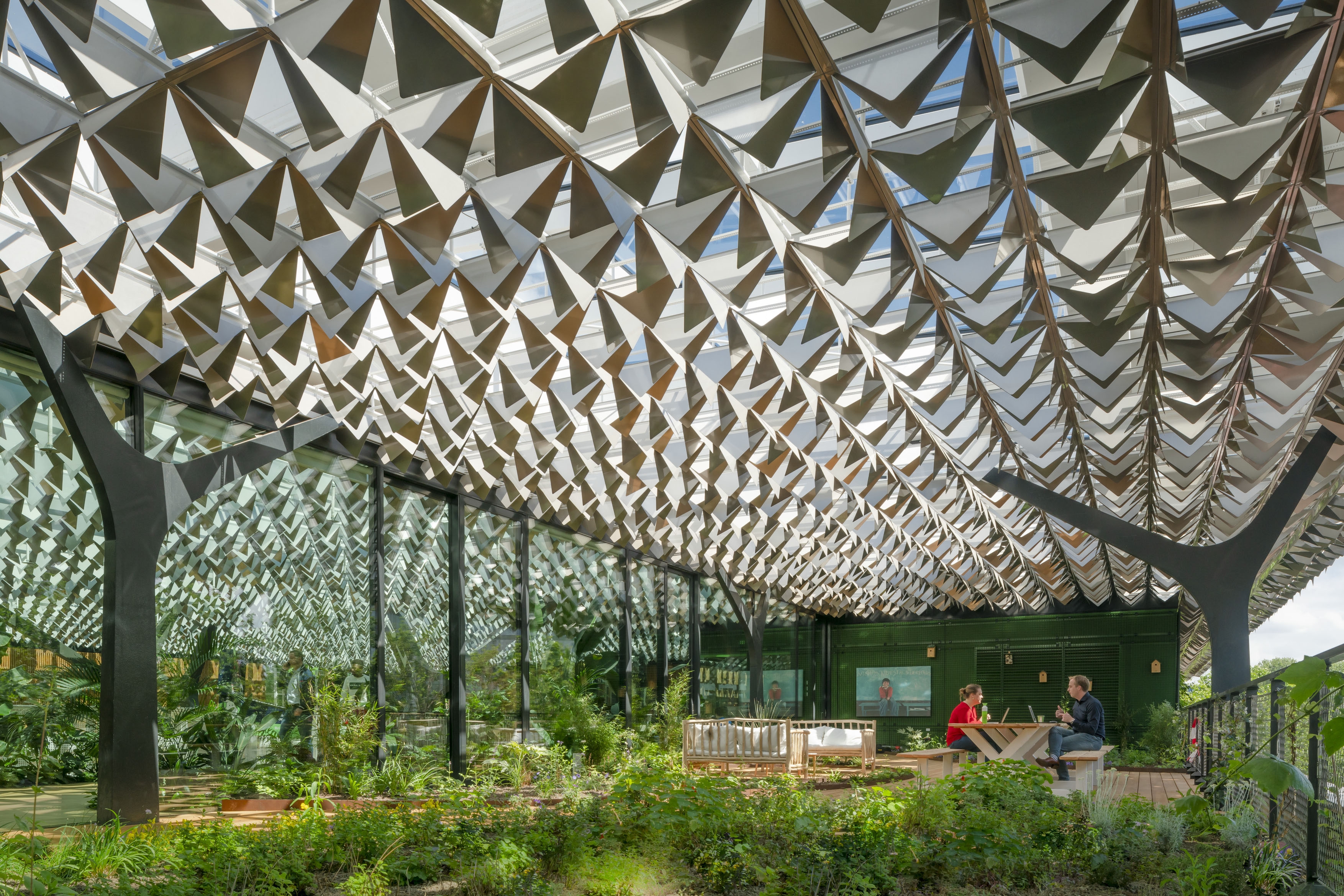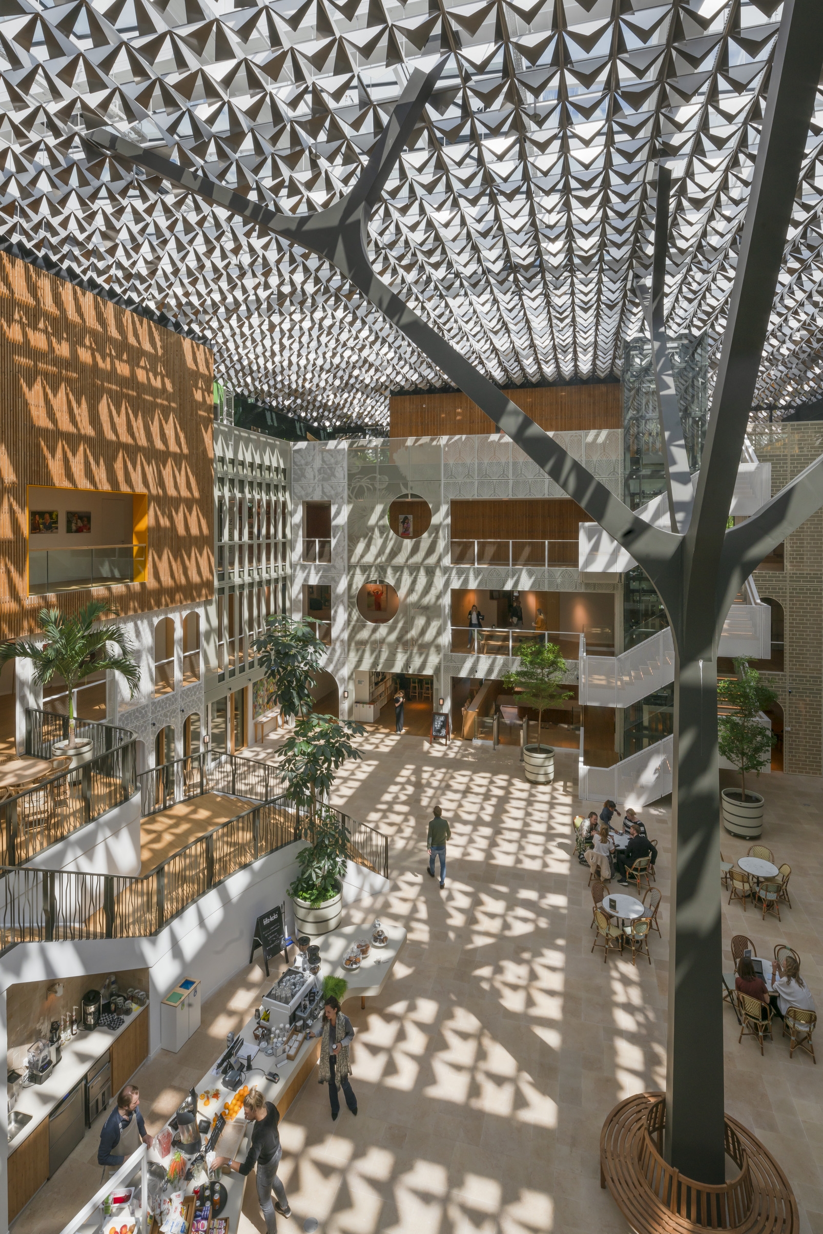 The greenery at the old locations in the park are represented in the roof and its construction. The canopy is supported by tree-like columns and holds the PV cells. The roof is made of polished aluminum ‘leaves’ that create a beautiful dappled effect on the walls and floors, reminiscent of an actual walk in the forest.